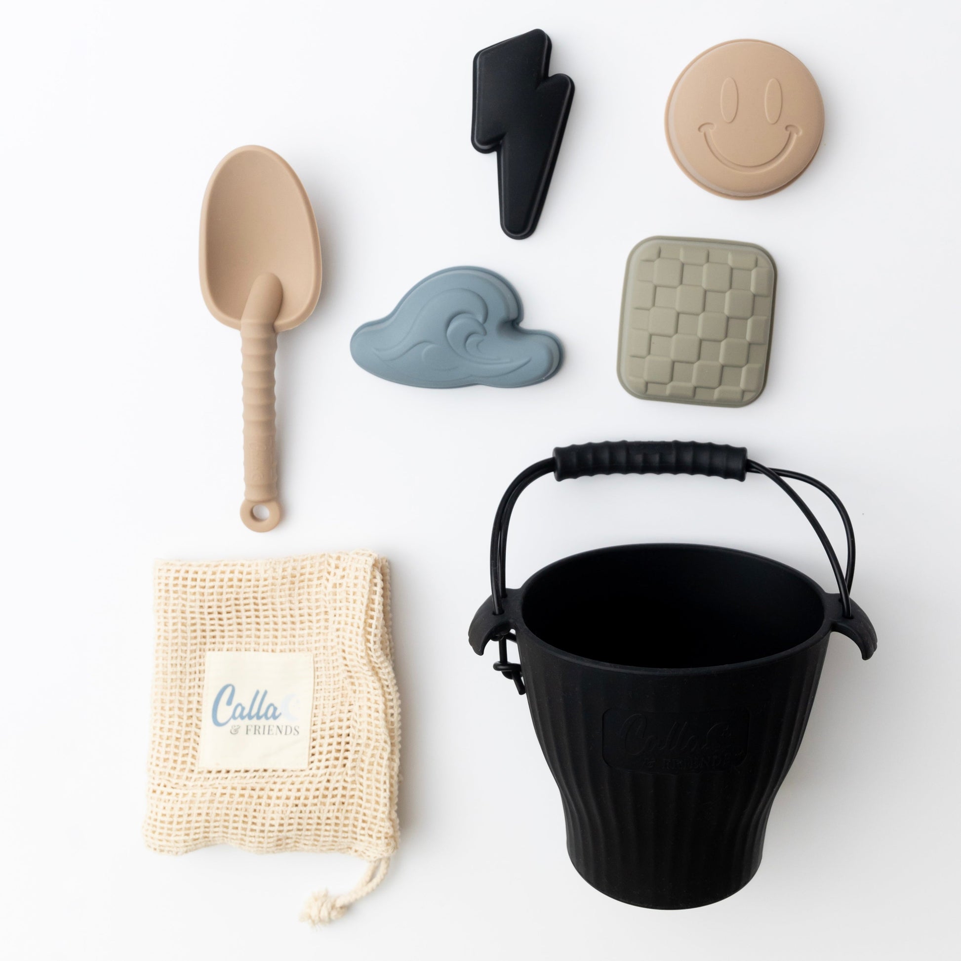 Each set includes: 1 bucket, 1 small shovel, 4 sand molds & an organic cotton storage bag