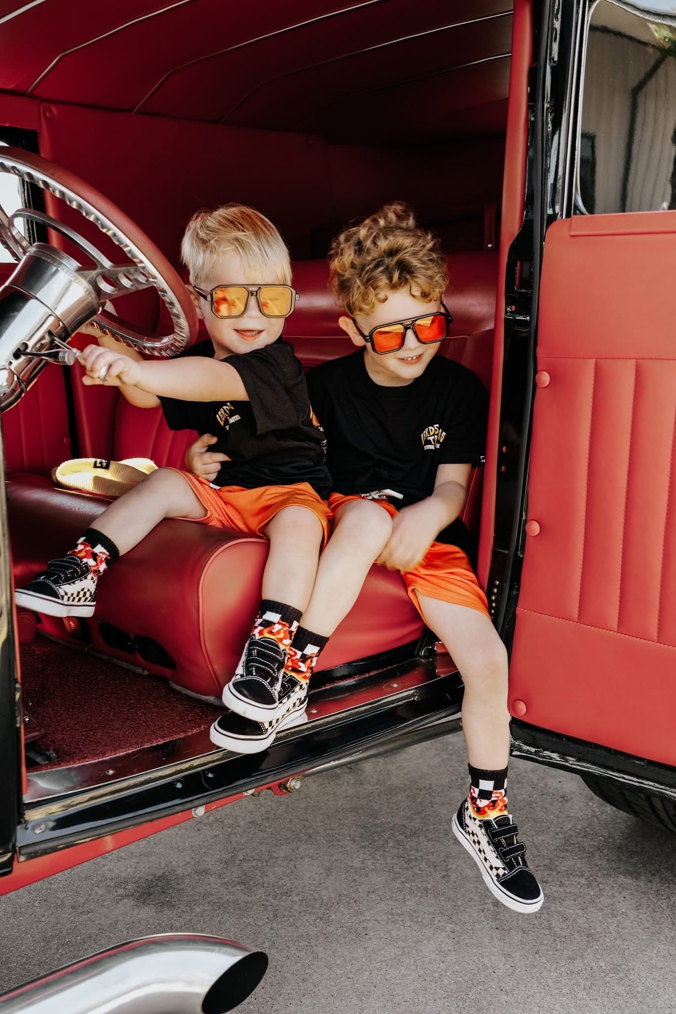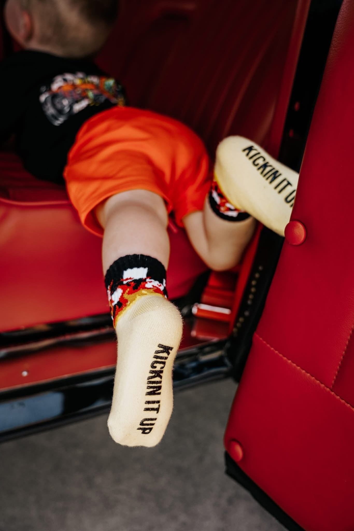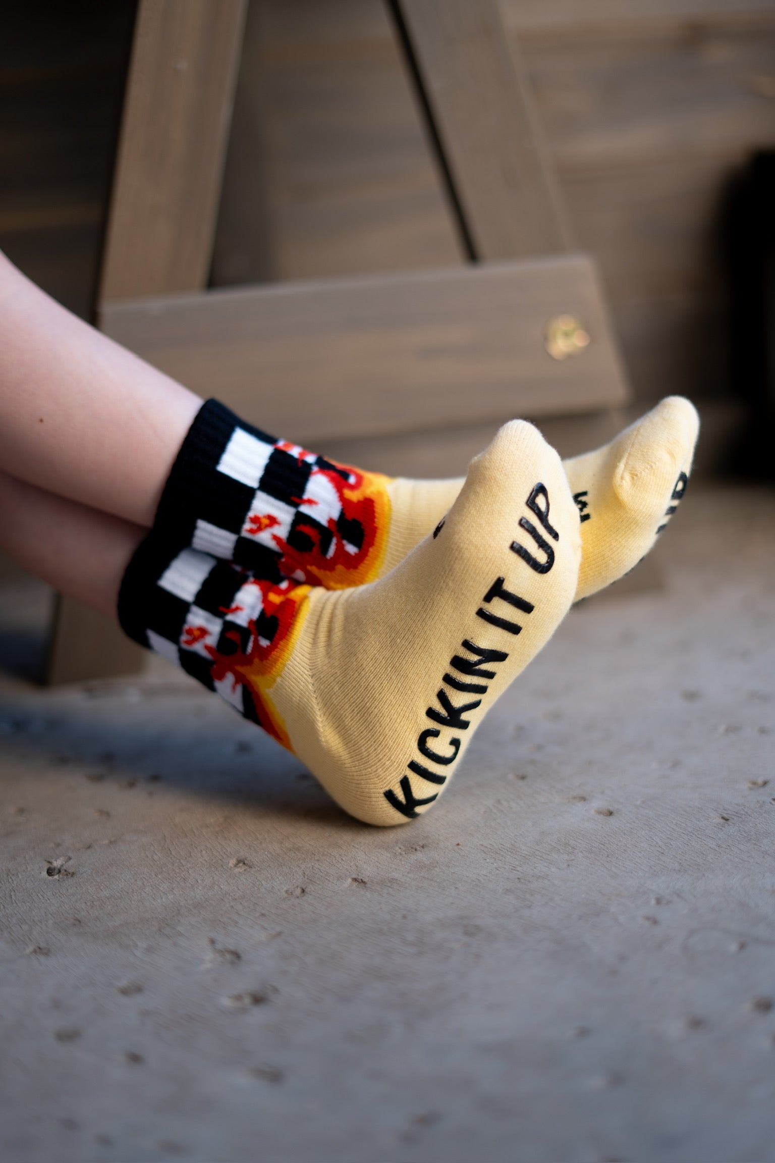Sizes Infant, Extra Small, Small, Medium have logo grips on the bottom of the feet large have a stitched logo on the bottom of the feet.