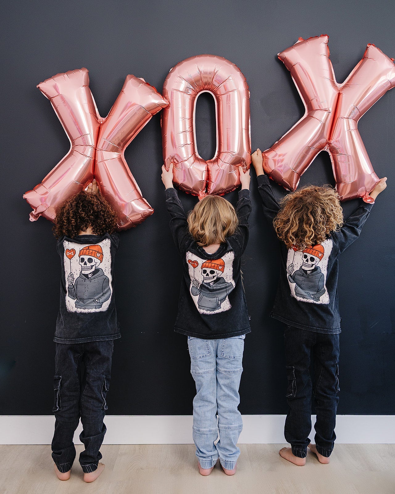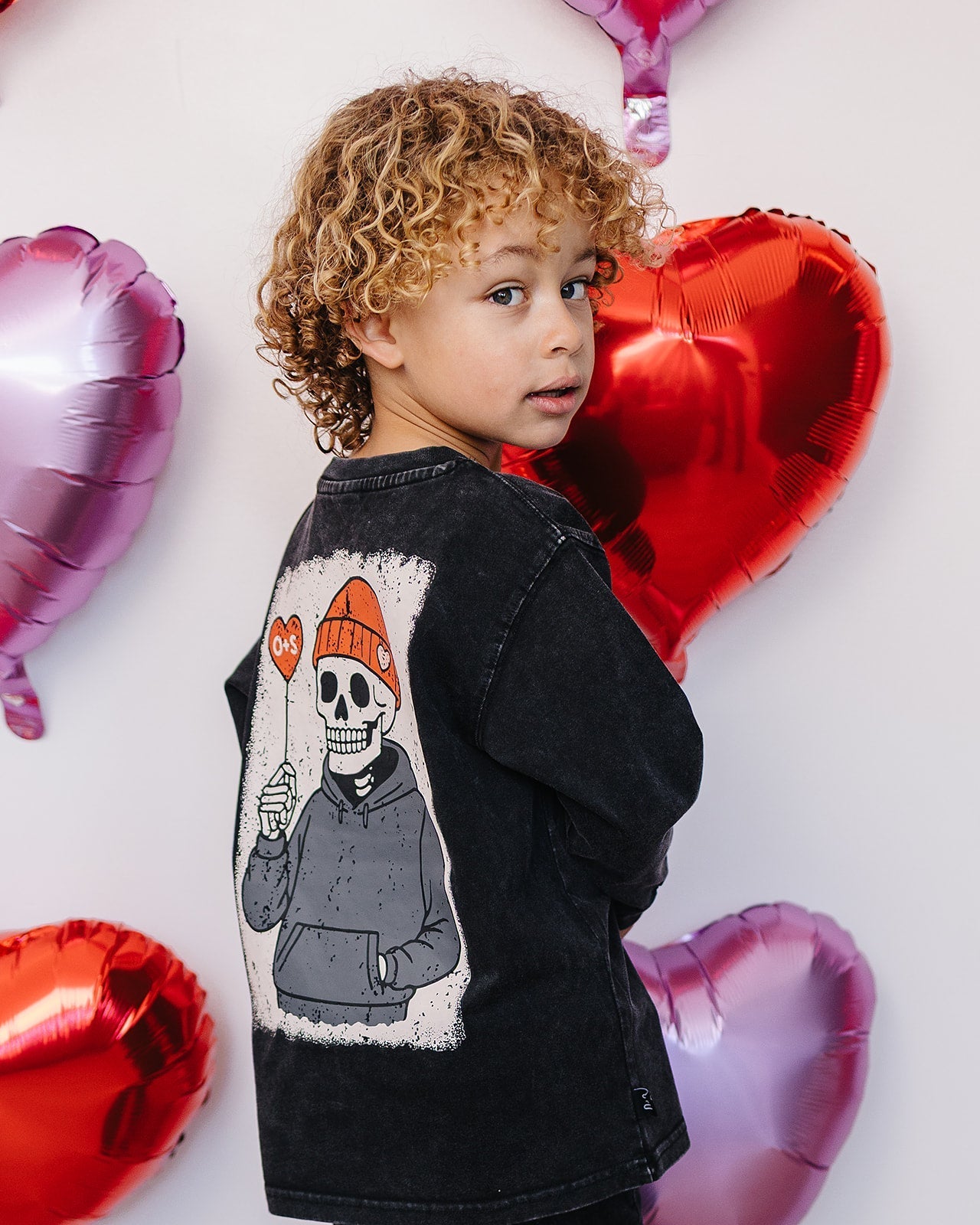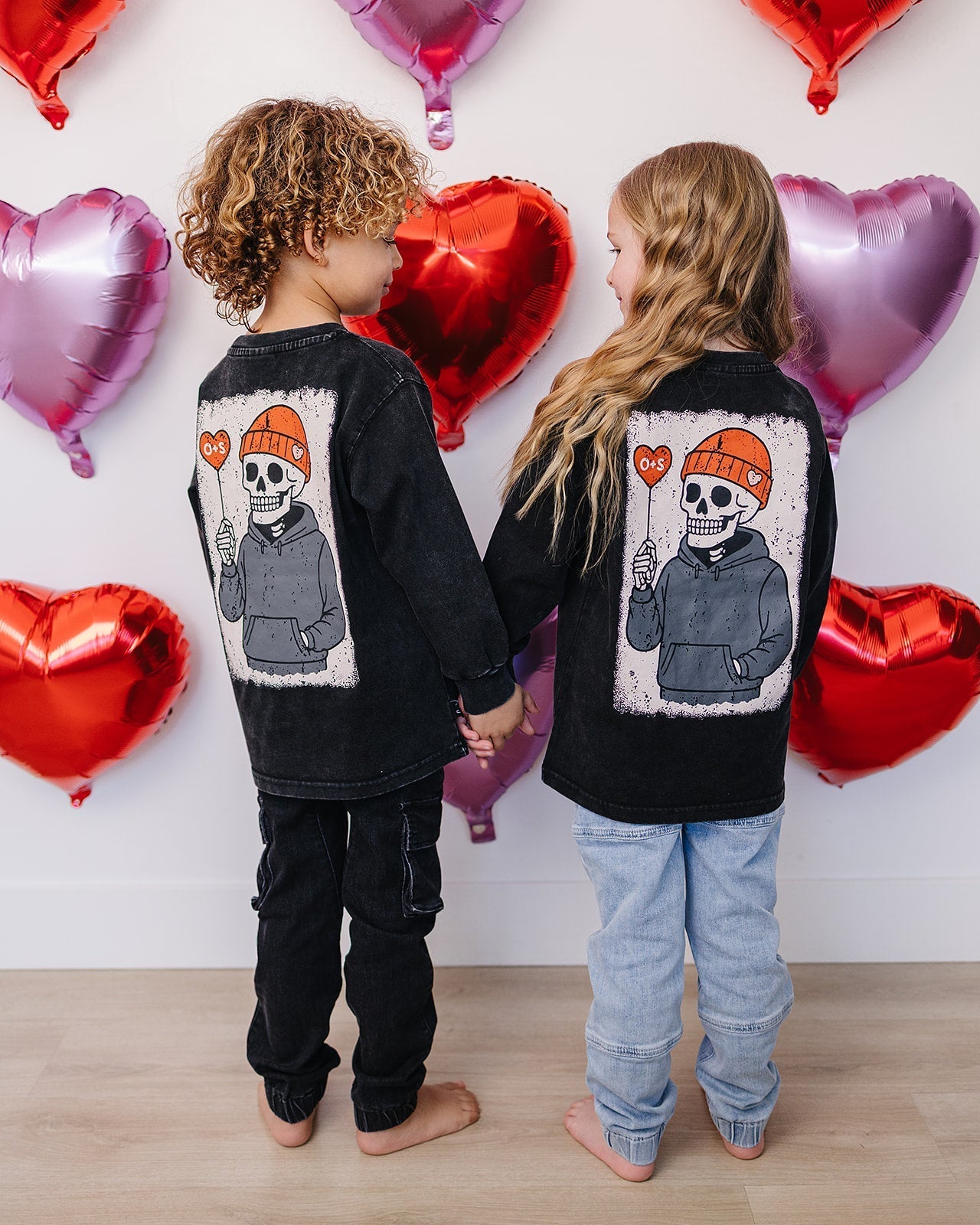 No bones about it, your little one is going to love this tee! A lovable skeleton graphic graces the back while our O+S heart takes center stage on the front. The distressed fabric delivers that perfectly soft, authentically worn-in comfort your child will want to live in. It's the kind of shirt that feels like it's been a favorite forever—quirky, cozy, and undeniably cool.