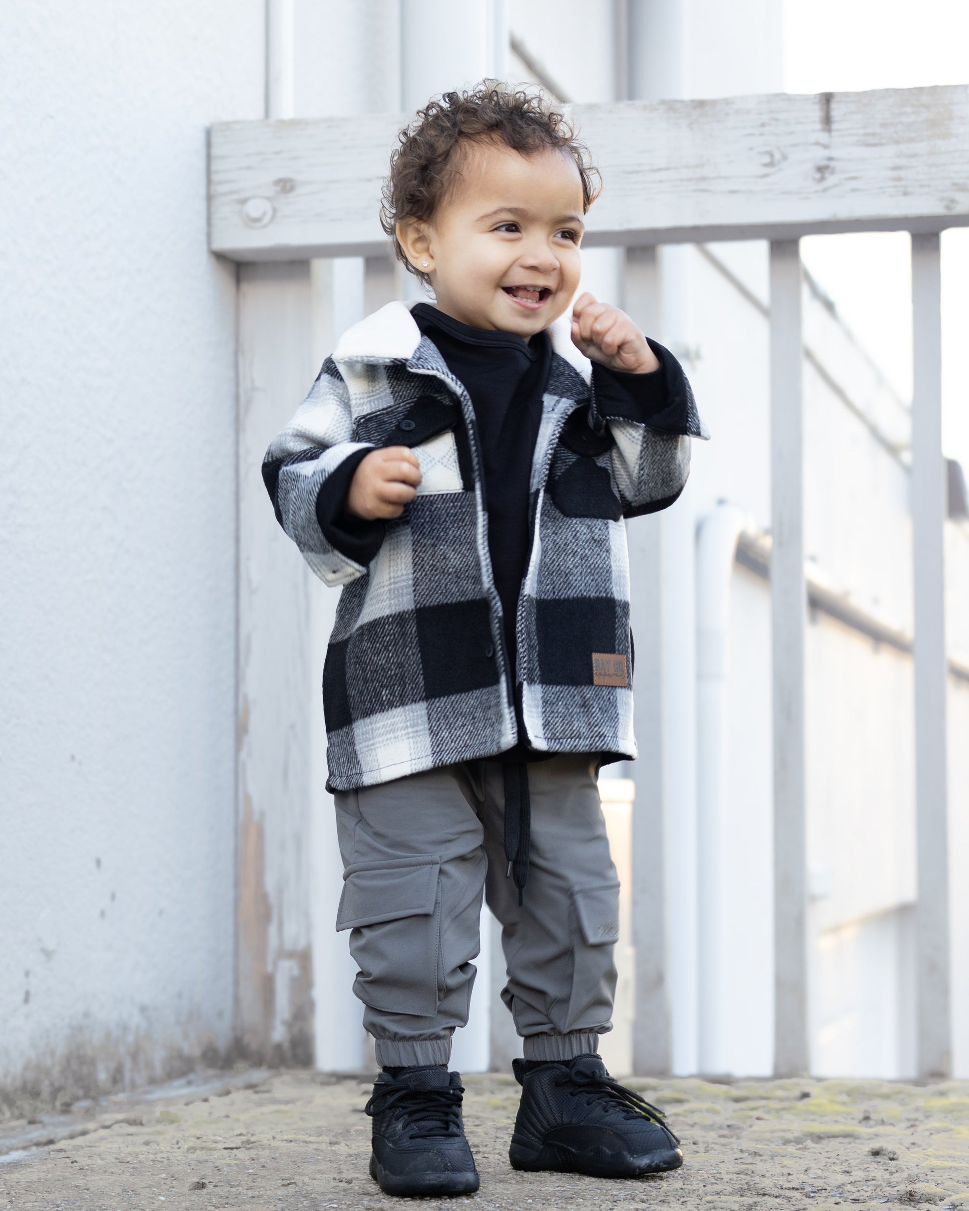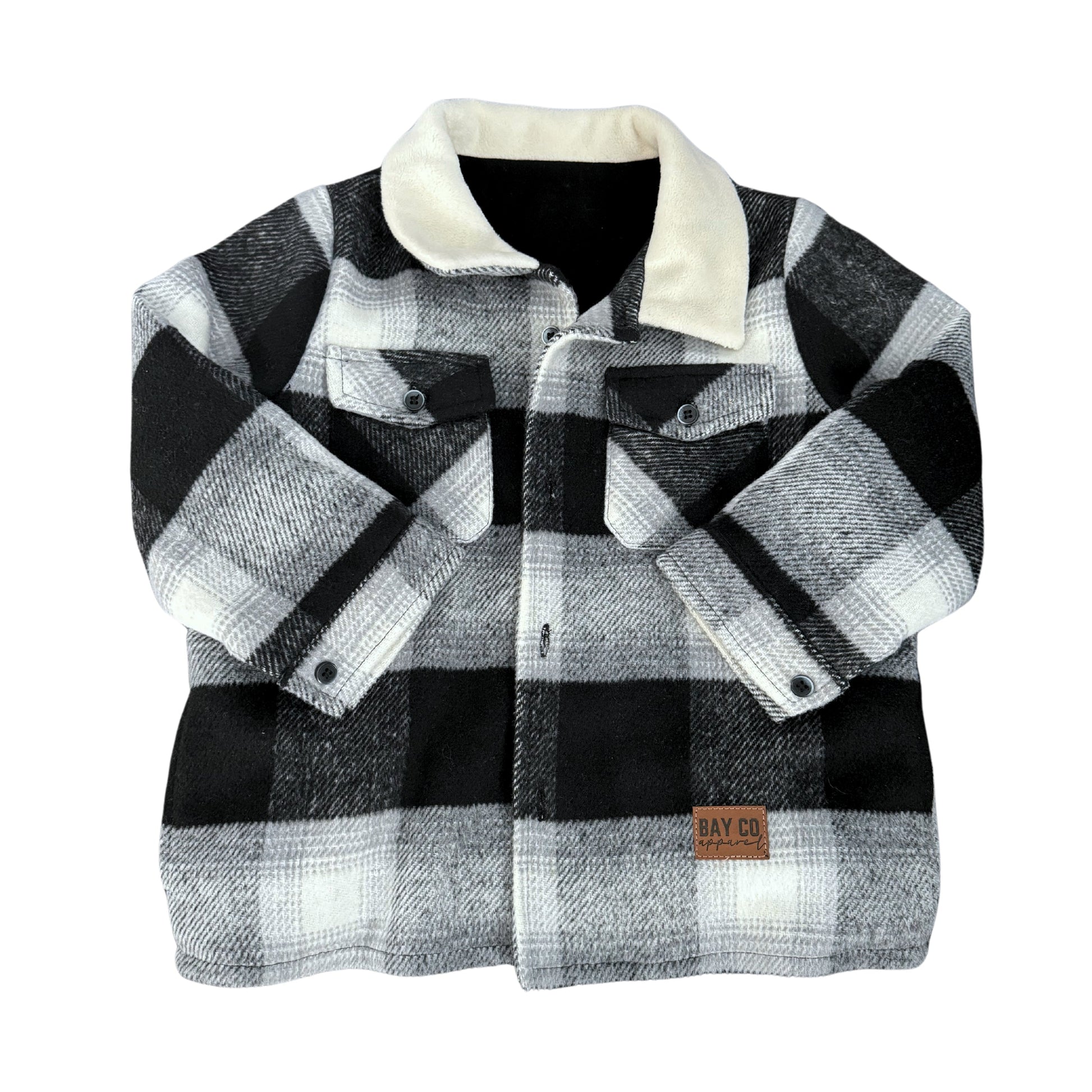 Polyester blend making this an ultra-soft, flannel jacket with a bamboo lining. Super soft Sherpa collar. Finished with snap buttons for easy bundling!