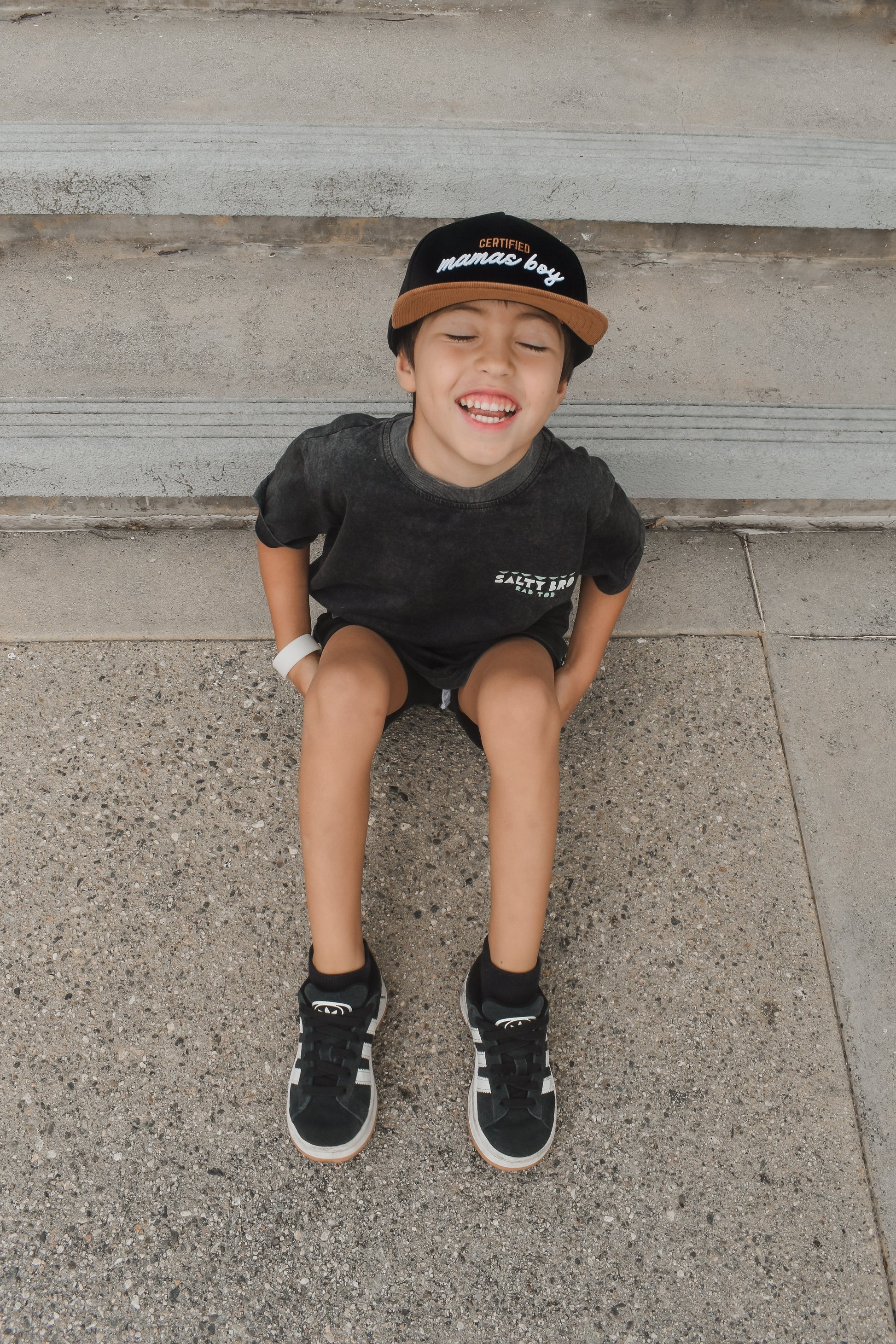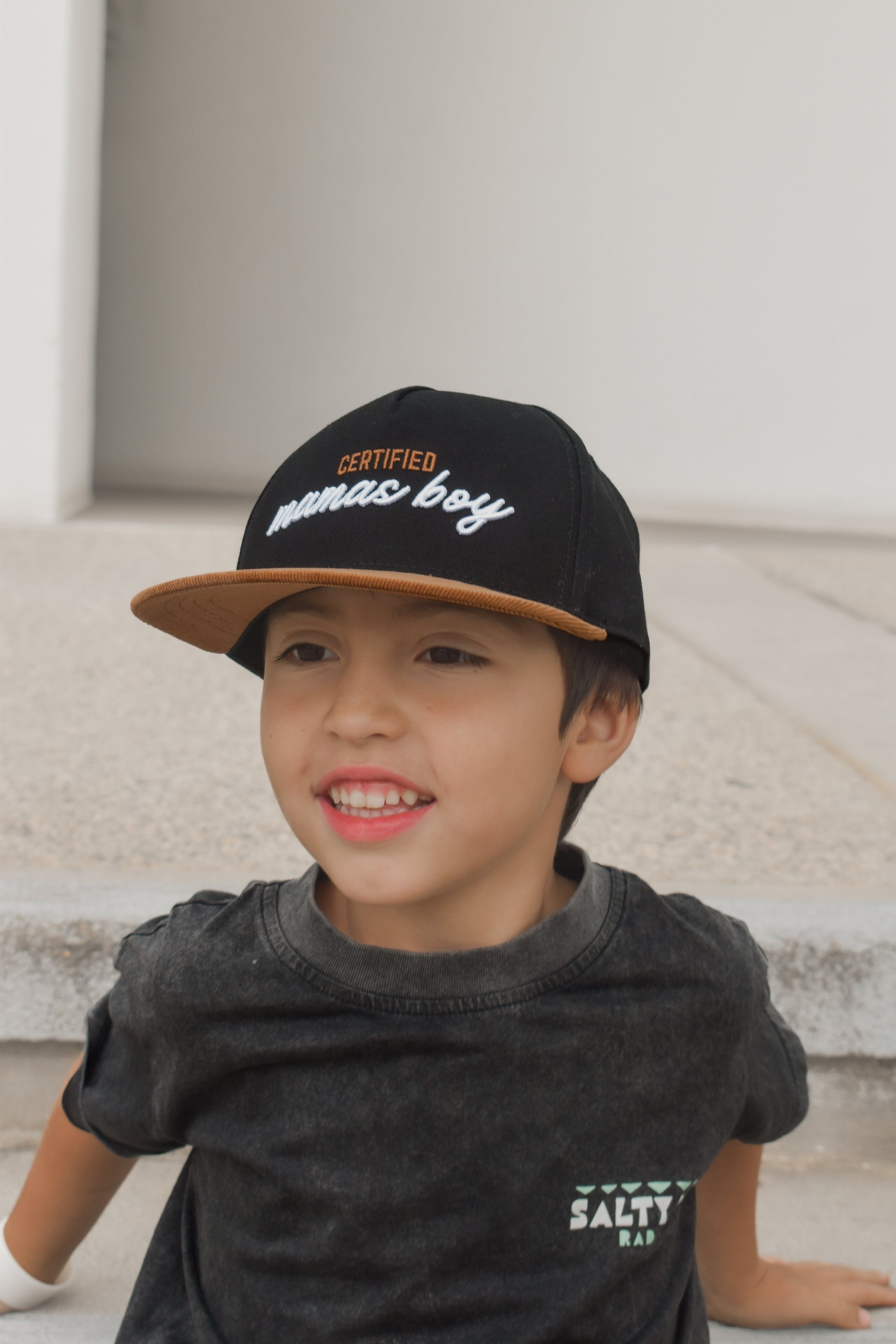 Proof that mama's favorite dude has style. Our best selling Certified Mama's Boy snapback is back in a bold new black color-way with a cool brown corduroy brim. This toddler hat features high-quality embroidery, an adjustable snapback for a perfect fit, and just the right amount of attitude. Wether he's cruising in the stroller or ruling the playground, this hat is built for rad little dudes who wear their mama love loud and proud.