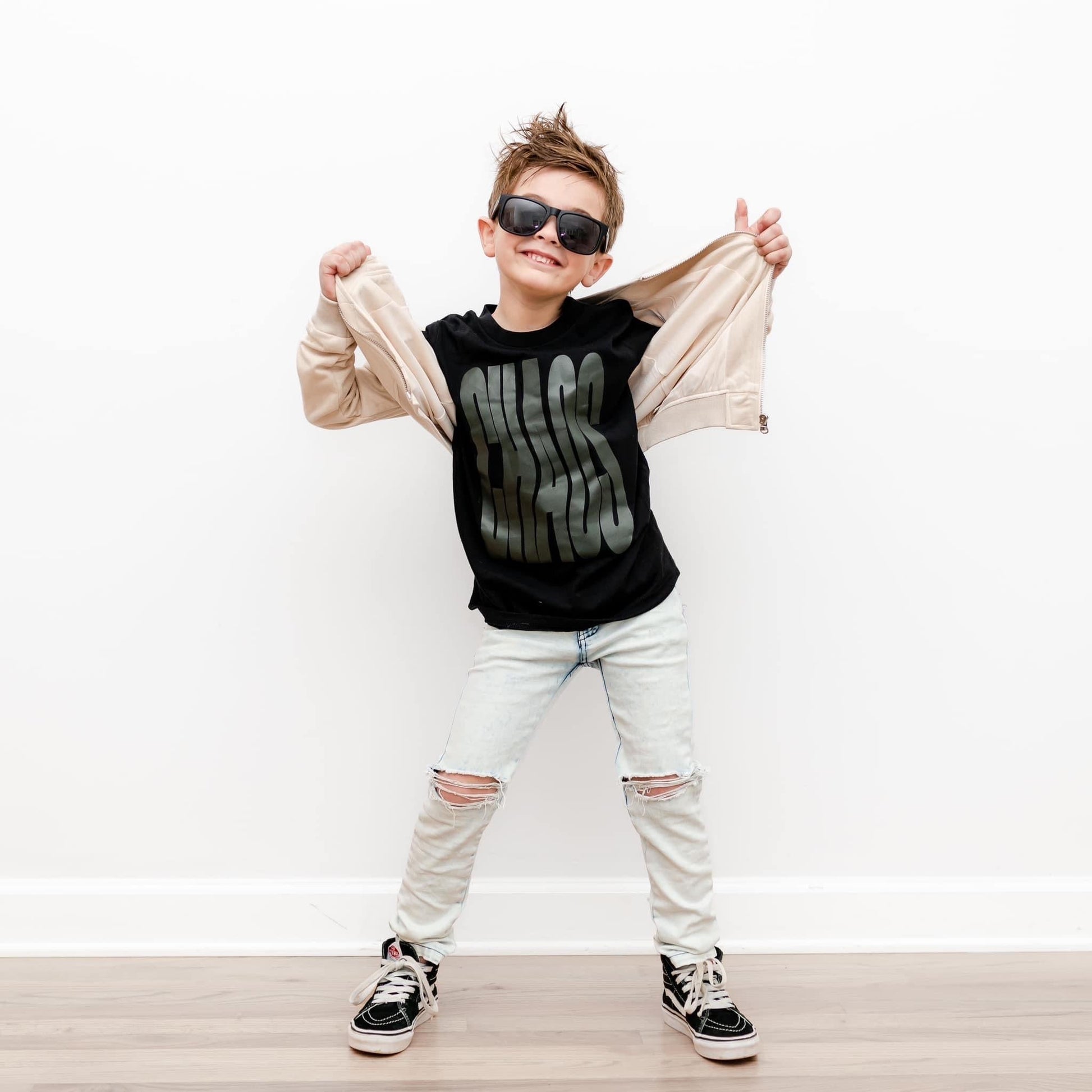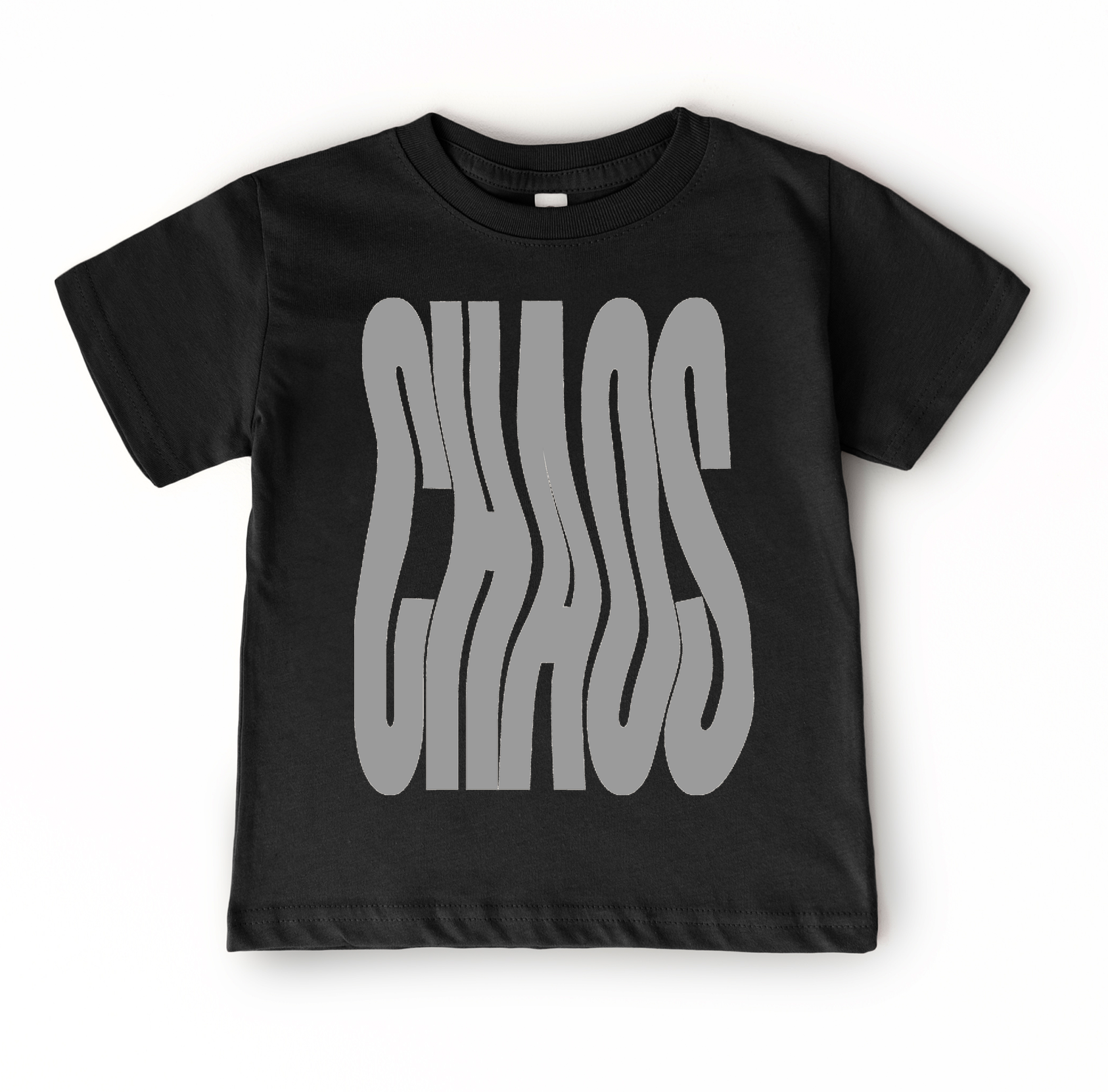 Our Chaos kids graphic tee is the ultimate statement shirt for toddlers and youth who live loud and move fast. Featuring a bold wavy text design on a classic black tee, this trendy streetwear-inspired shirt is made for cool everyday outfits.