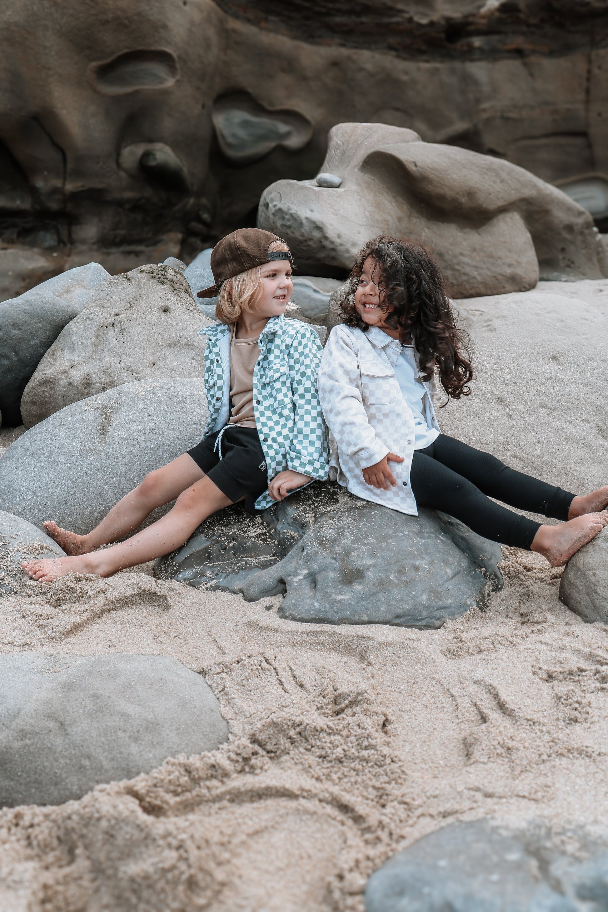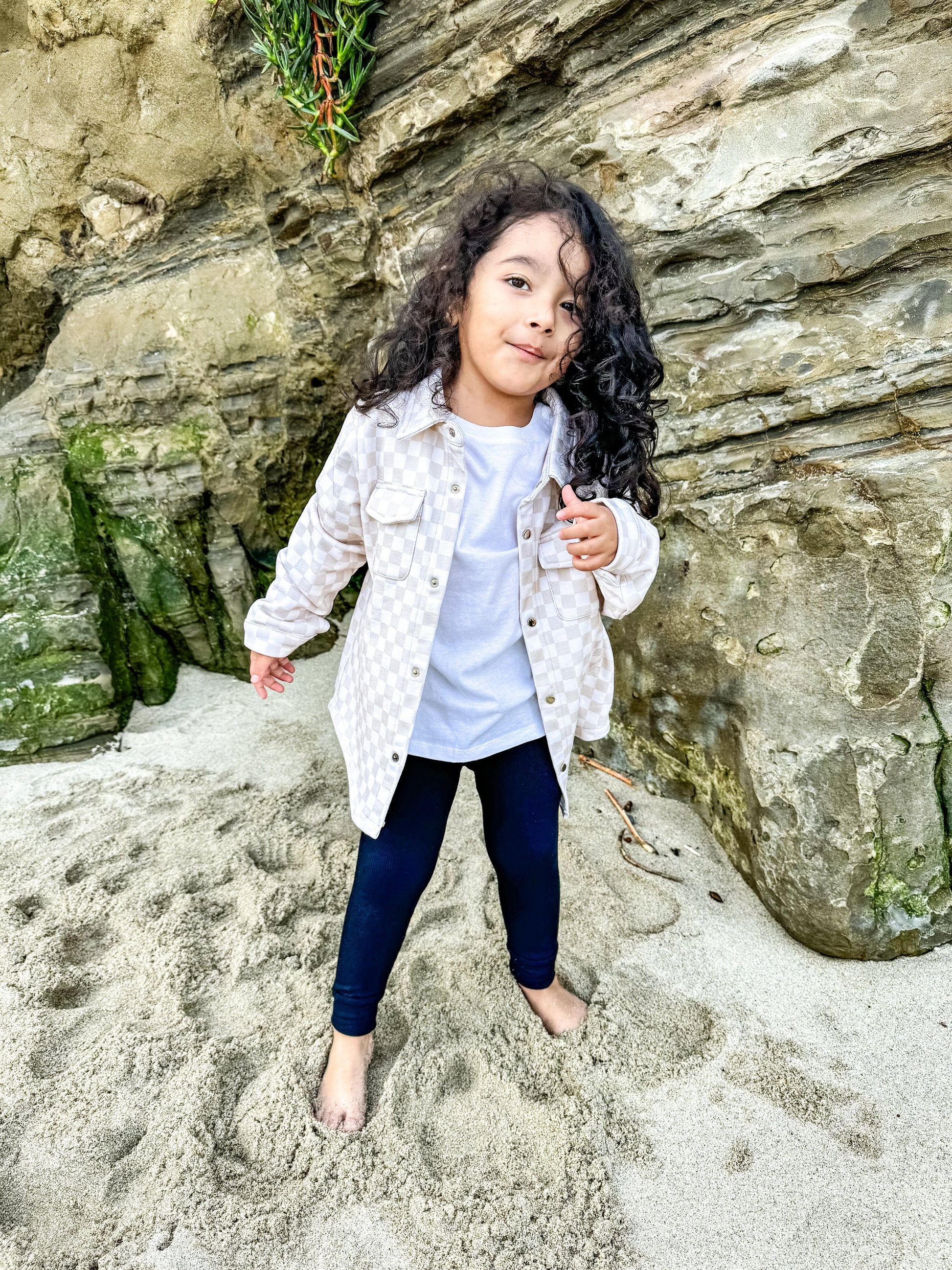Cotton, medium weight and slightly oversized. The perfect drop cut and spring essential! Available in a refreshing green and neutral beige. Finished with sewn buttons.