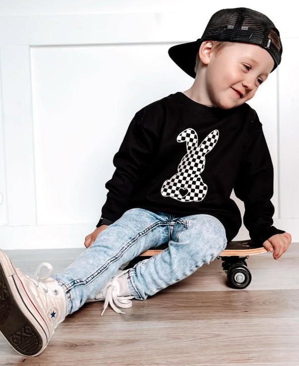 Meet your new favorite trendy Easter sweatshirt for boys and girls. This black kids pullover features a bold checkered bunny graphic for the perfect mix of cool and festive. Designed with a modern, skater-inspired style, this sweatshirt is ideal for toddlers and youth who love standout spring outfits.