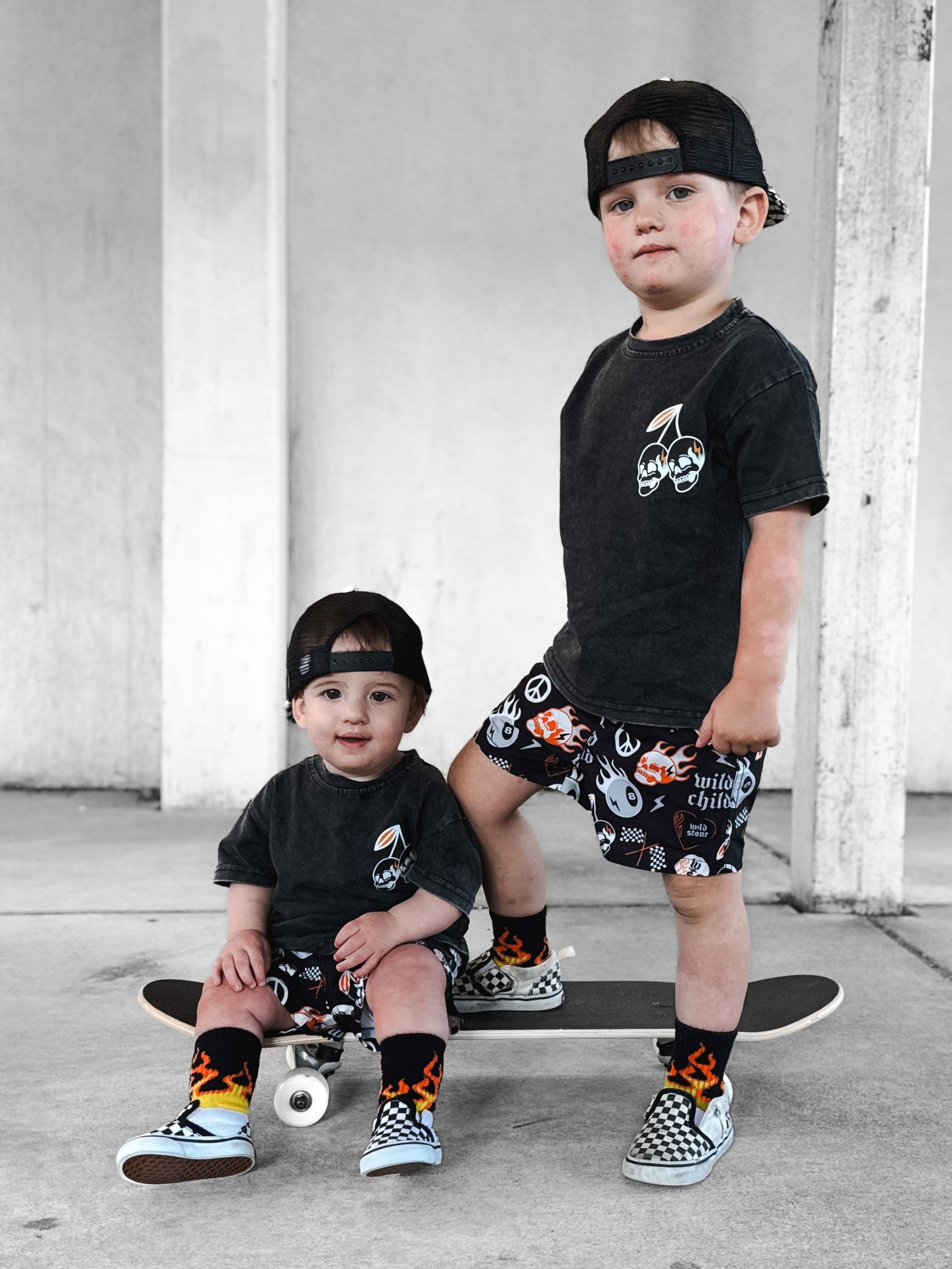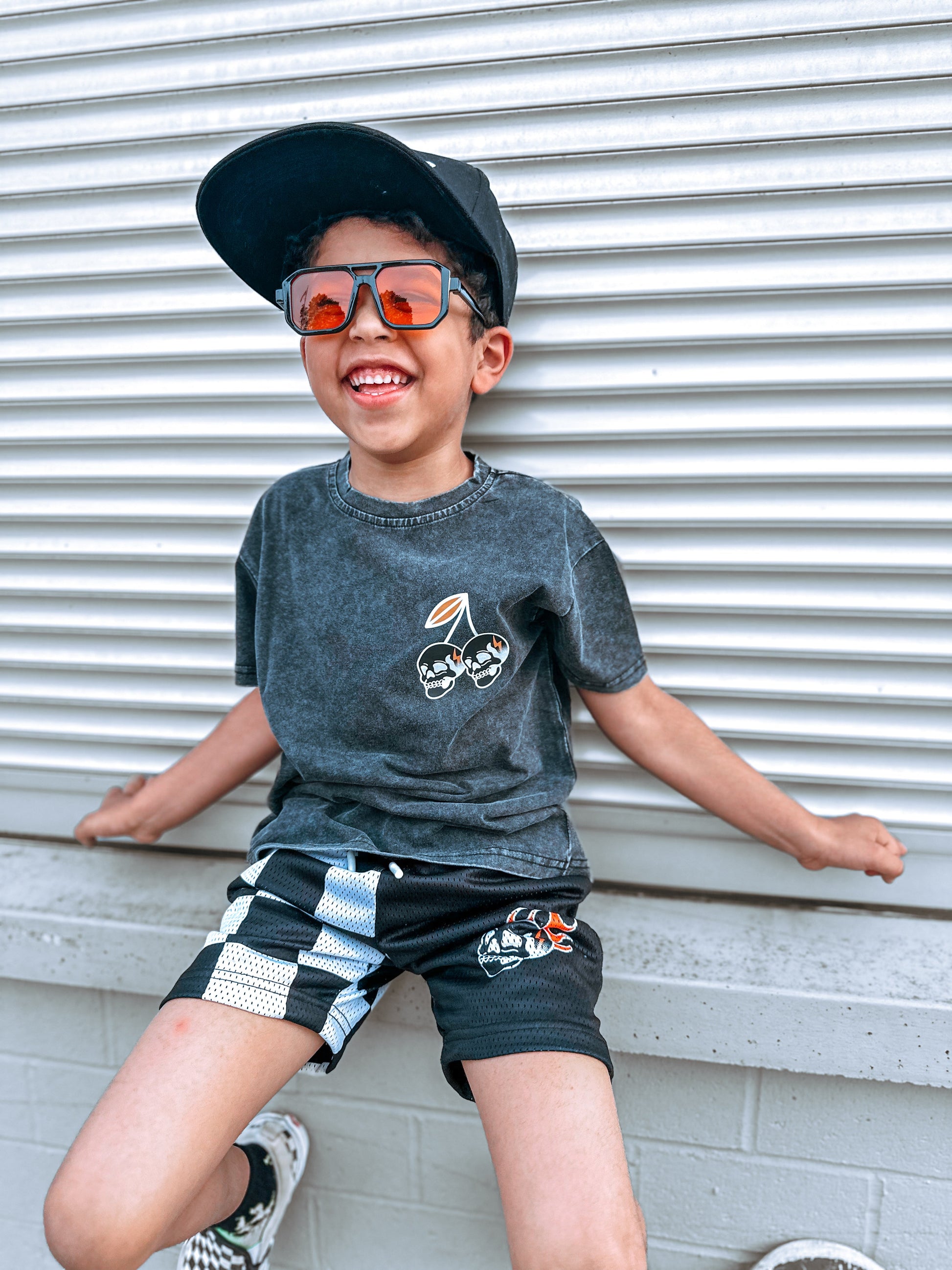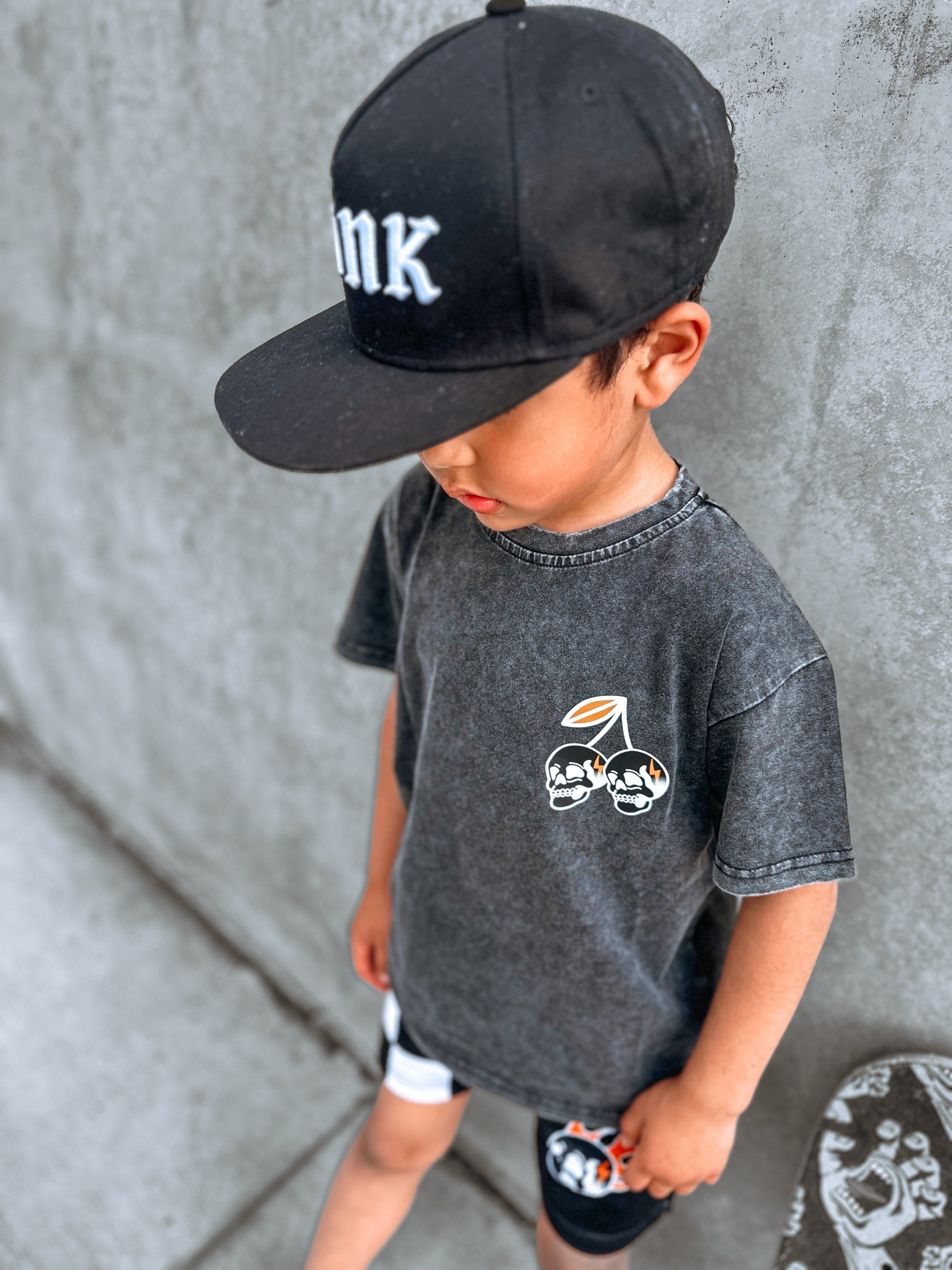 Introducing our Black Acid Wash Tee, featuring our iconic cherry skull logo on a tee that's been washed to perfection! This tee is edgy, stylish, and perfect for any kid looking to make a statement.