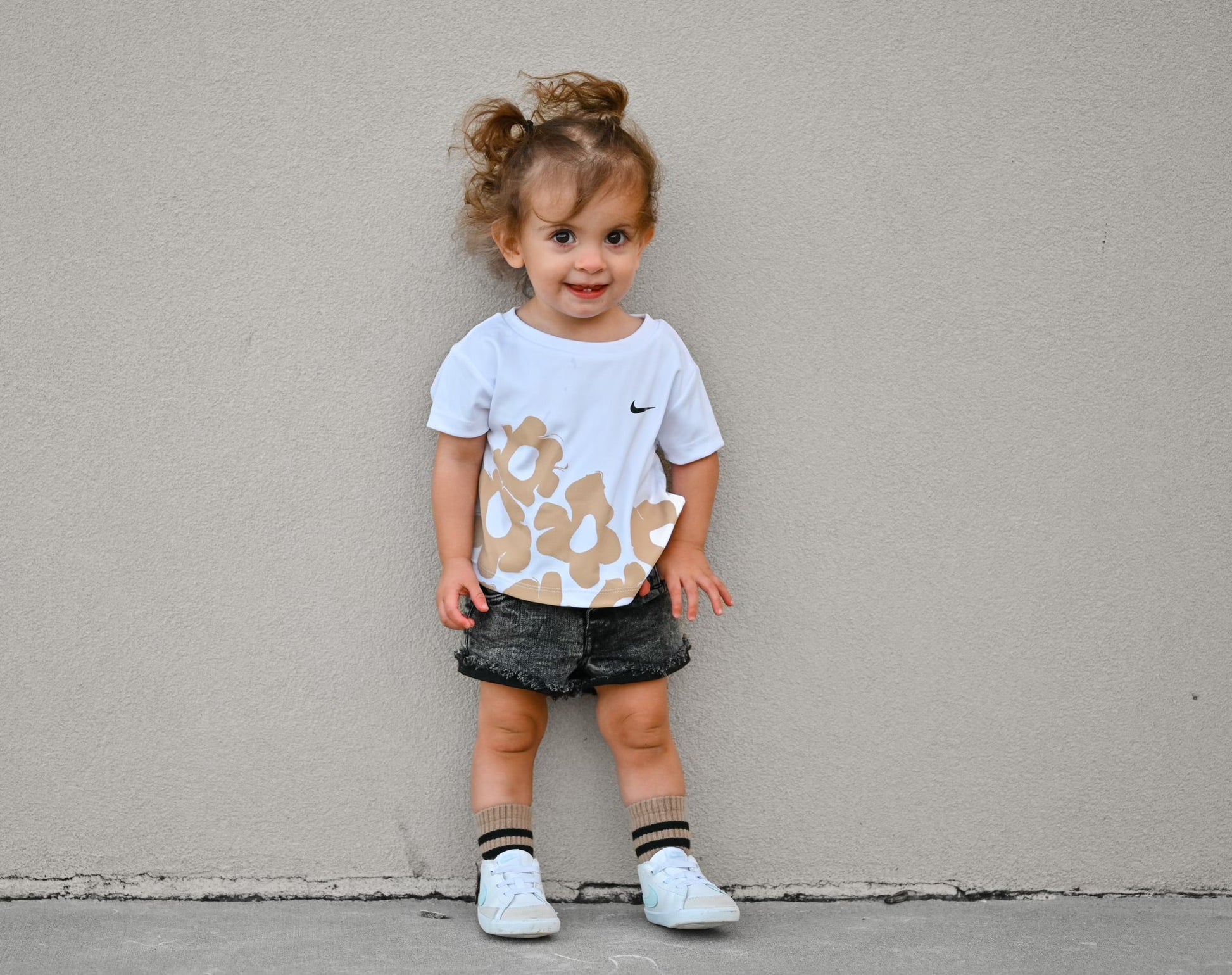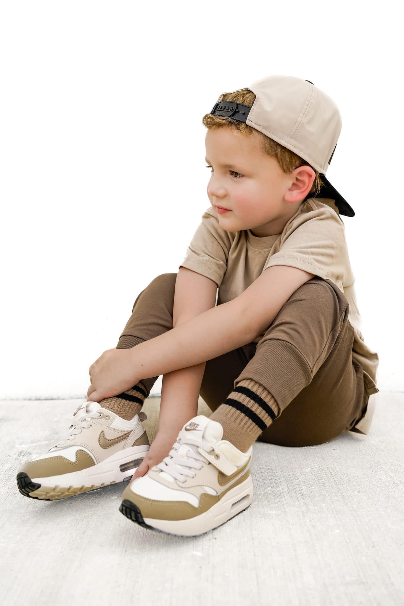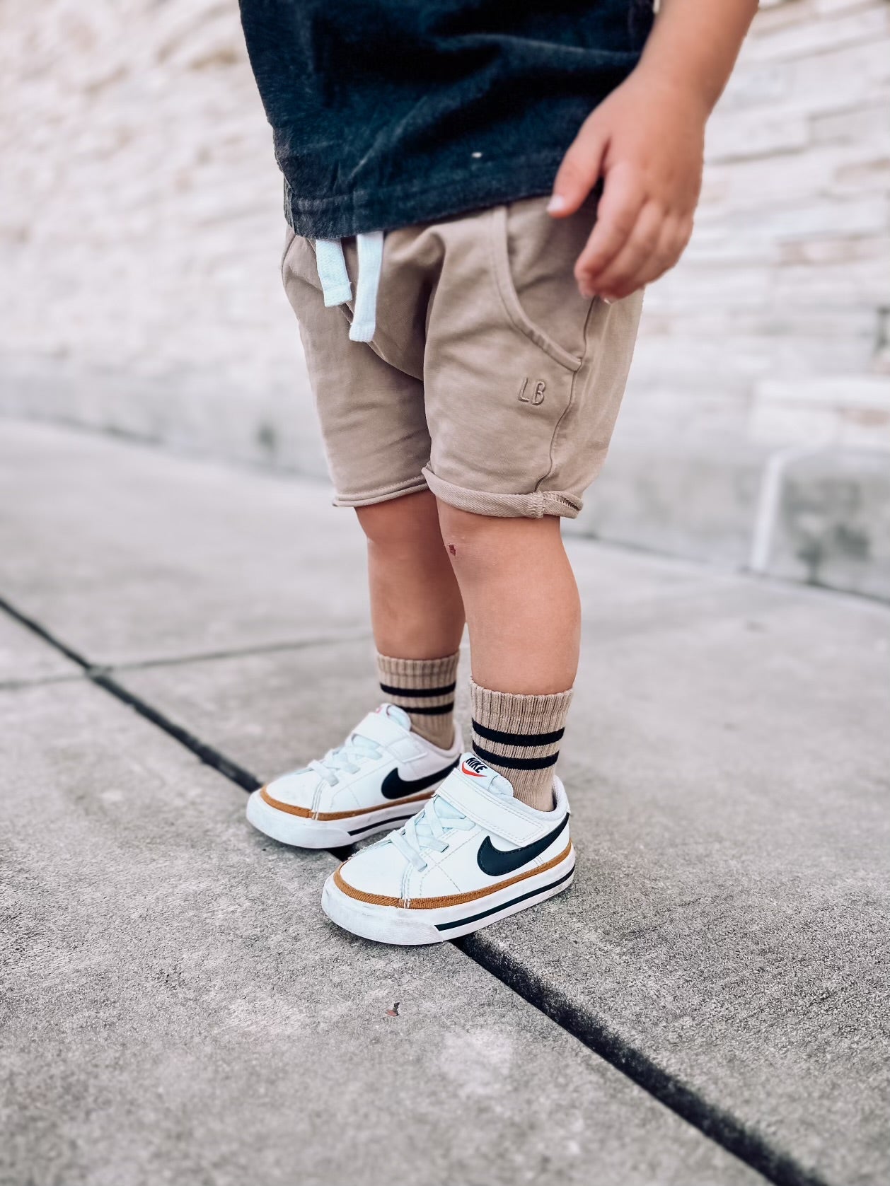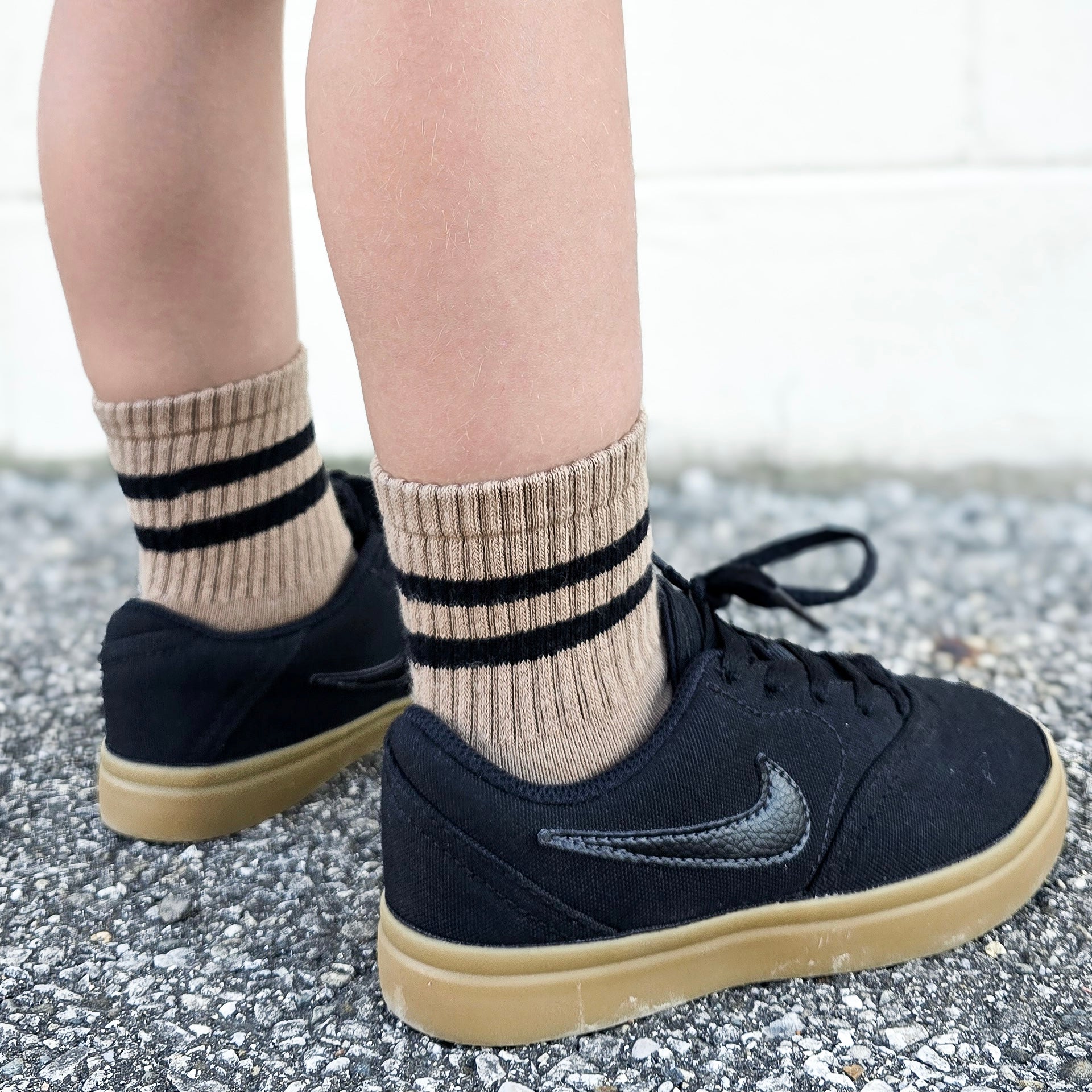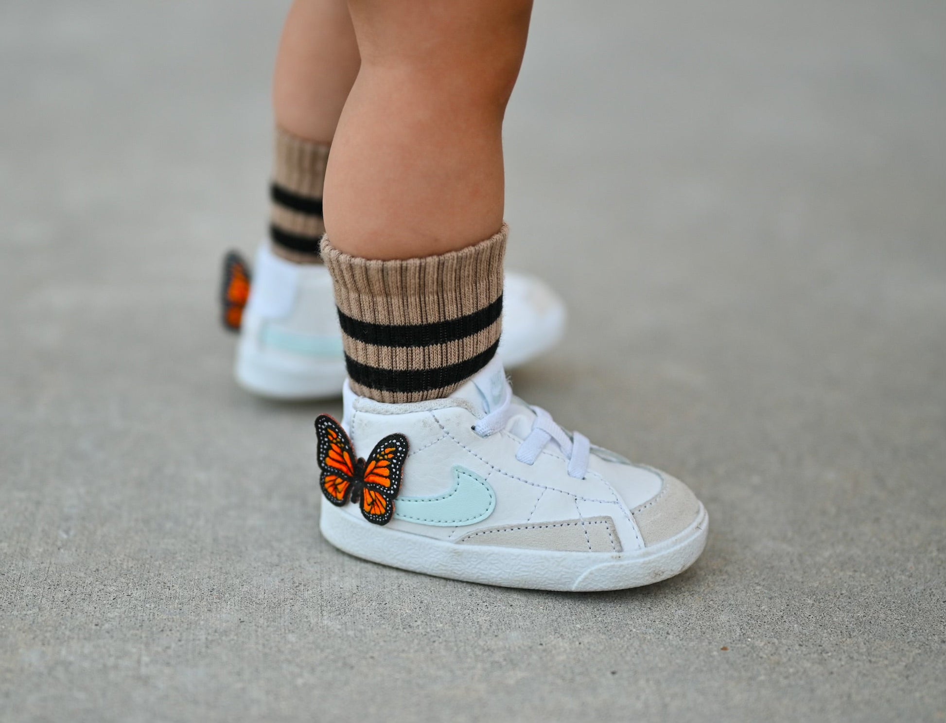 Sizes Infant, Extra Small, Small + Medium have "Kickin It Up" grips on the bottom of the feet and size Large has a stitched "Kickin It Up" on the bottom of the feet.