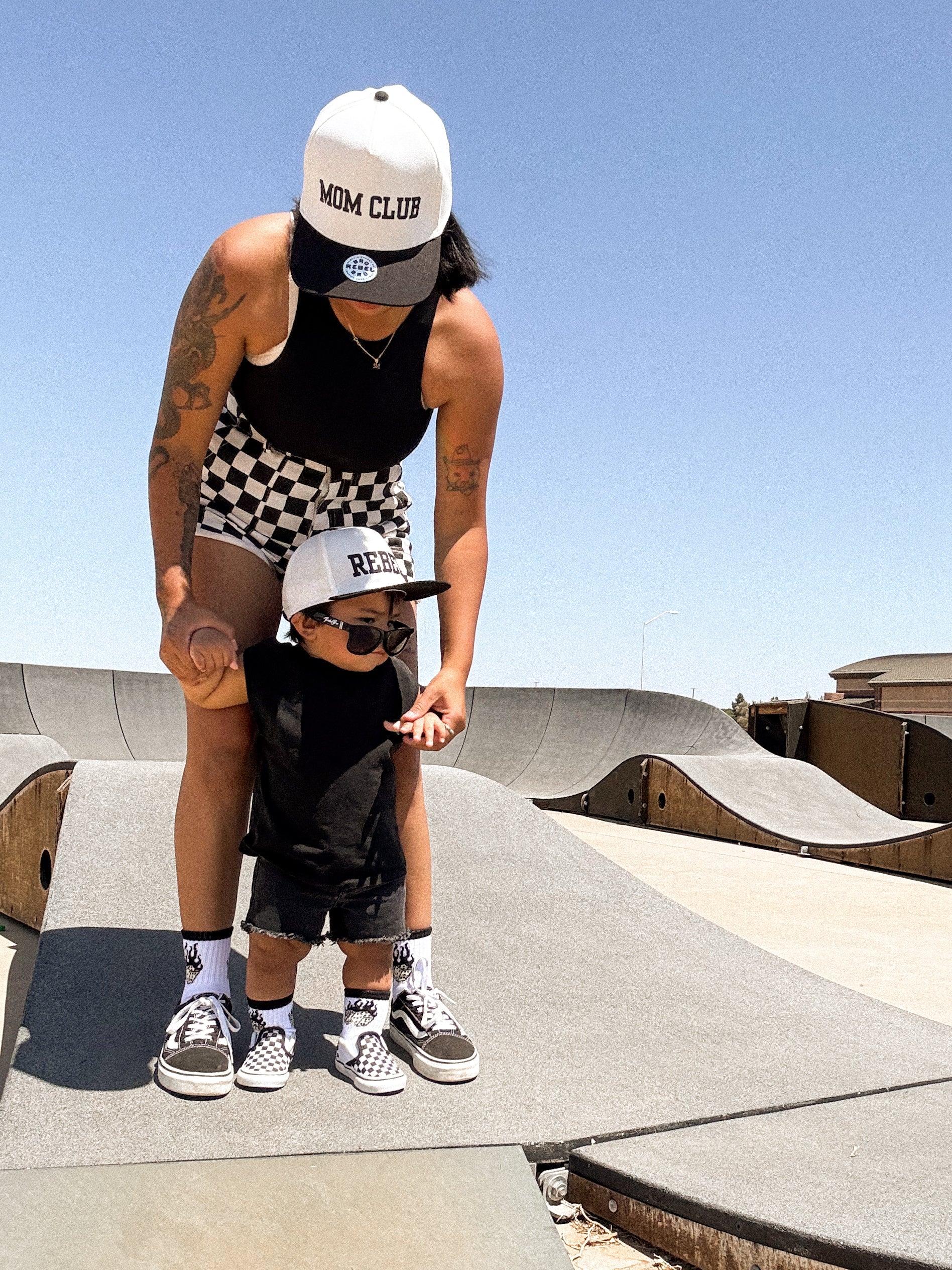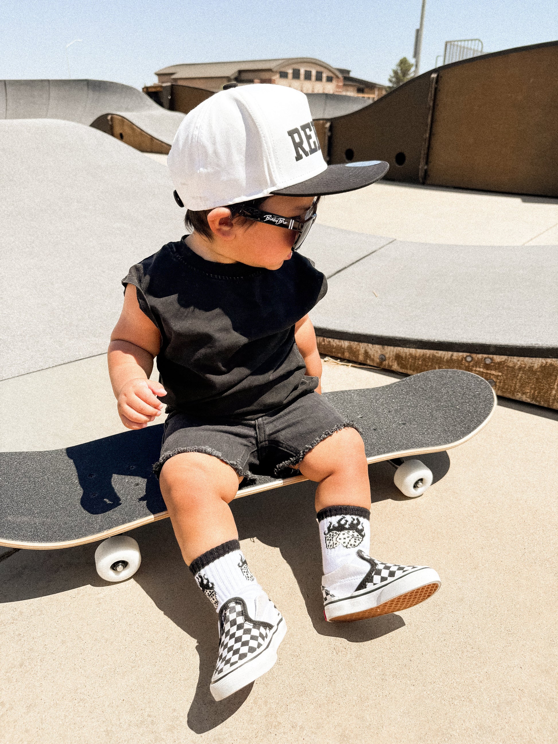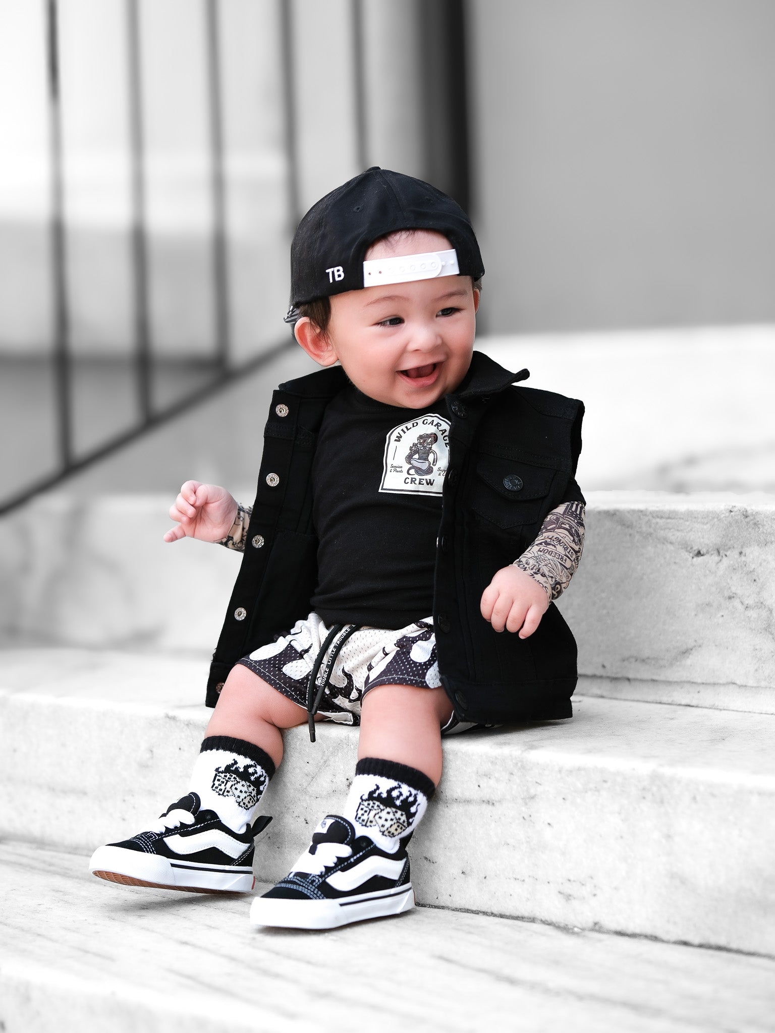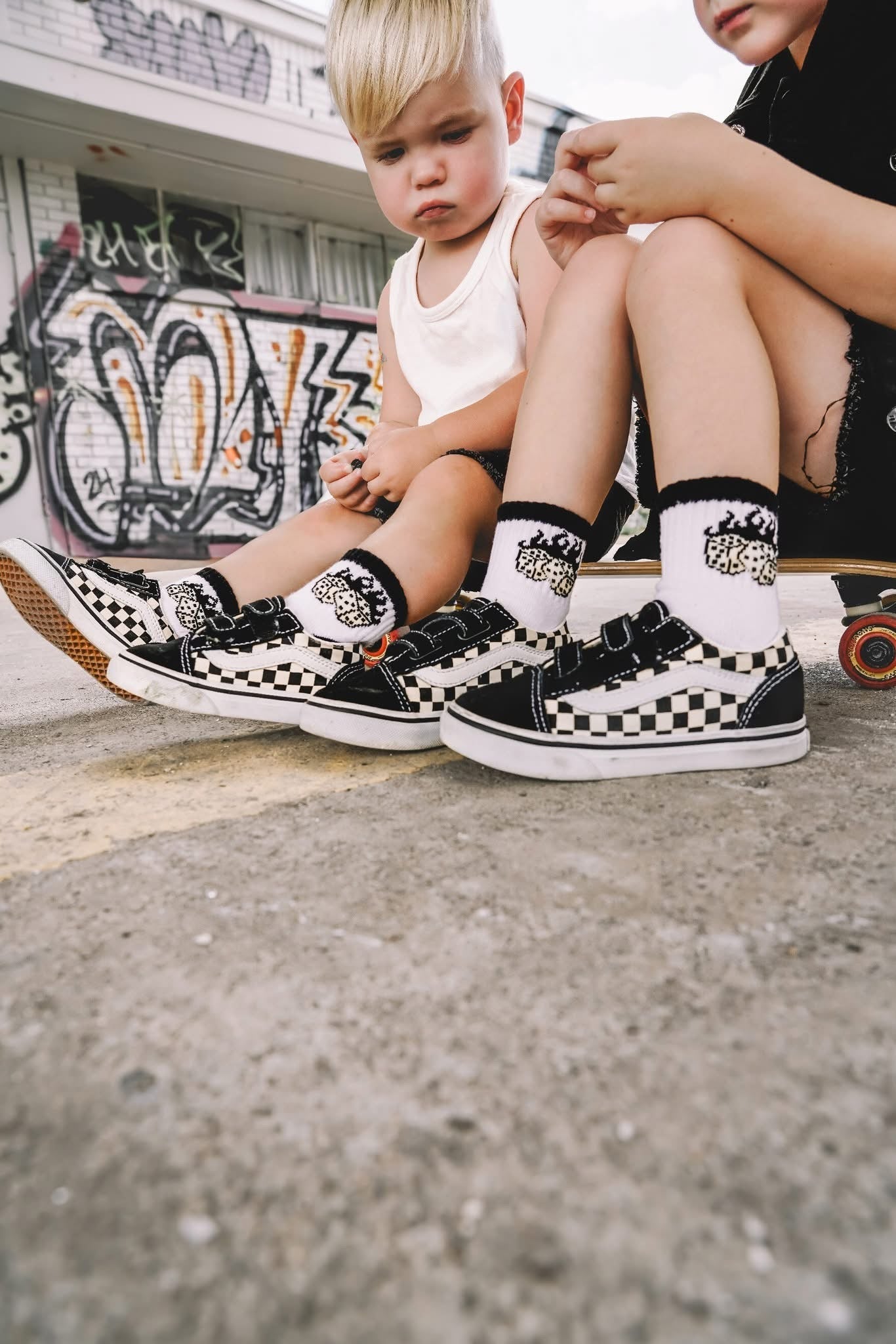 Sizes Infant, Extra Small, Small, Medium have logo grips on the bottom of the feet large have a stitched logo on the bottom of the feet.
