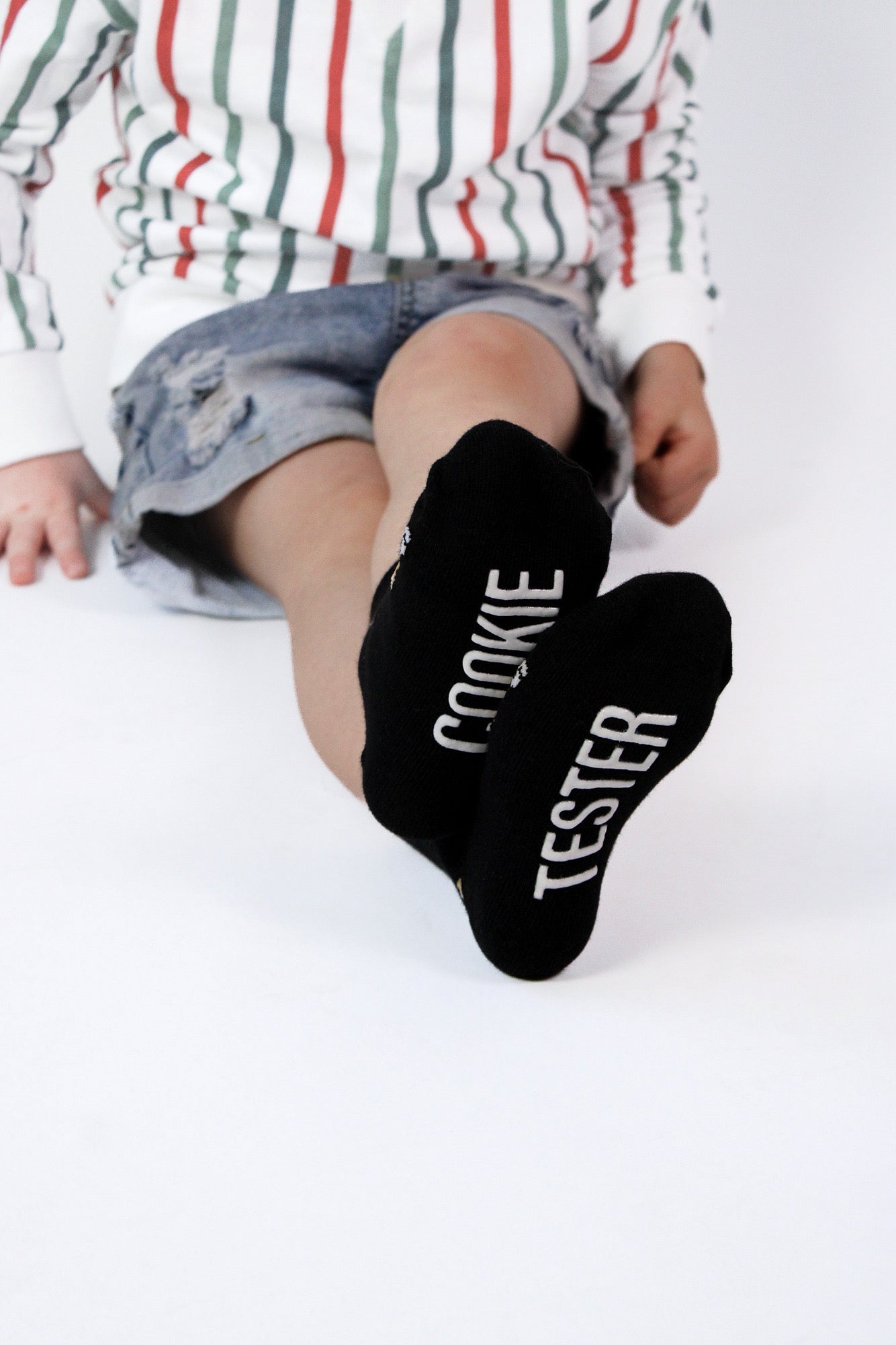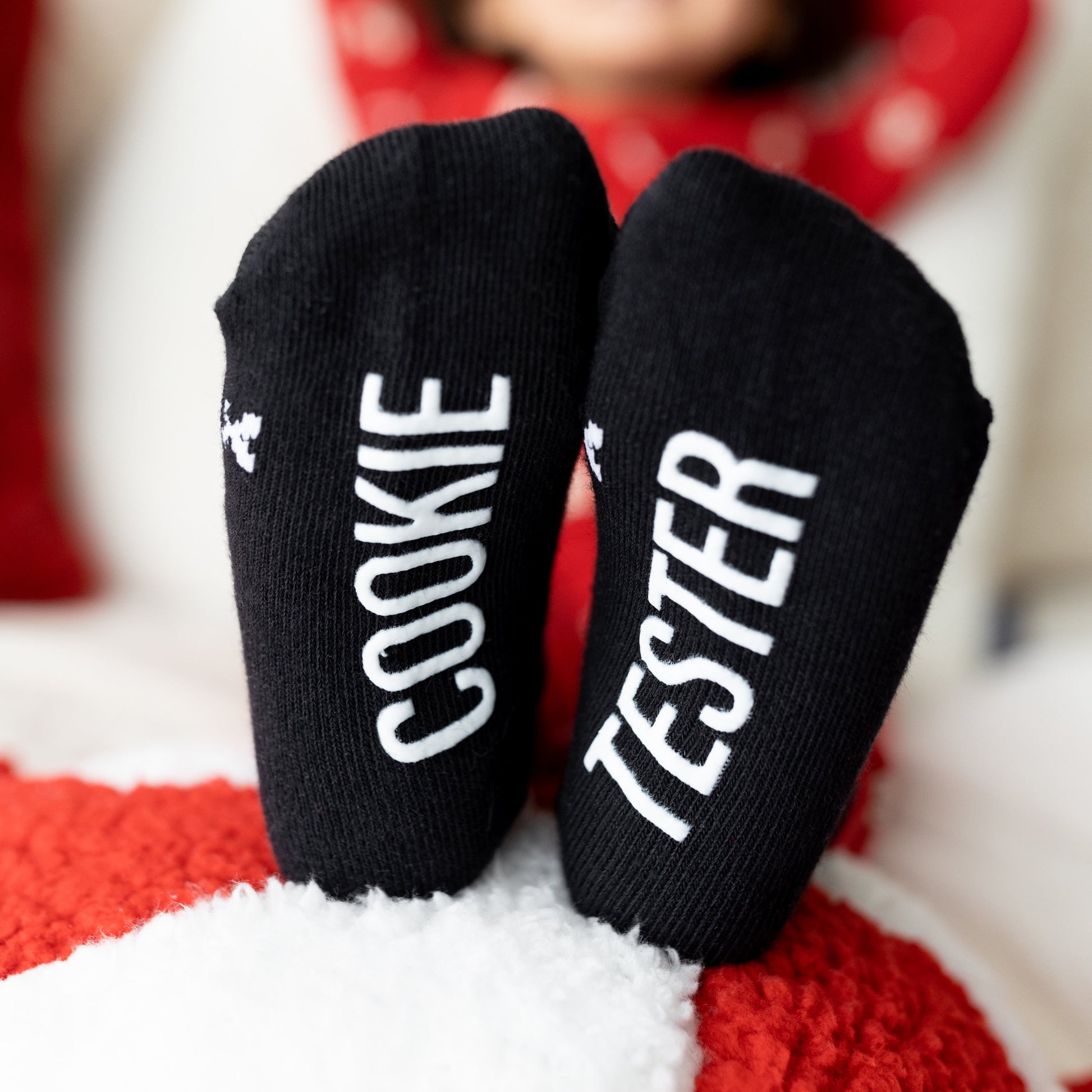 Sizes Infant, Extra Small, Small, Medium have "Cookie Tester" grips on the bottom of the feet large have a stitched "Cookie Tester" on the bottom of the feet.