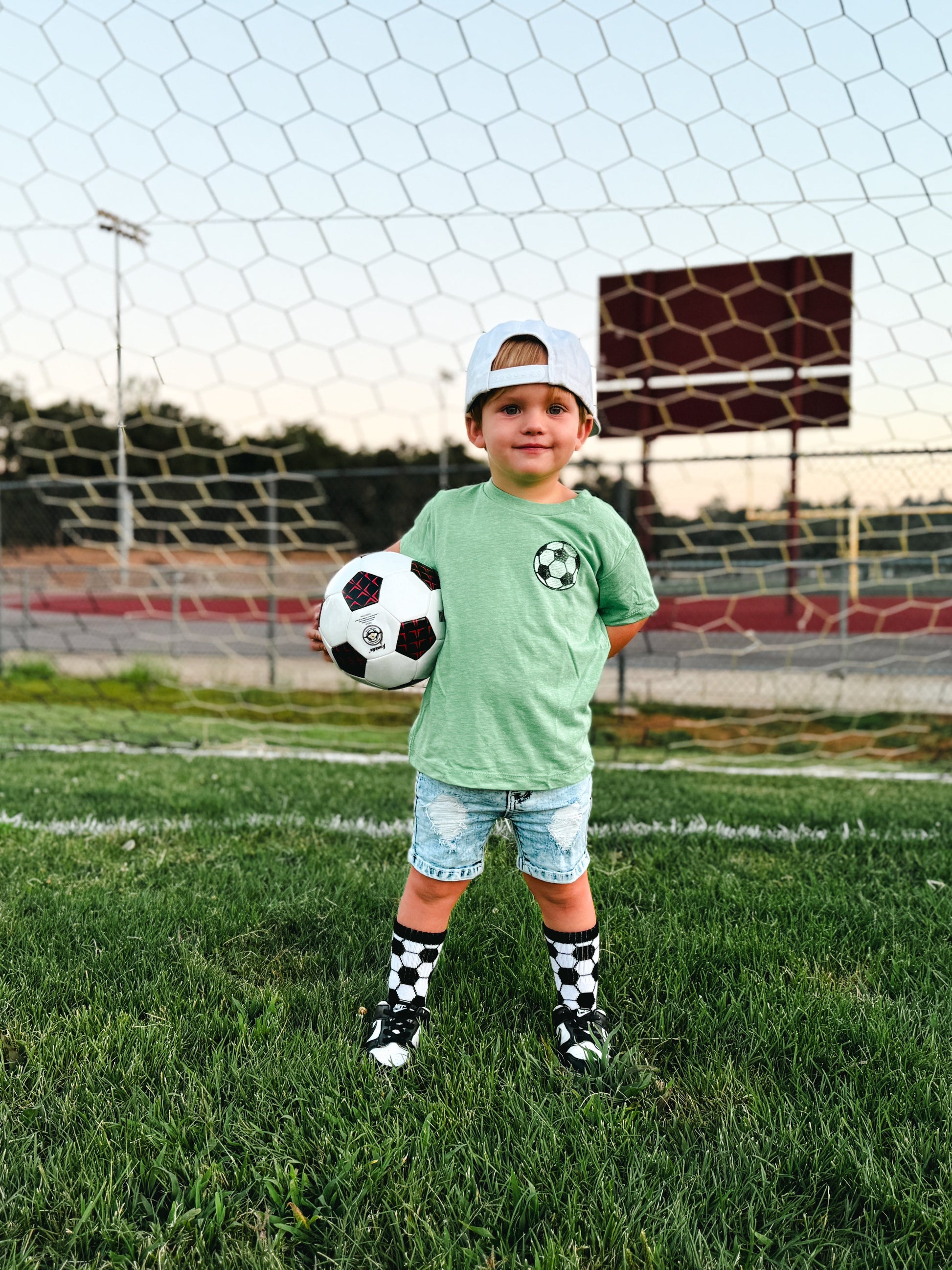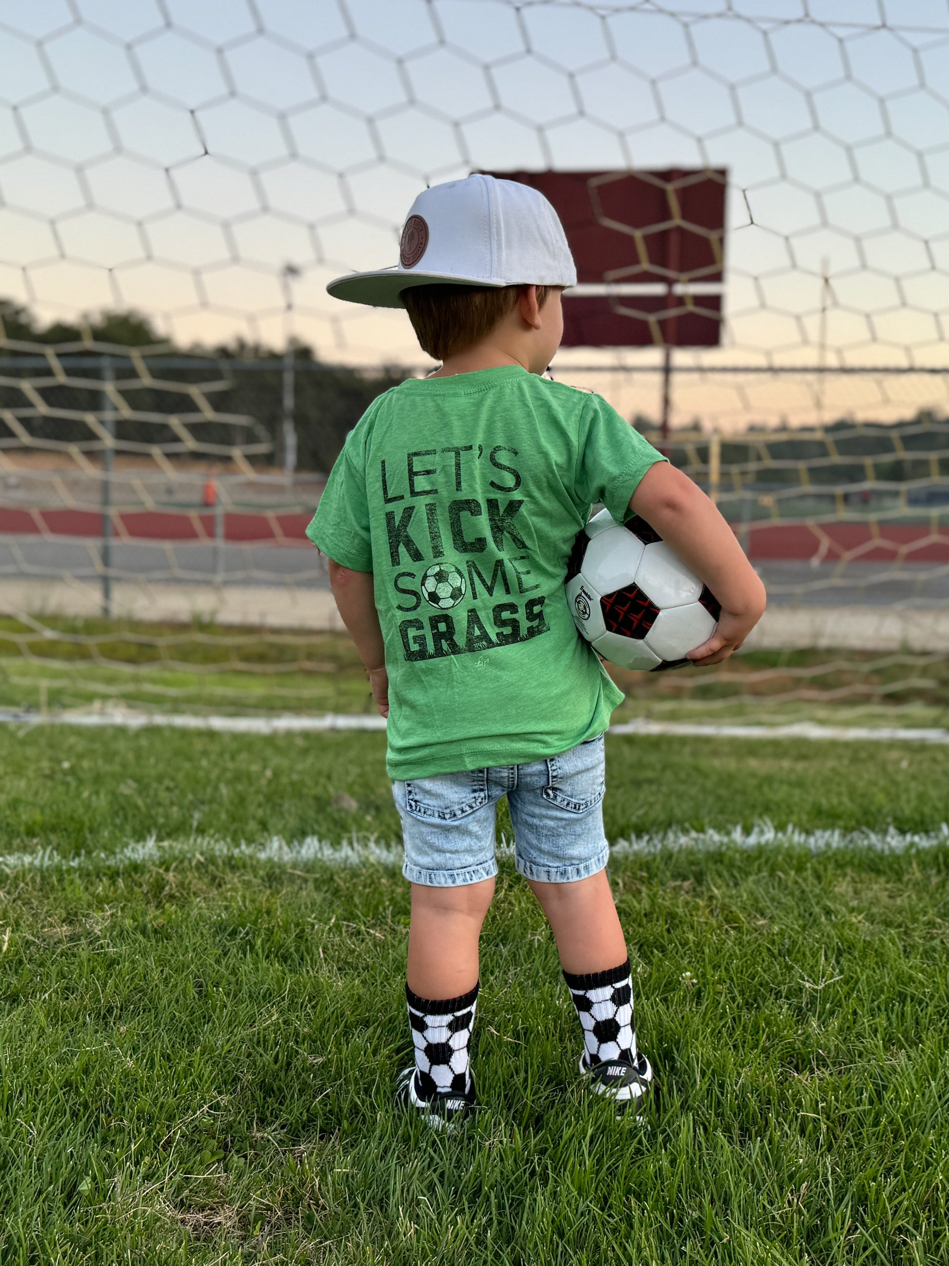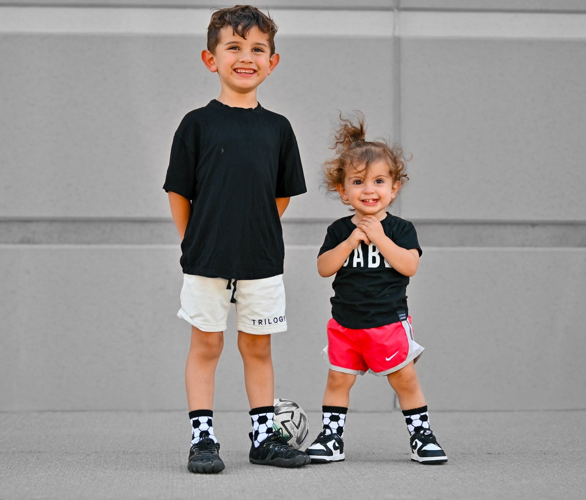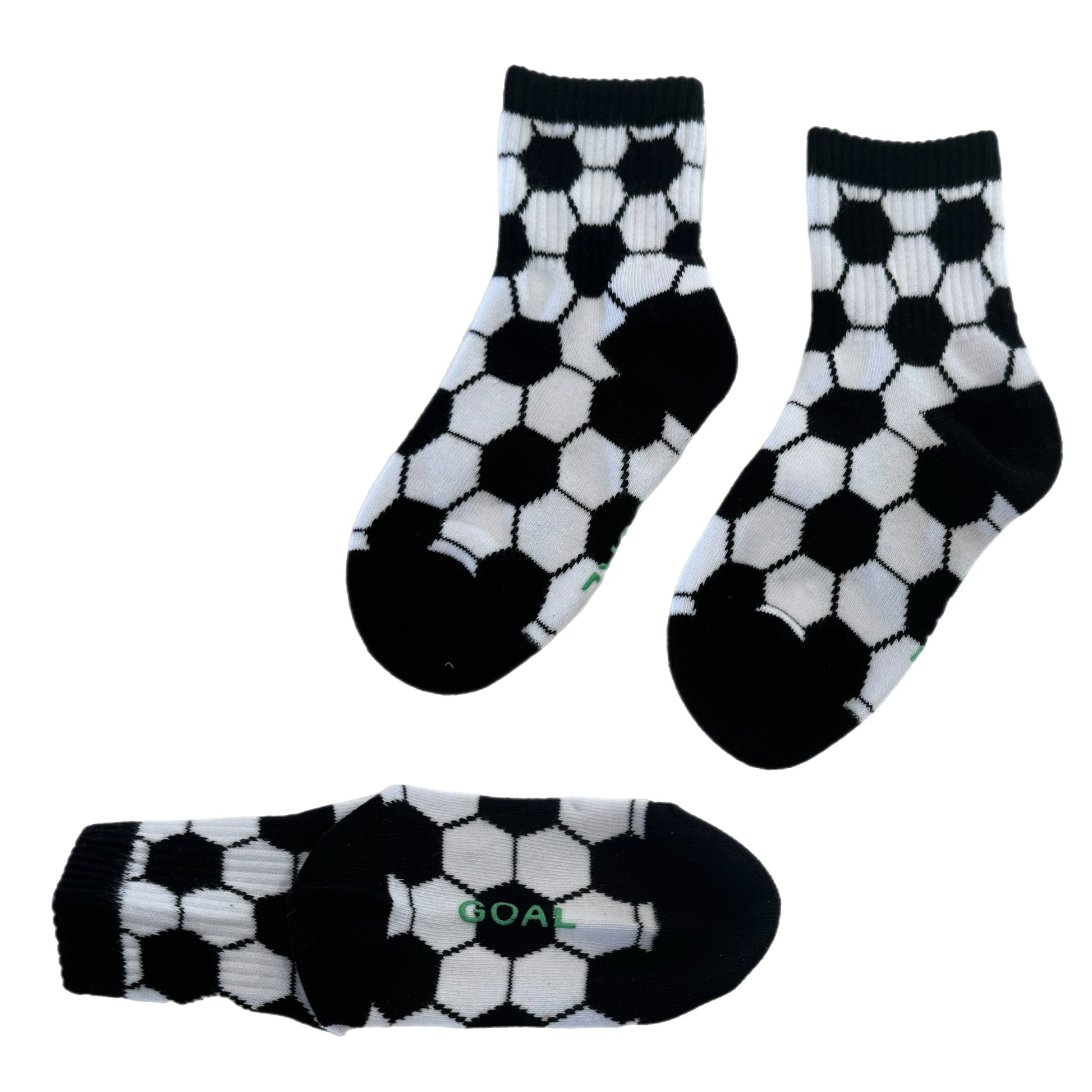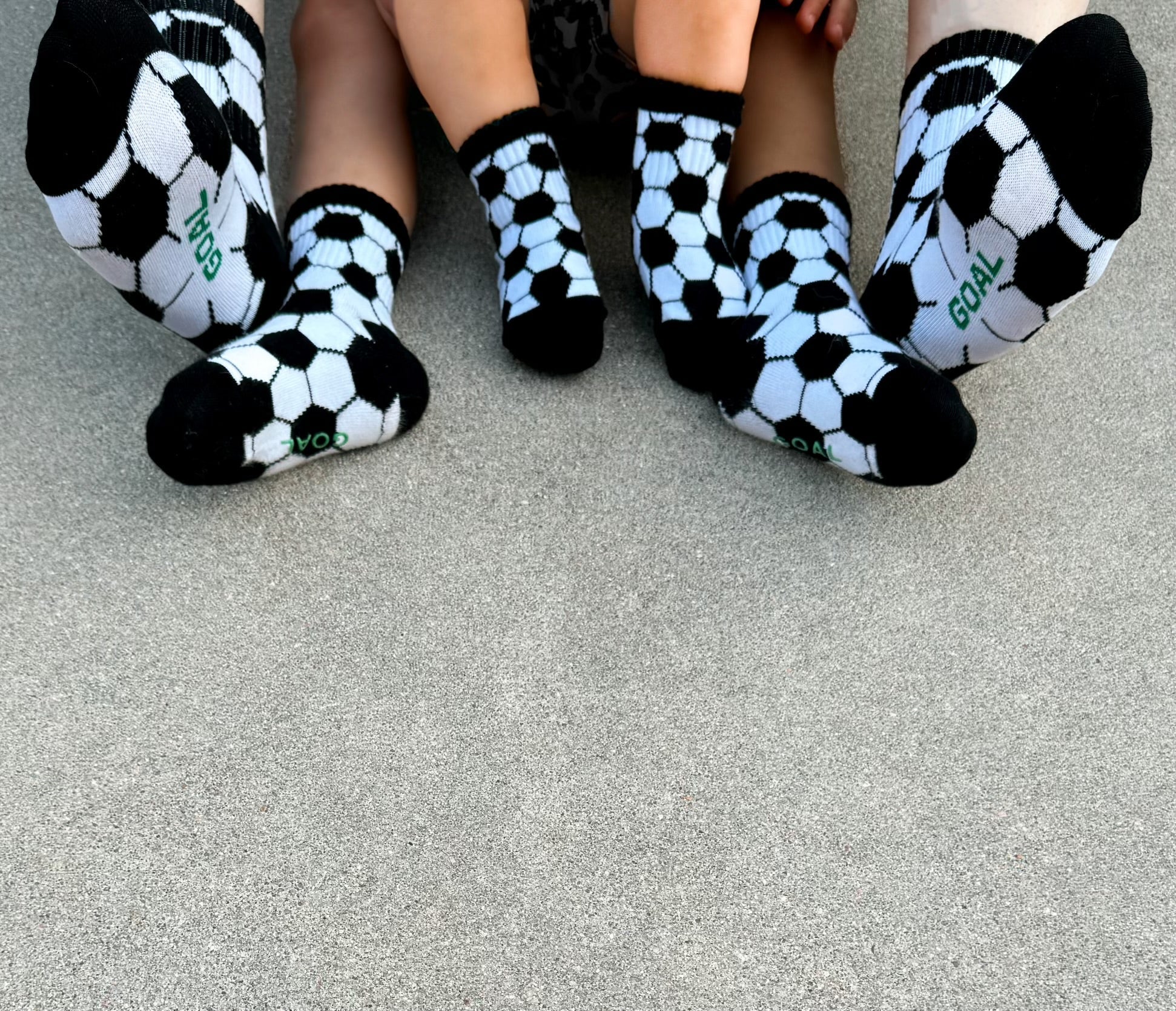 Sizes Infant/XXS, Extra Small, Small + Medium have "goal" written grips on the bottom of the feet and size large have a stitched logo on the bottom of the feet.