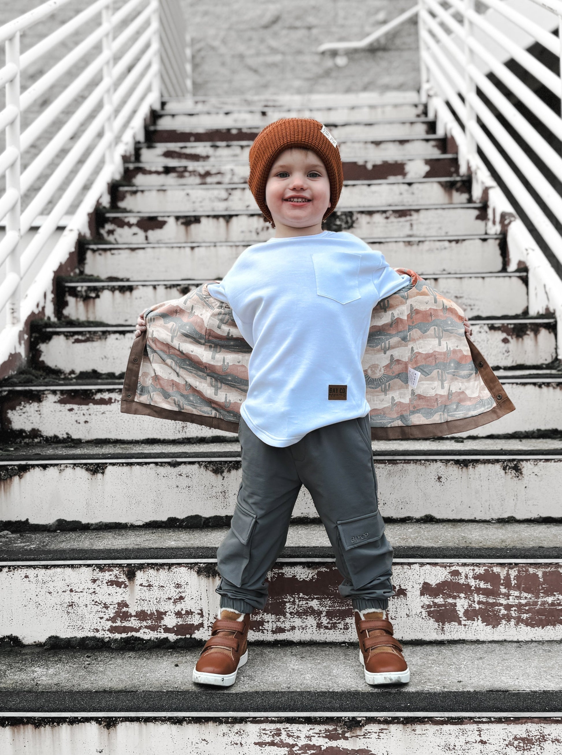 Polyester blend making this an ultra-soft, medium-weight jacket with a kid-designed lining. Finished with brushed gold snap buttons for easy bundling!