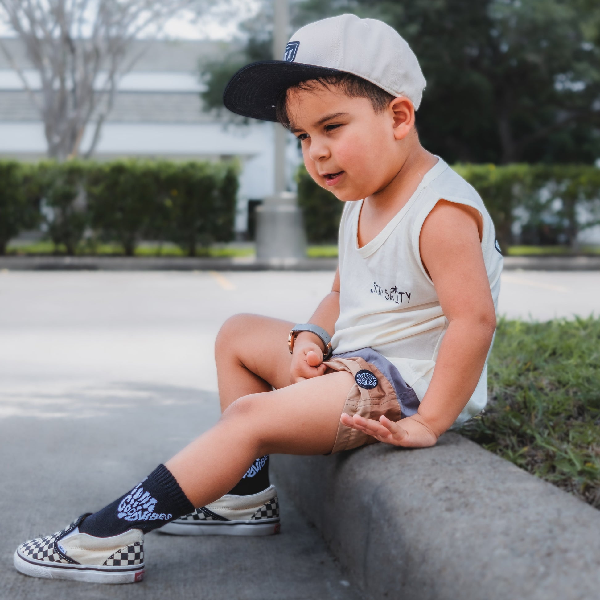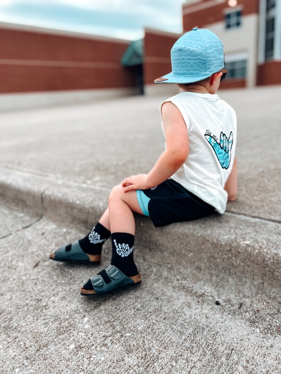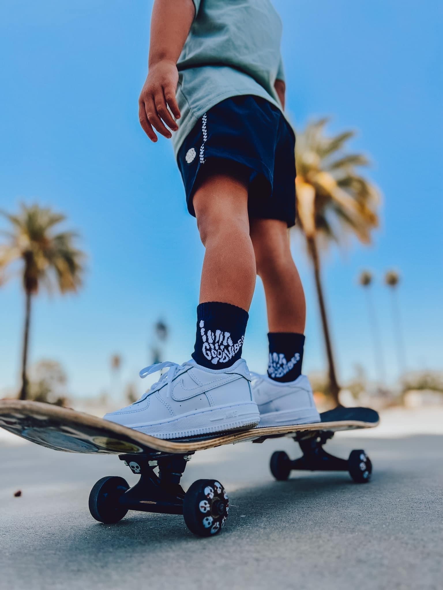 Sizes Infant/XXS, Extra Small, Small + Medium have logo grips on the bottom of the feet and size Large has a stitched logo on the bottom of the feet.