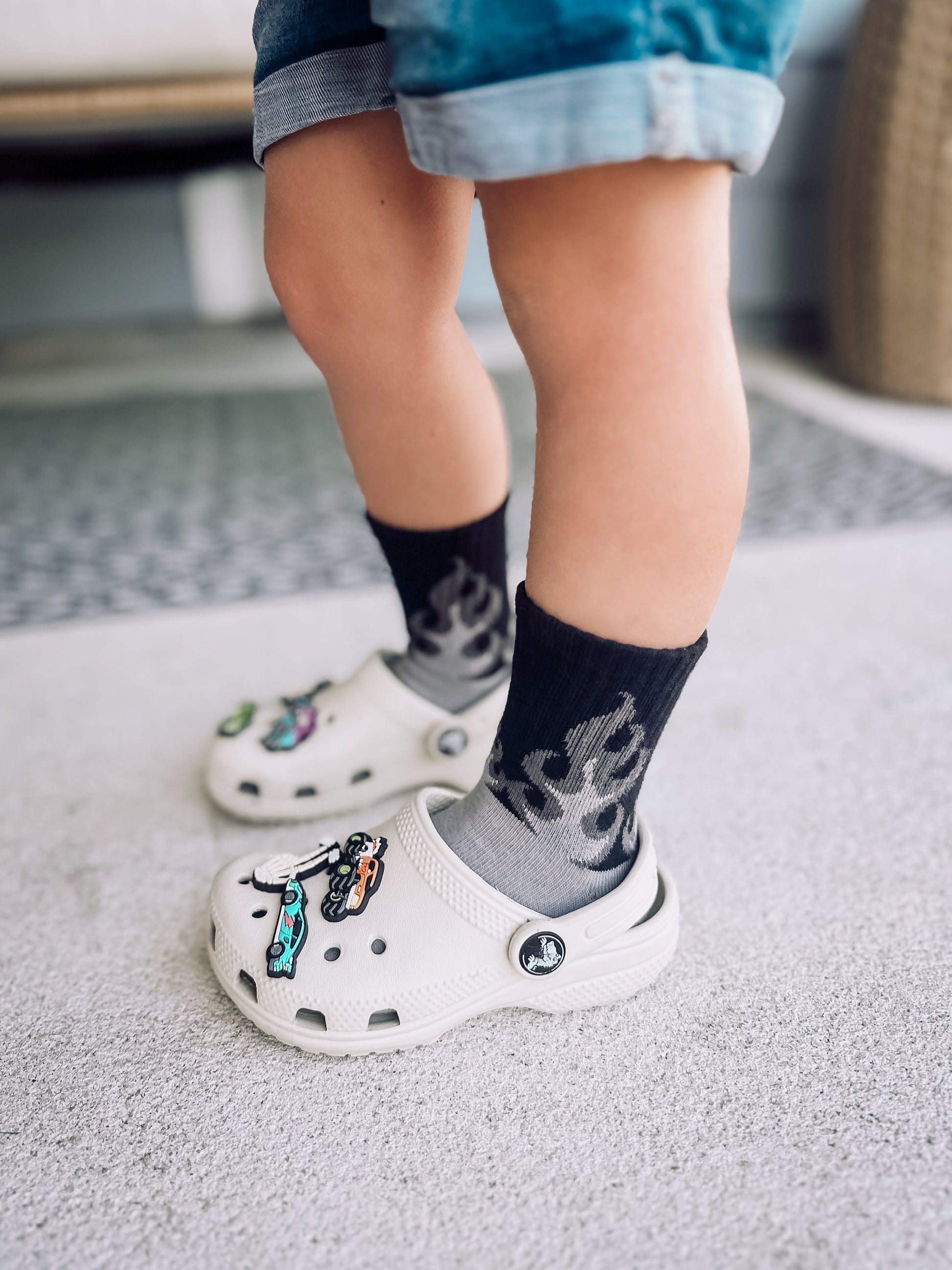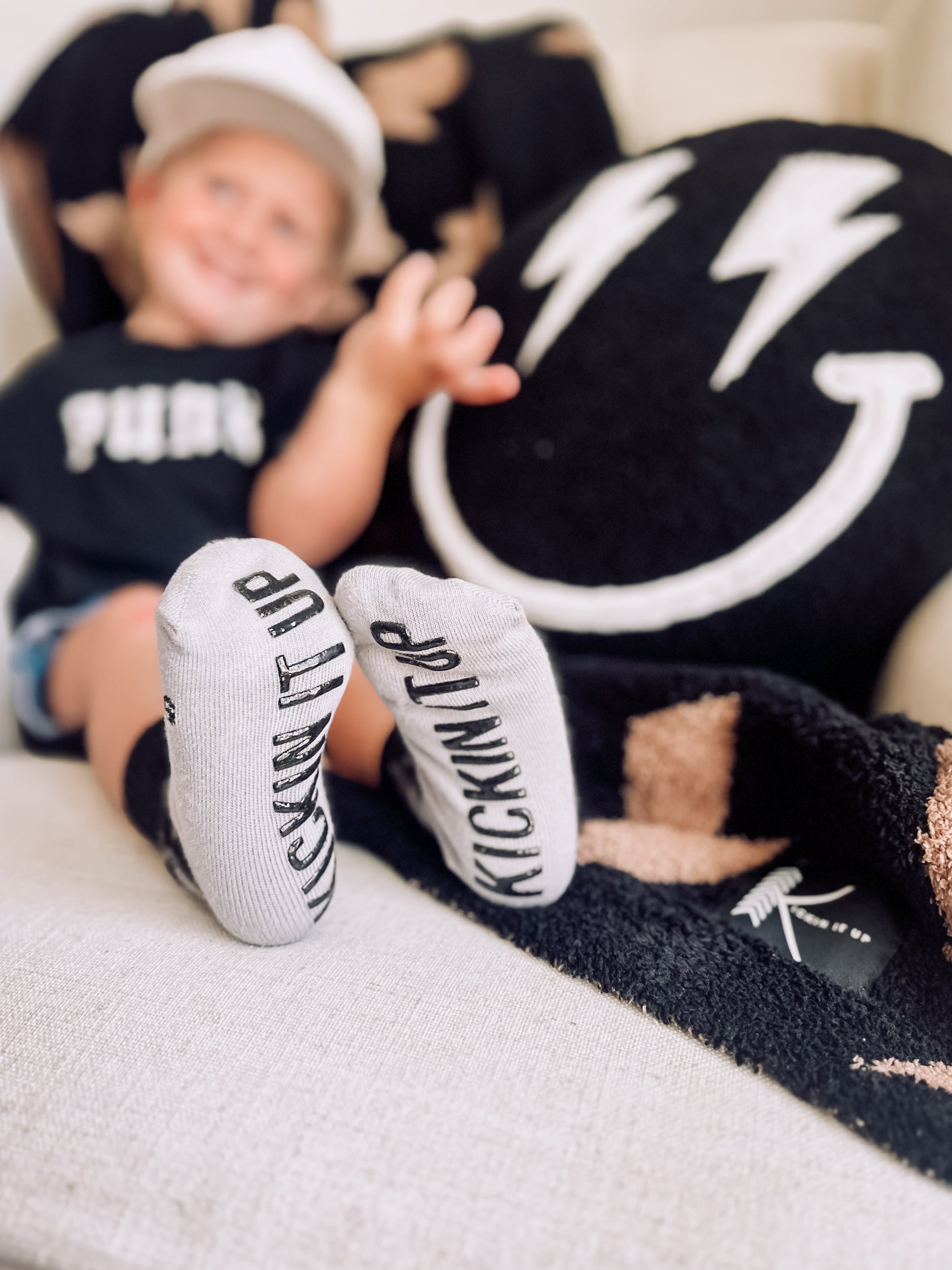 Sizes Infant, Extra Small, Small, Medium have logo grips on the bottom of the feet large have a stitched logo on the bottom of the feet.