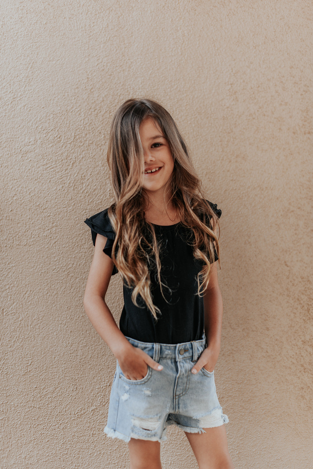 Our Classic Cut offs are the perfect length (not overly short but still a bit of sass still) and the best distressed details. These shorts give off a timeless look that moms and kids alike will love. The vintage-inspired wash adds a unique touch that sets them apart from your standard denim shorts, as well as our signature logo leather patch and diagonal pocket detail stitching.