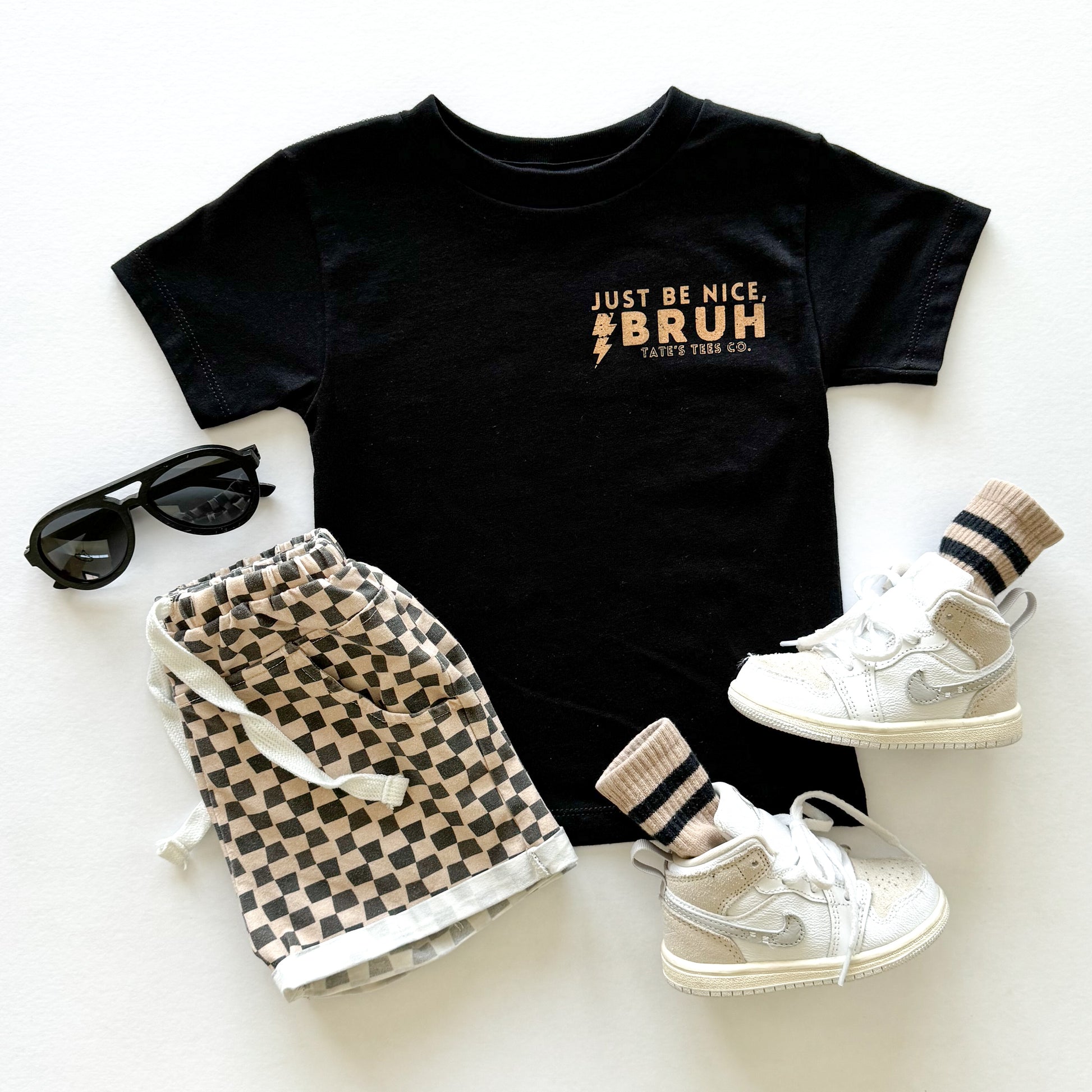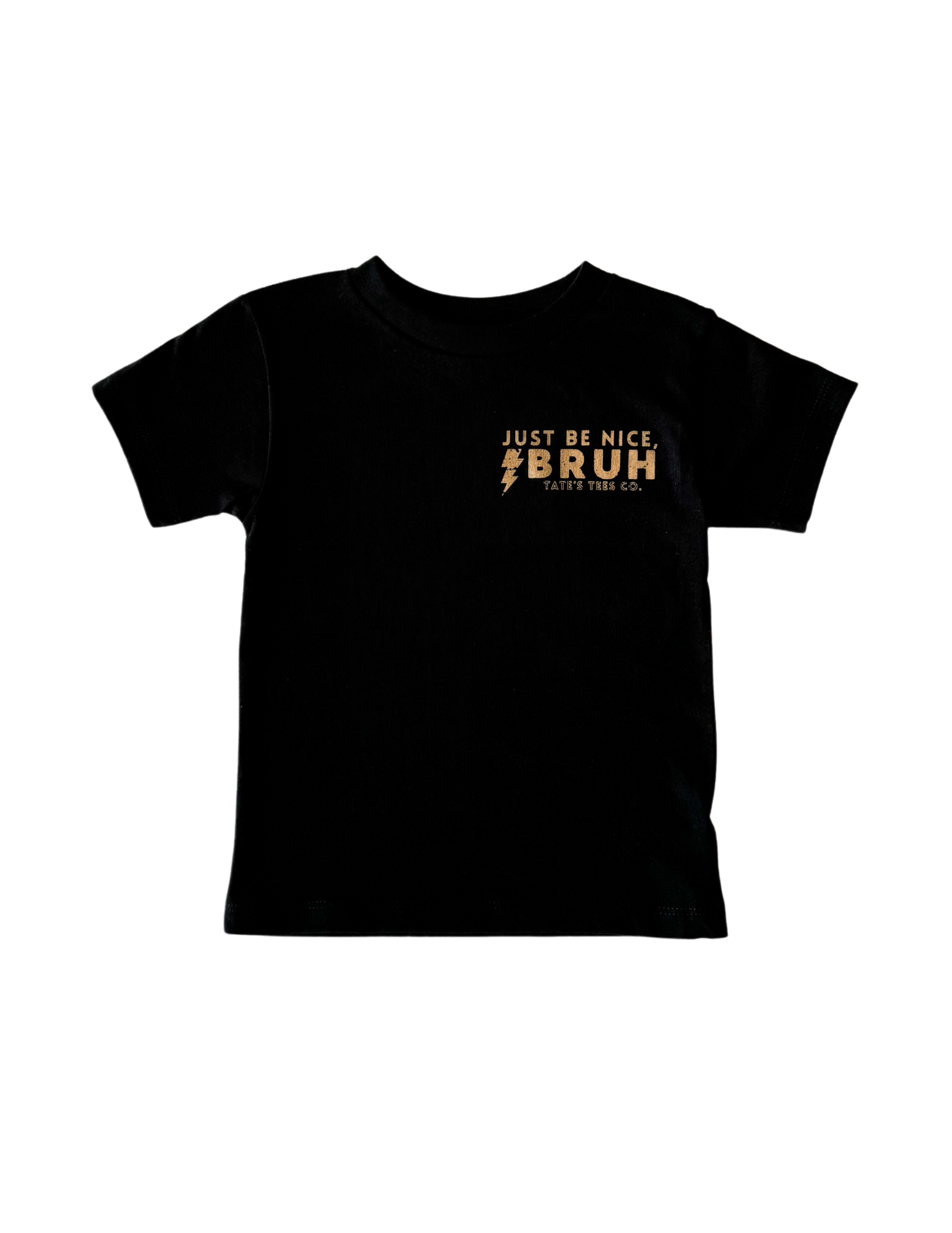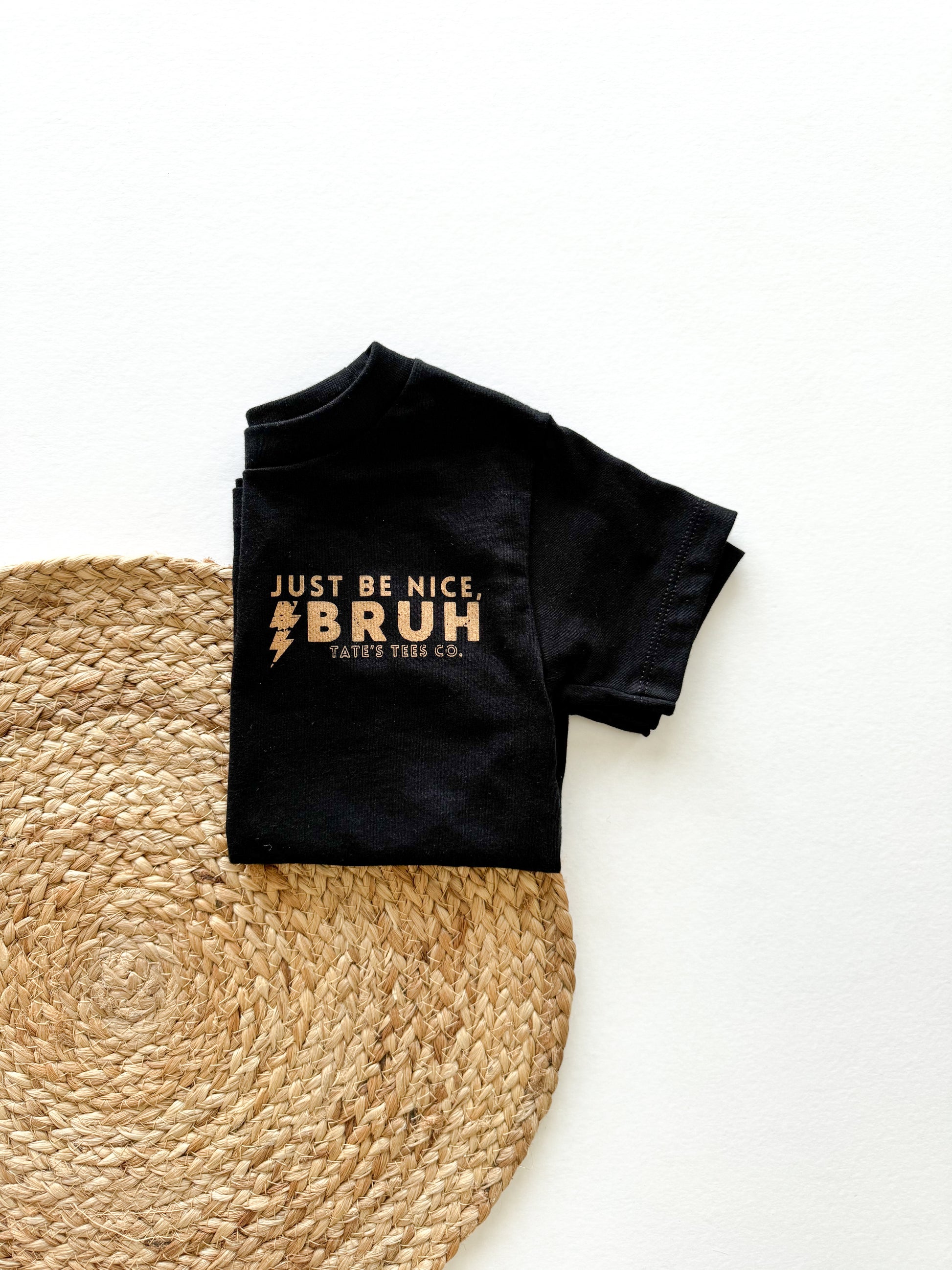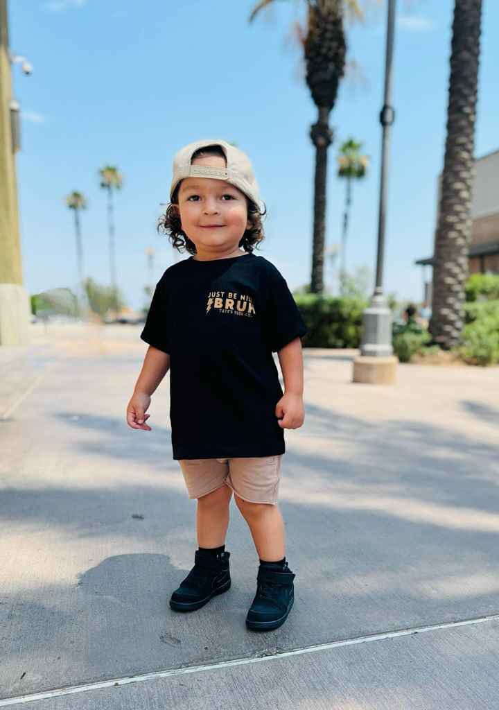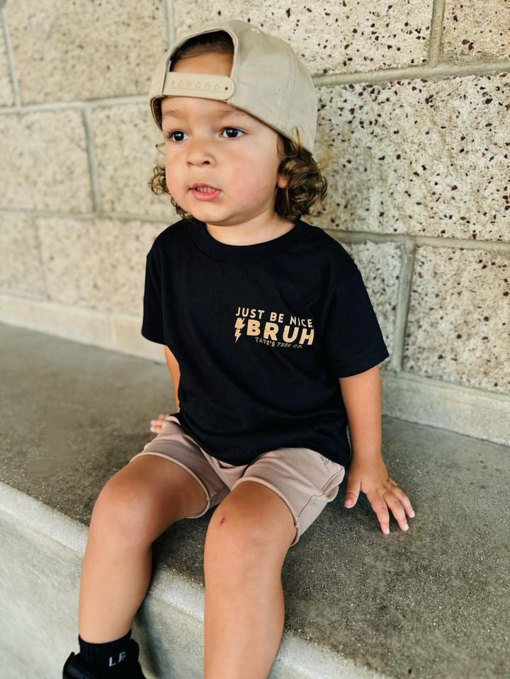 Elevate your kid's wardrobe with this new classic black tee featuring the words "Just Be Nice, Bruh." with a lightning bolt in tan. We believe in raising kind kids and that kindness can be cool too. A simple reminder goes a long way! Play all day in pure comfort, this tee is super soft & breathable. Relaxed, gender neutral and fitting true to size.