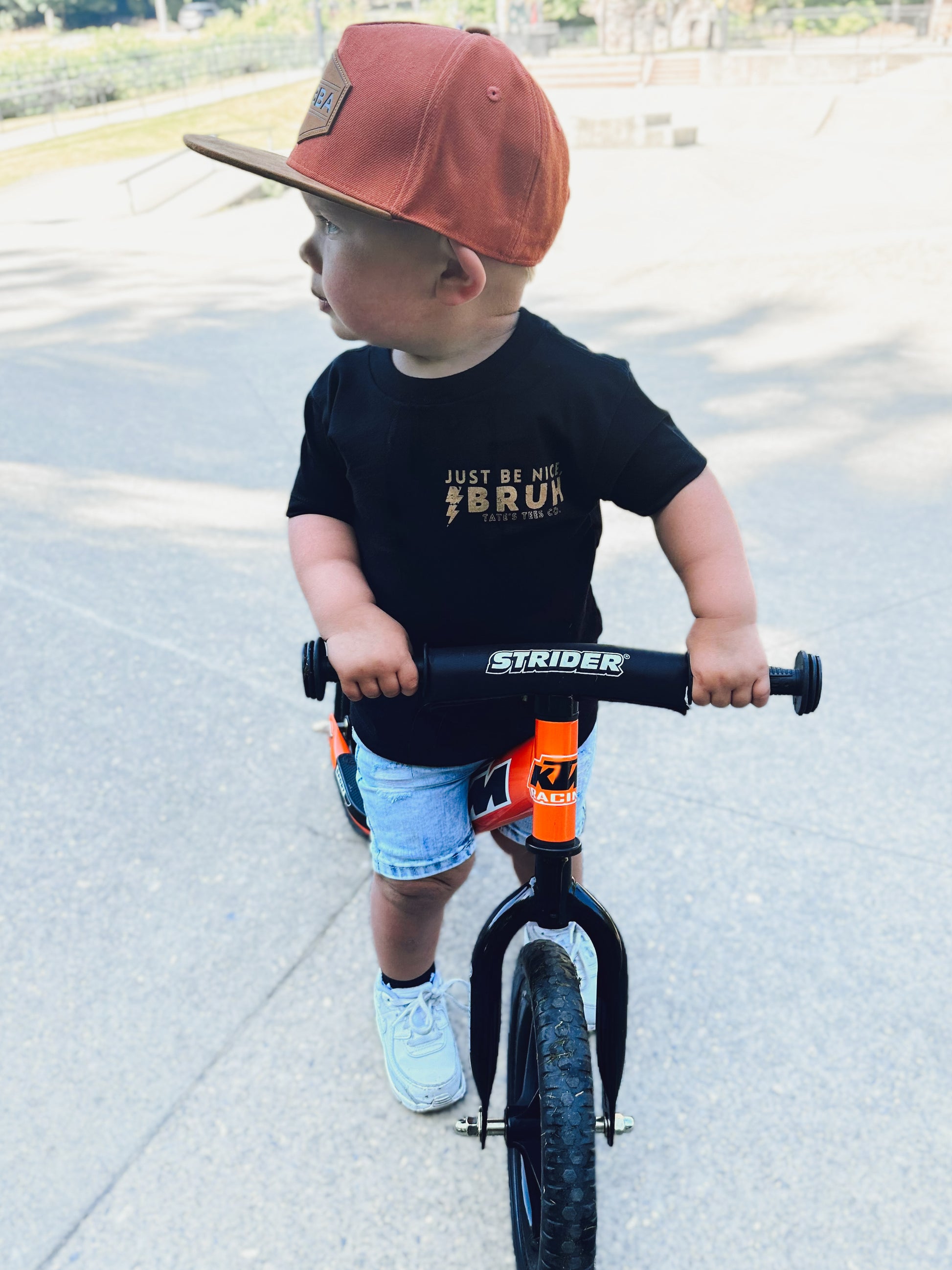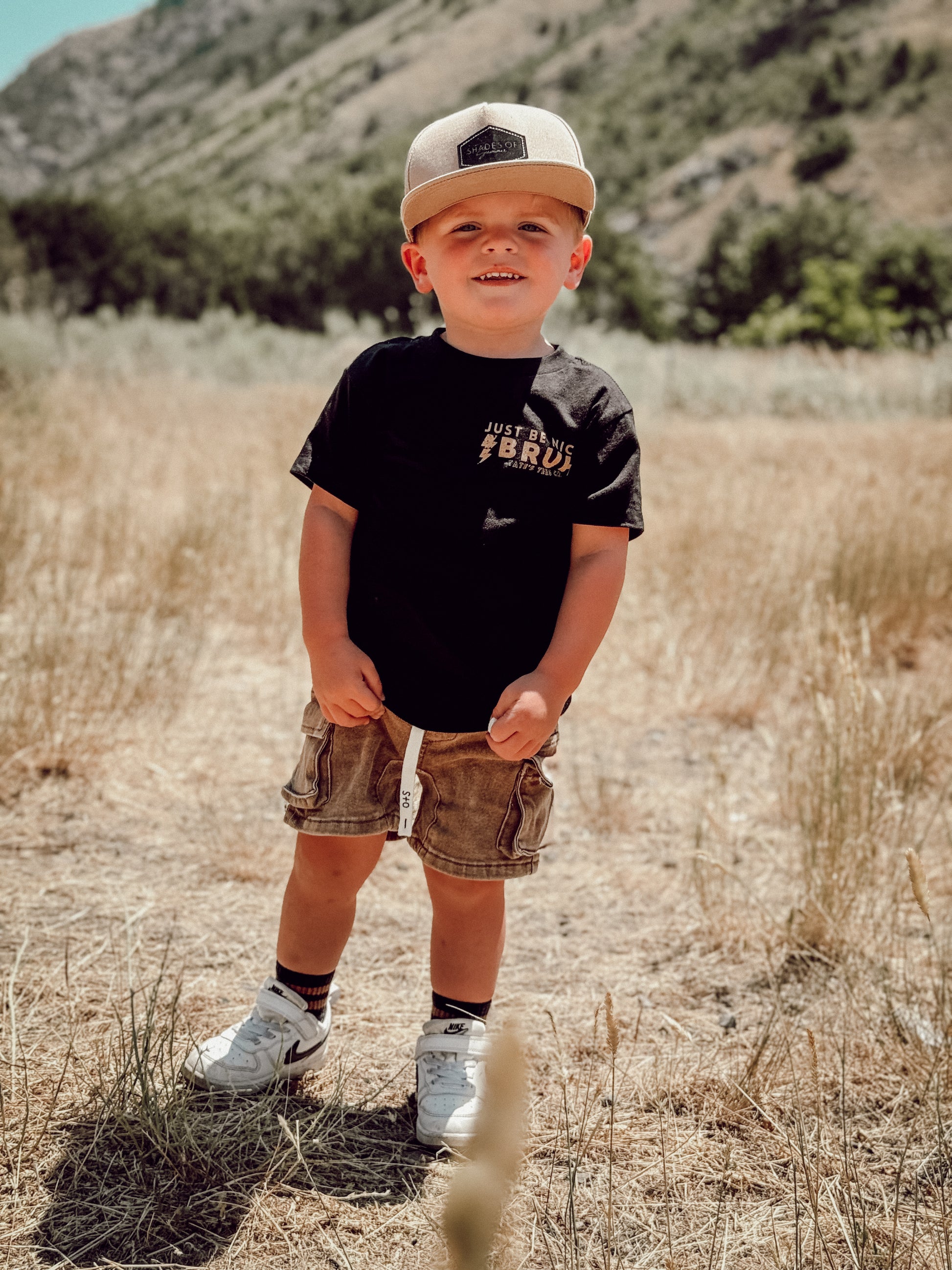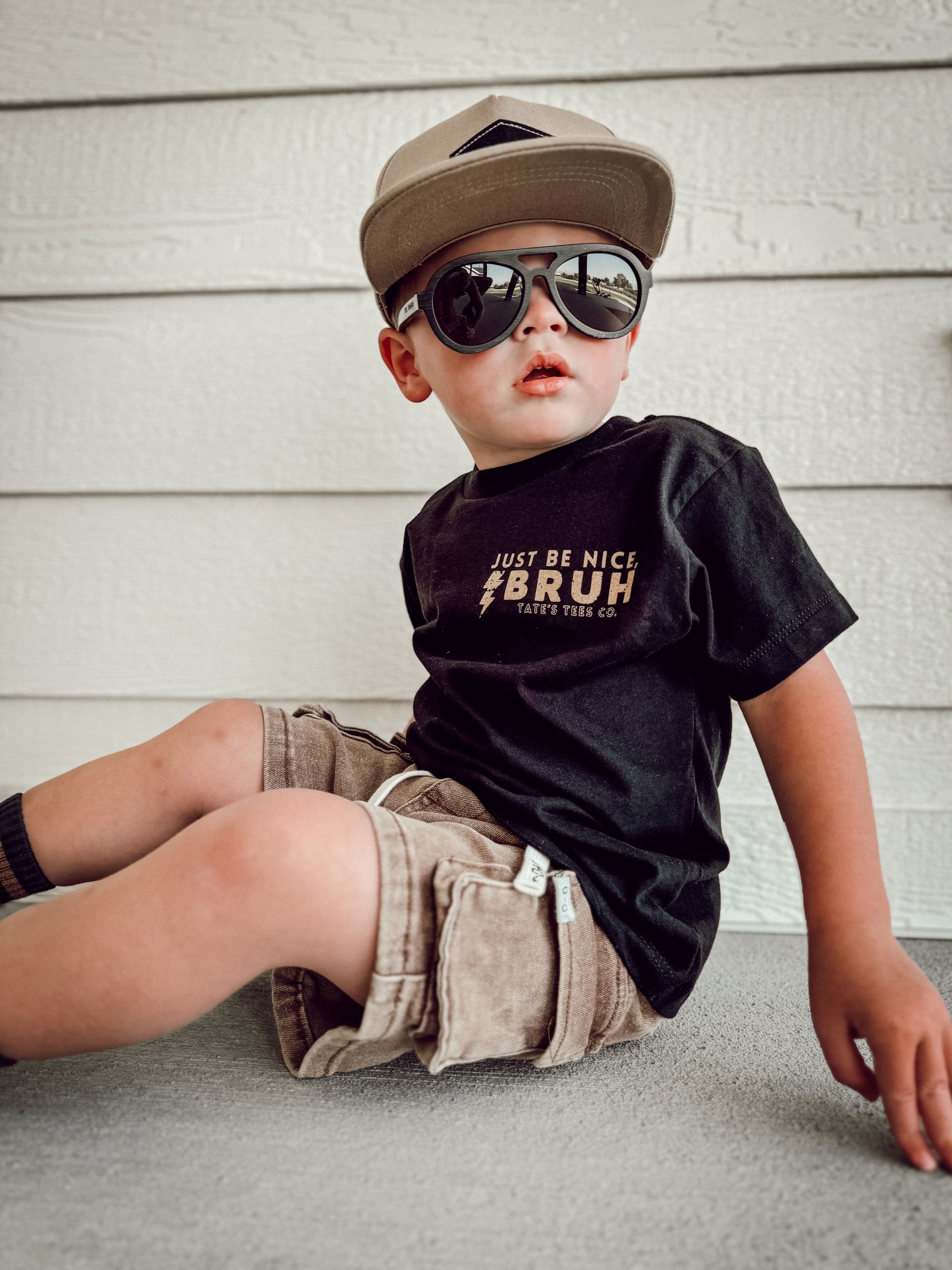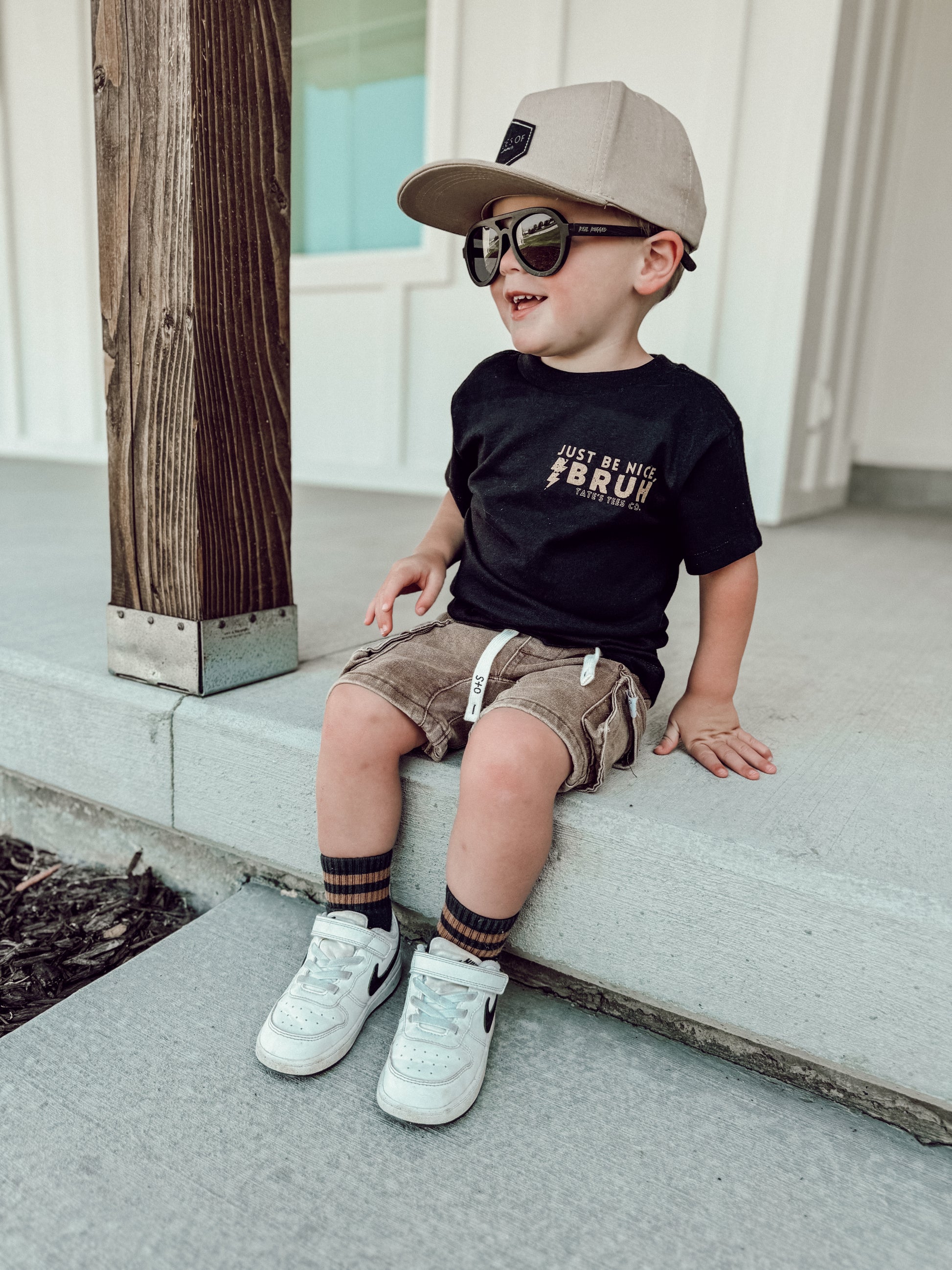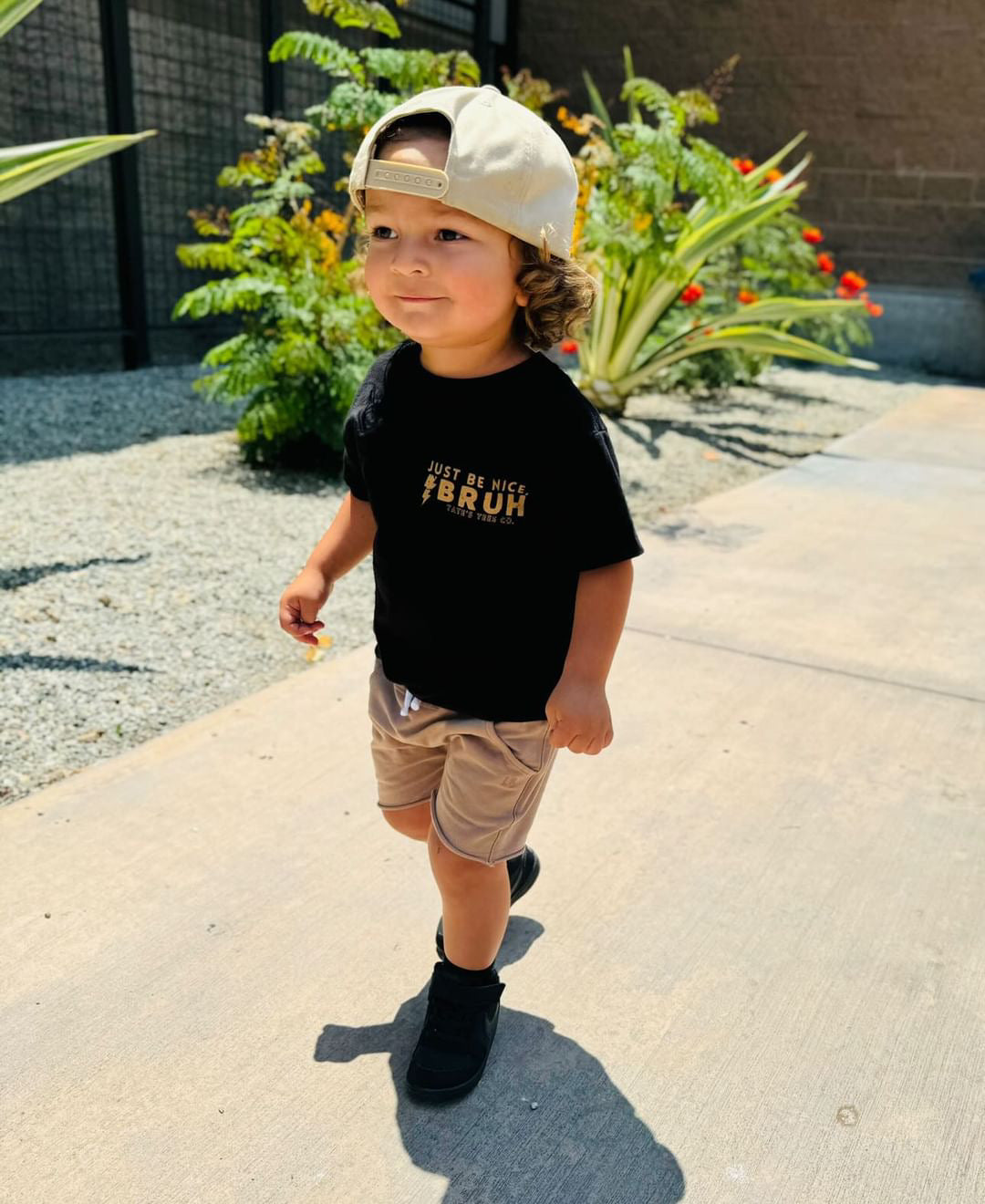 Elevate your kid's wardrobe with this new classic black tee featuring the words "Just Be Nice, Bruh." with a lightning bolt in tan. We believe in raising kind kids and that kindness can be cool too. A simple reminder goes a long way! Play all day in pure comfort, this tee is super soft & breathable. Relaxed, gender neutral and fitting true to size.