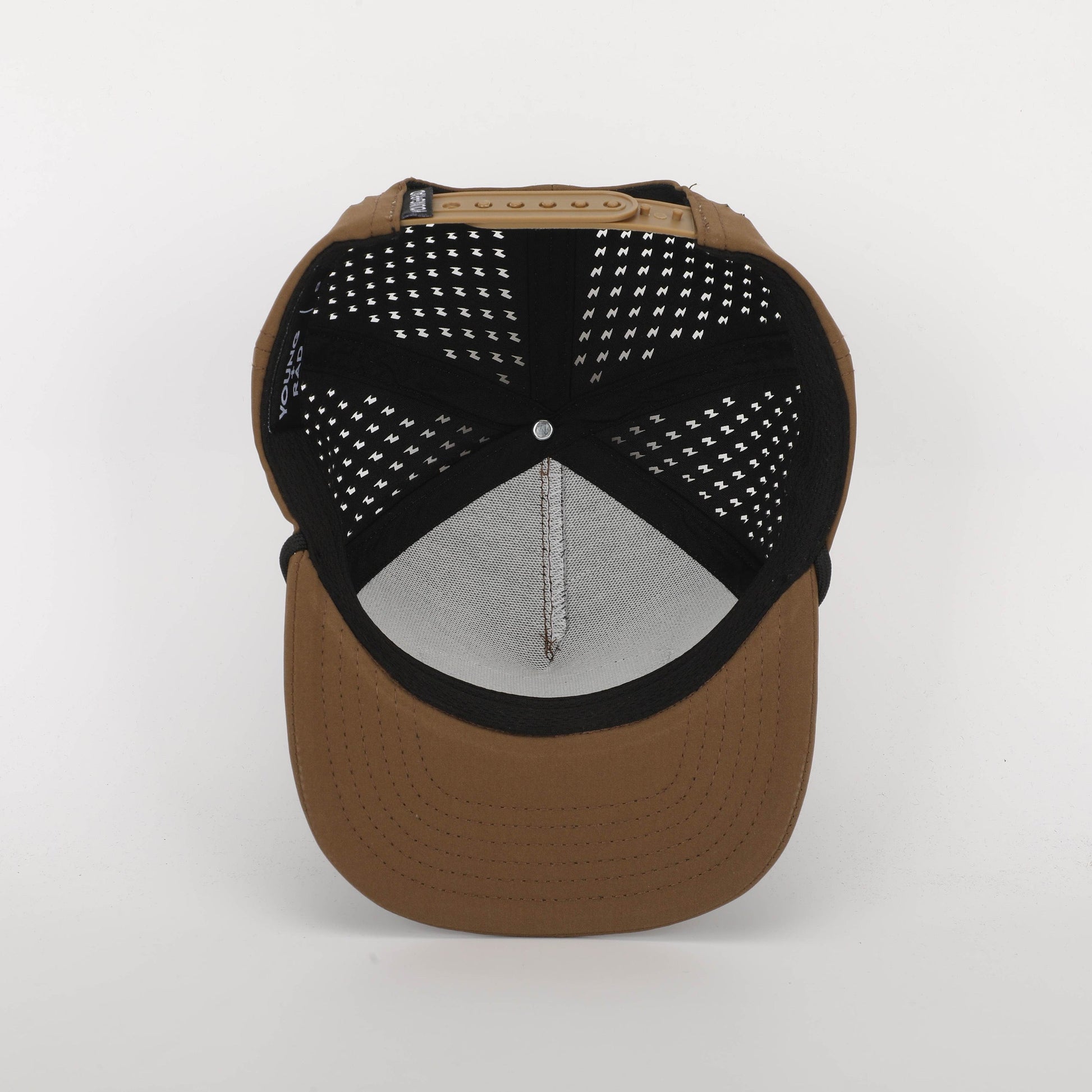 Crown: Hydrophobic coated crown panels with lightning bolt laser cut side and rear panels for all day comfort and breathability.