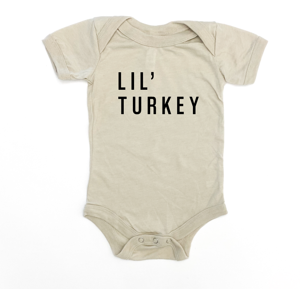 •ITEM: Infant Bodysuit with "lil' turkey" printed in black ink.