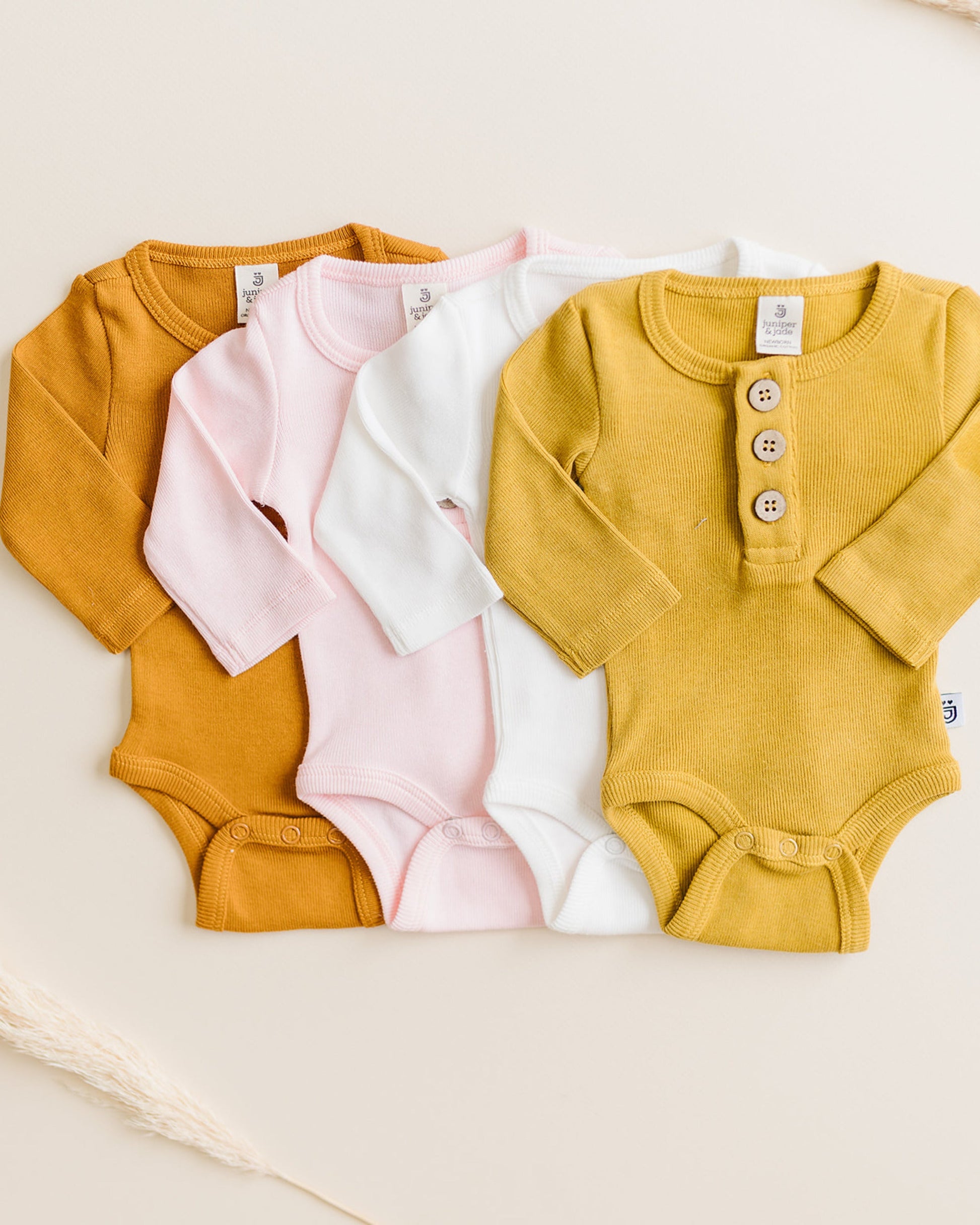 Get ready for a seriously cute outfit with this gender neutral baby onesie! Made from 100% organic cotton and thoughtfully designed with neutral colors, this onesie is perfect for your little one's first day at home. Plus, 3 practical buttons at the front and snaps at the bottom make dressing and changing a breeze. Complete the look with our matching joggers and headbands or beanies!