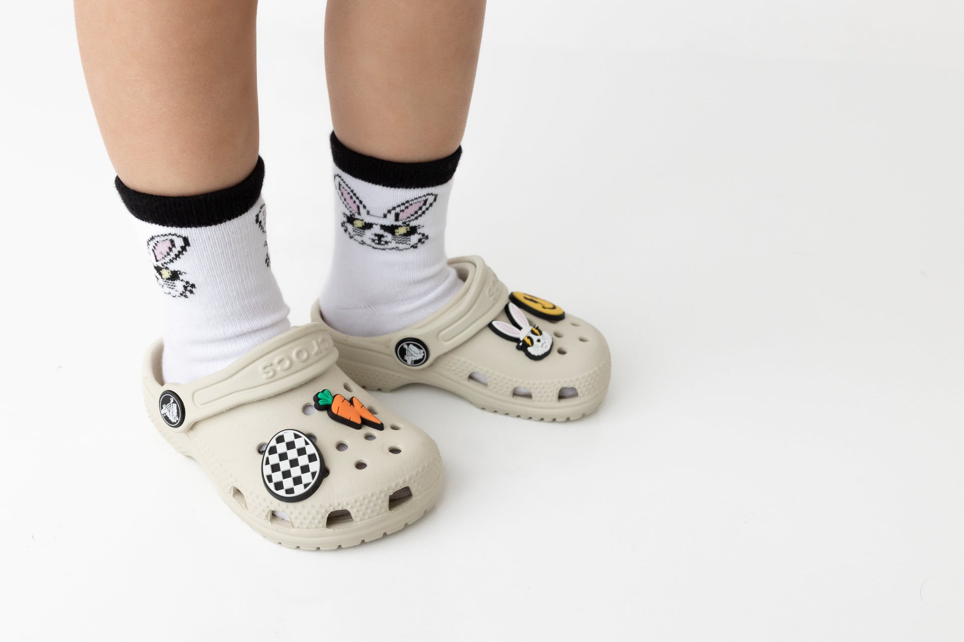 Sizes Infant, Extra Small, Small + Medium have Bunny Feet Grips, Size Large have pink stitched Bunny Feet on the bottom of the feet.