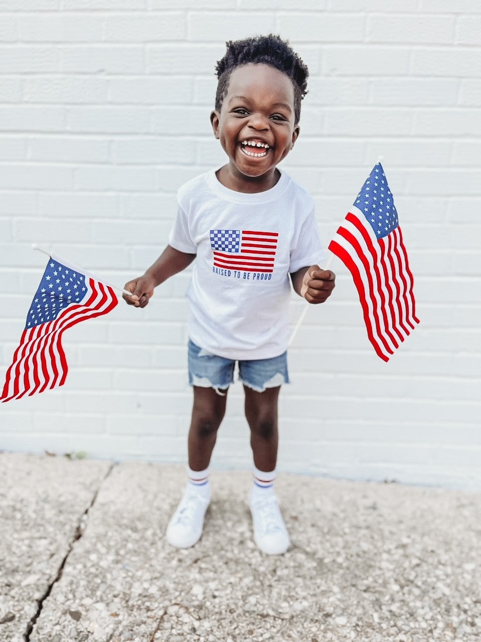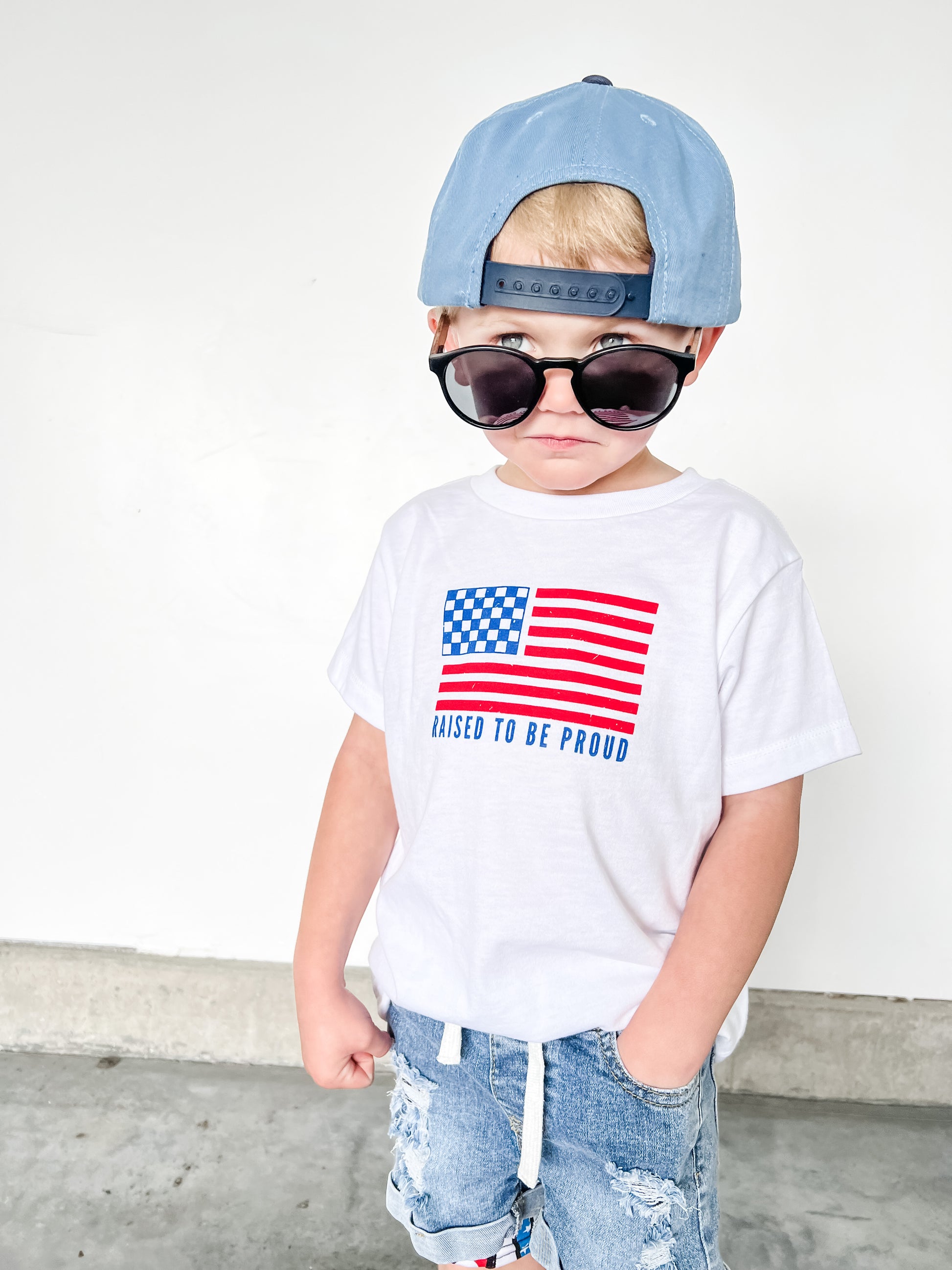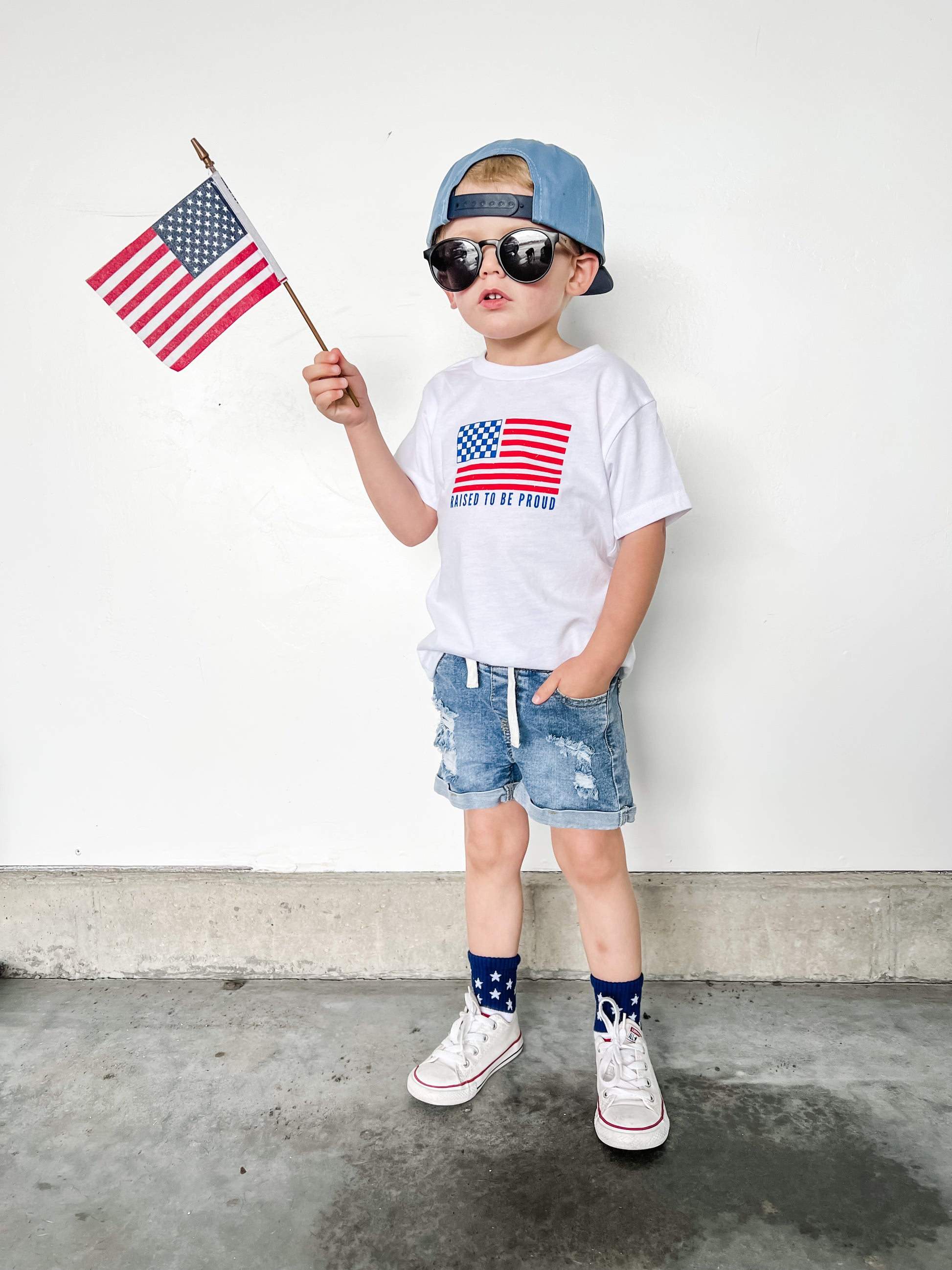Honor our country & celebrate our freedoms in style! Last year's best selling patriotic tee is back! Our "Raised to be Proud" tee is perfect for your little American.