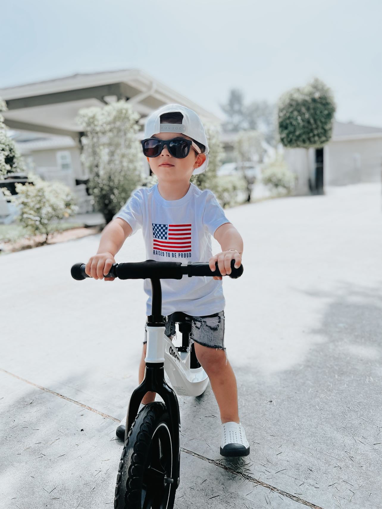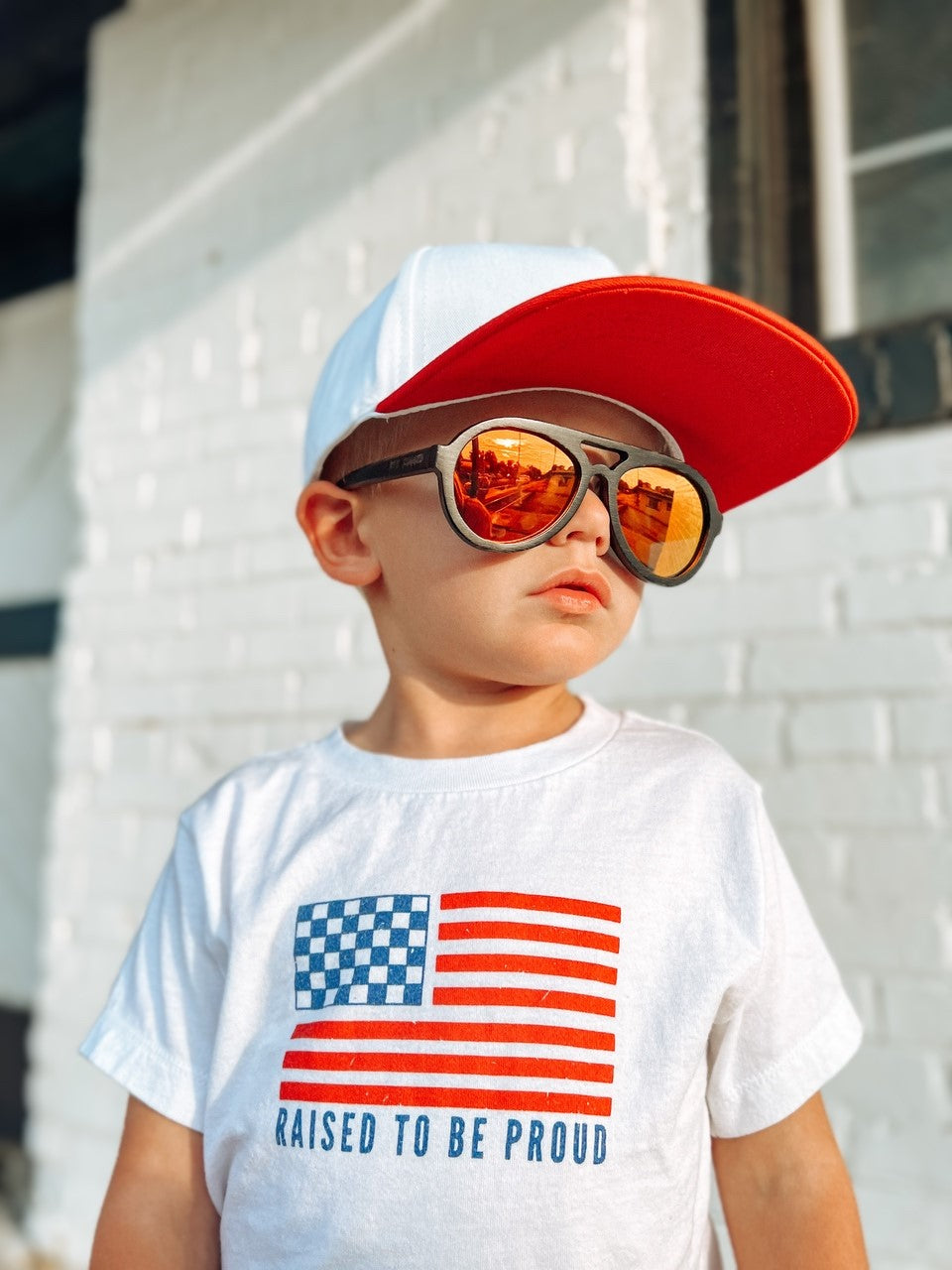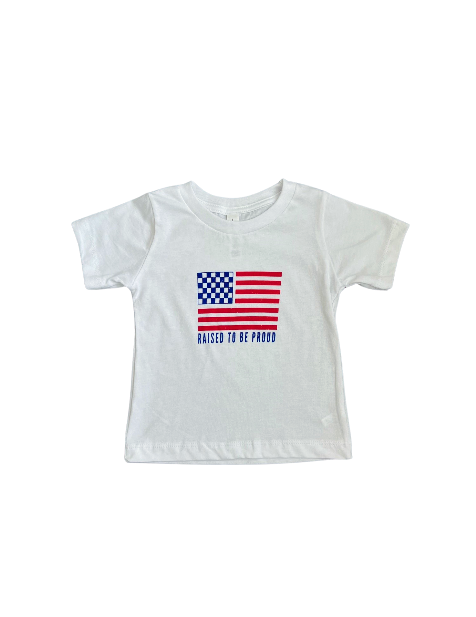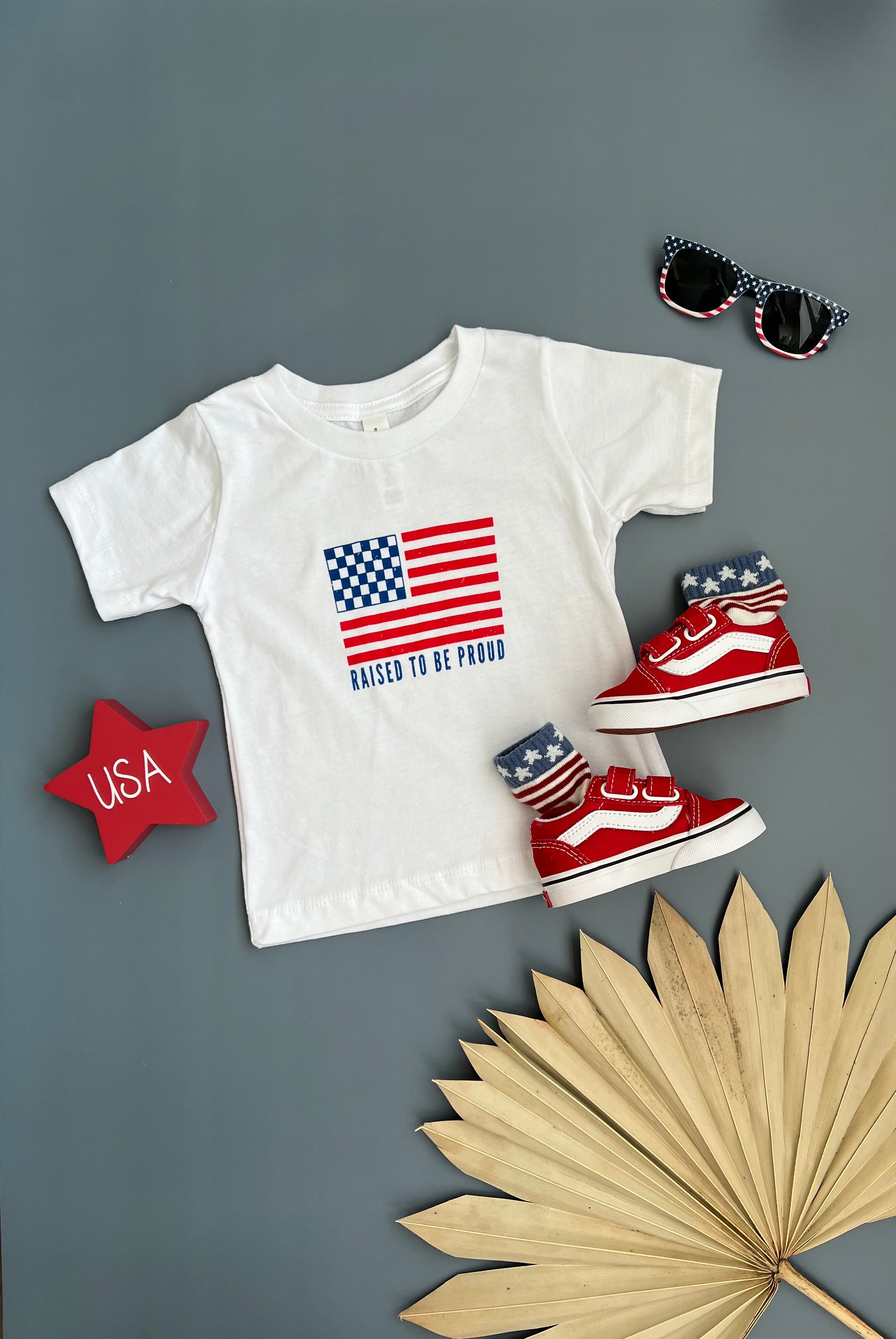 Honor our country & celebrate our freedoms in style! Last year's best selling patriotic tee is back! Our "Raised to be Proud" tee is perfect for your little American.