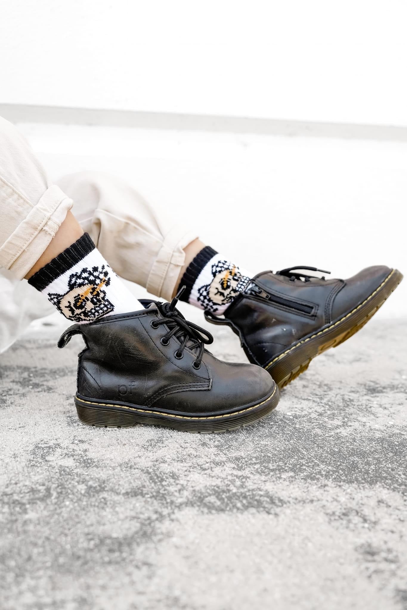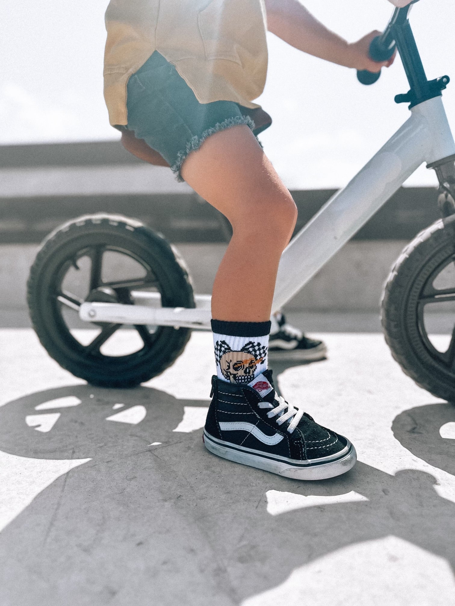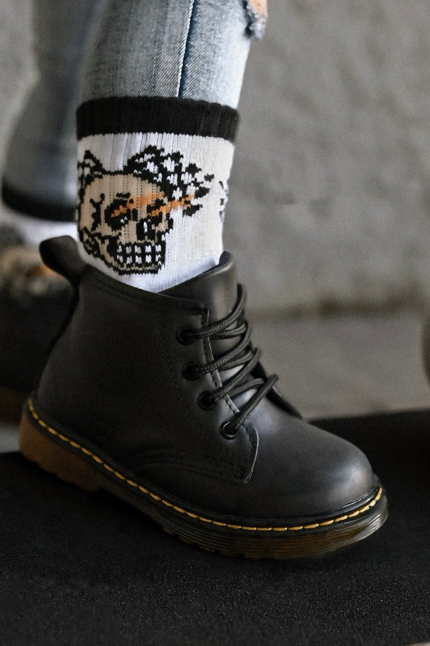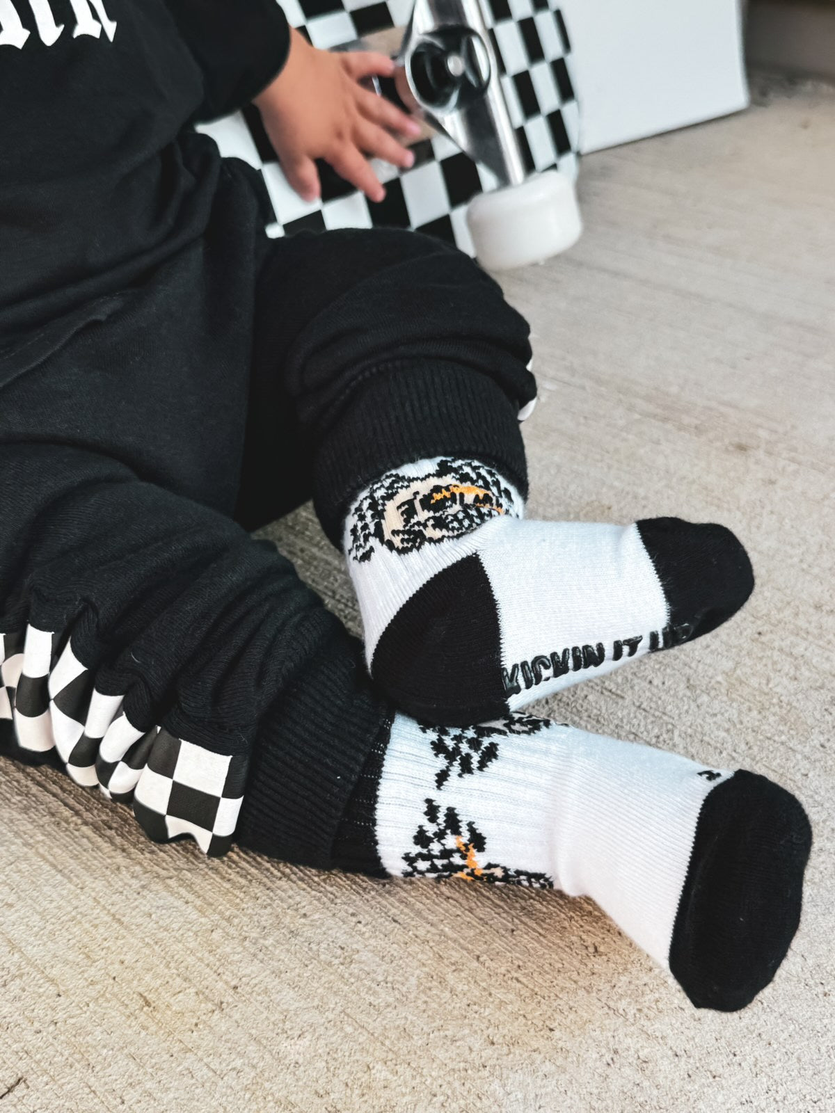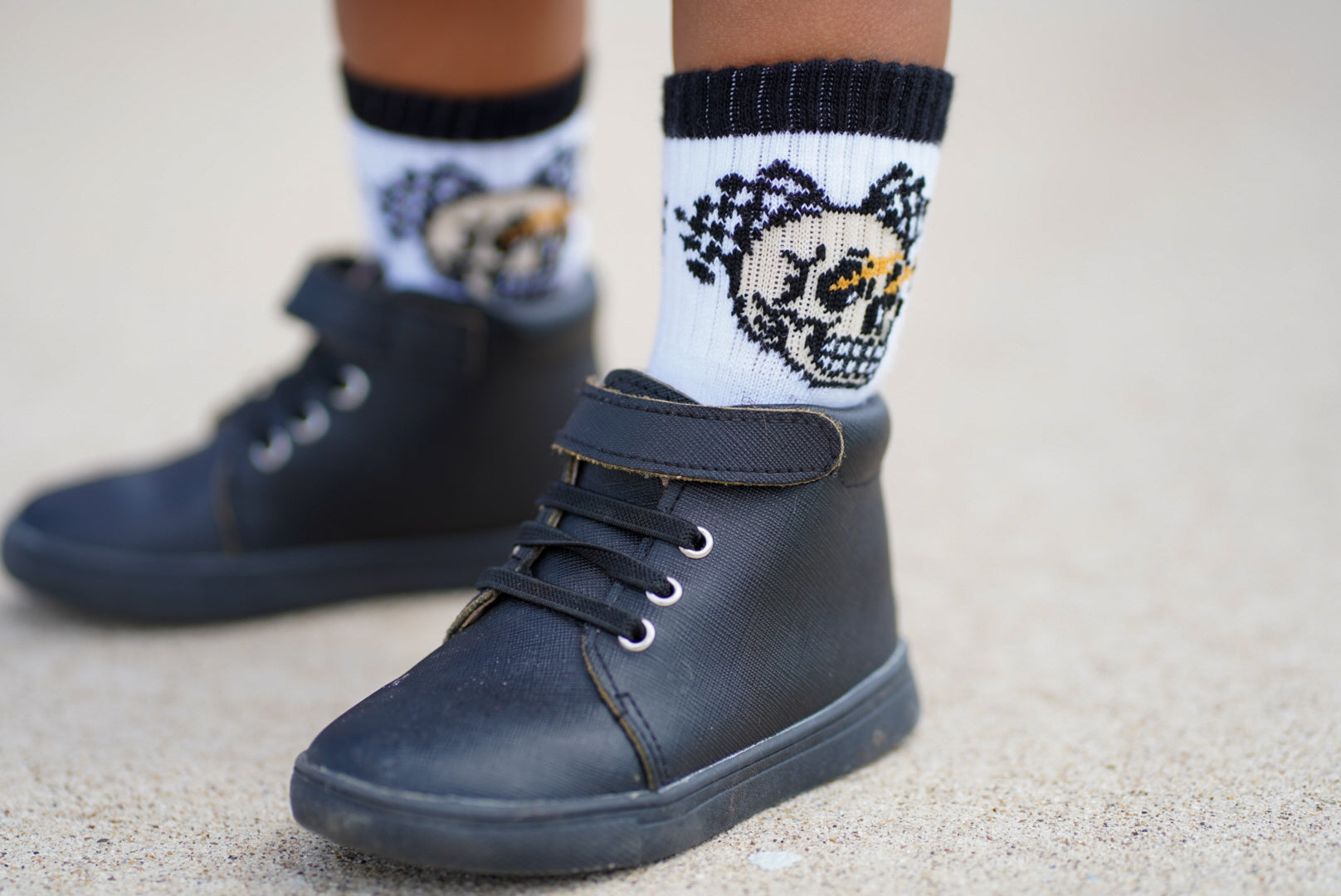 Sizes Infant, Extra Small, Small + Medium have "Kickin It Up" grips on the bottom of the feet and size Large has a stitched "Kickin It Up" on the bottom of the feet.