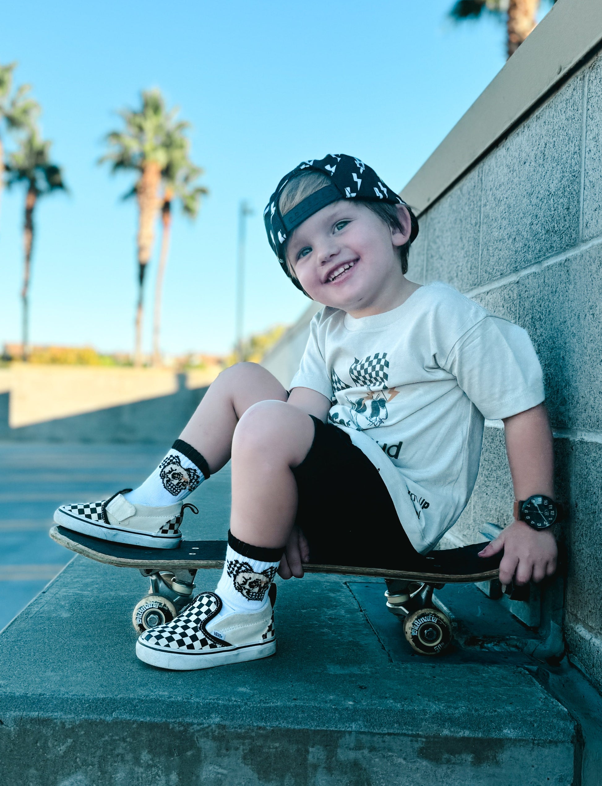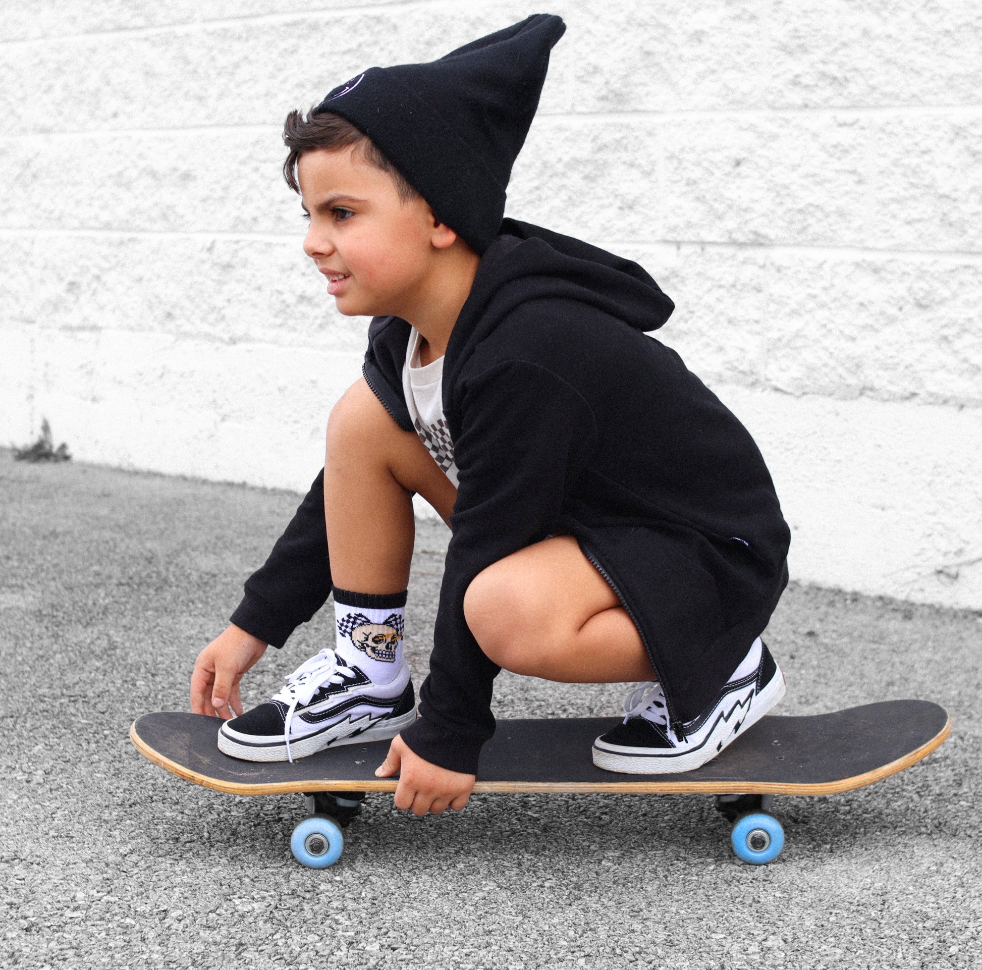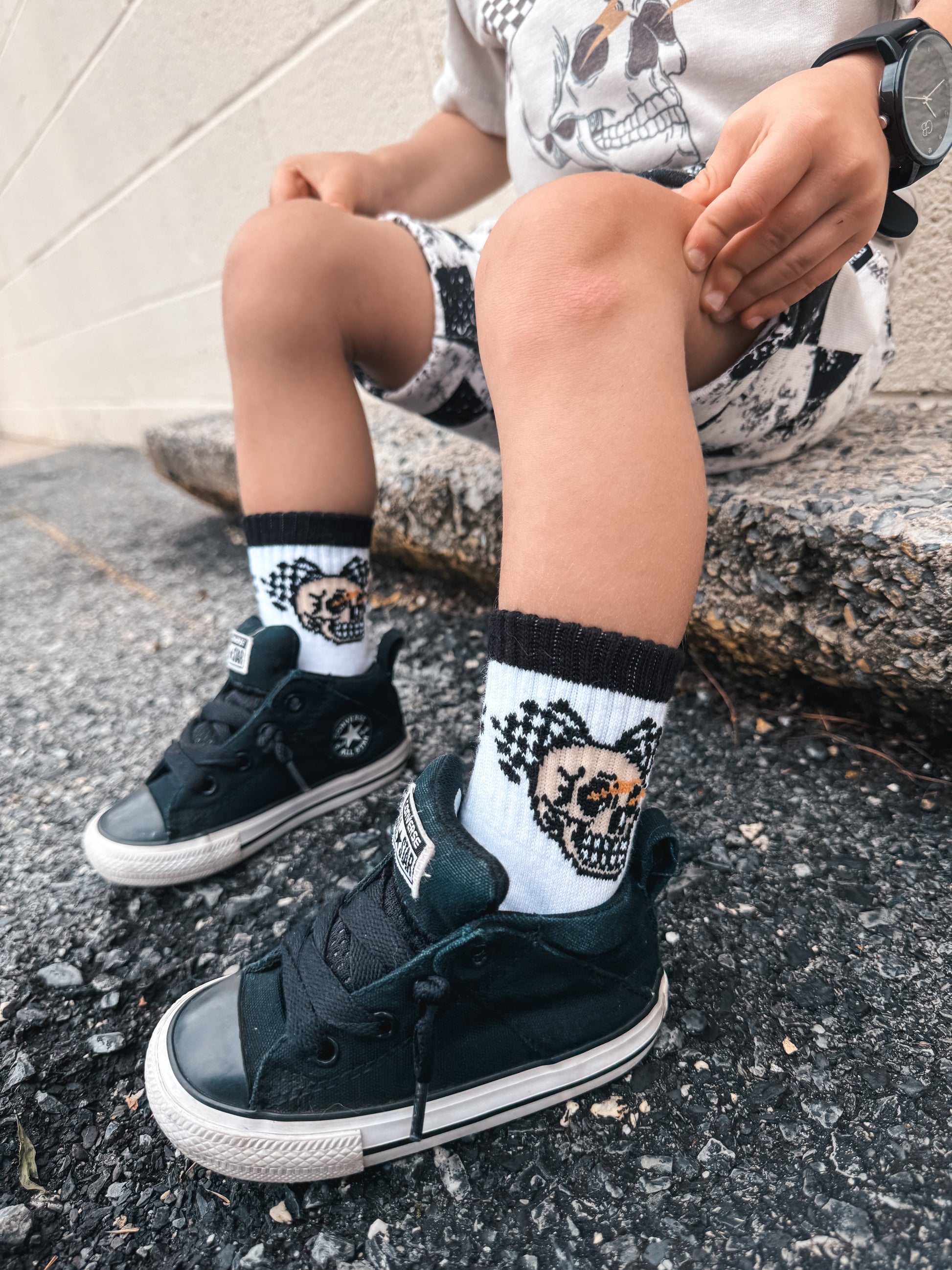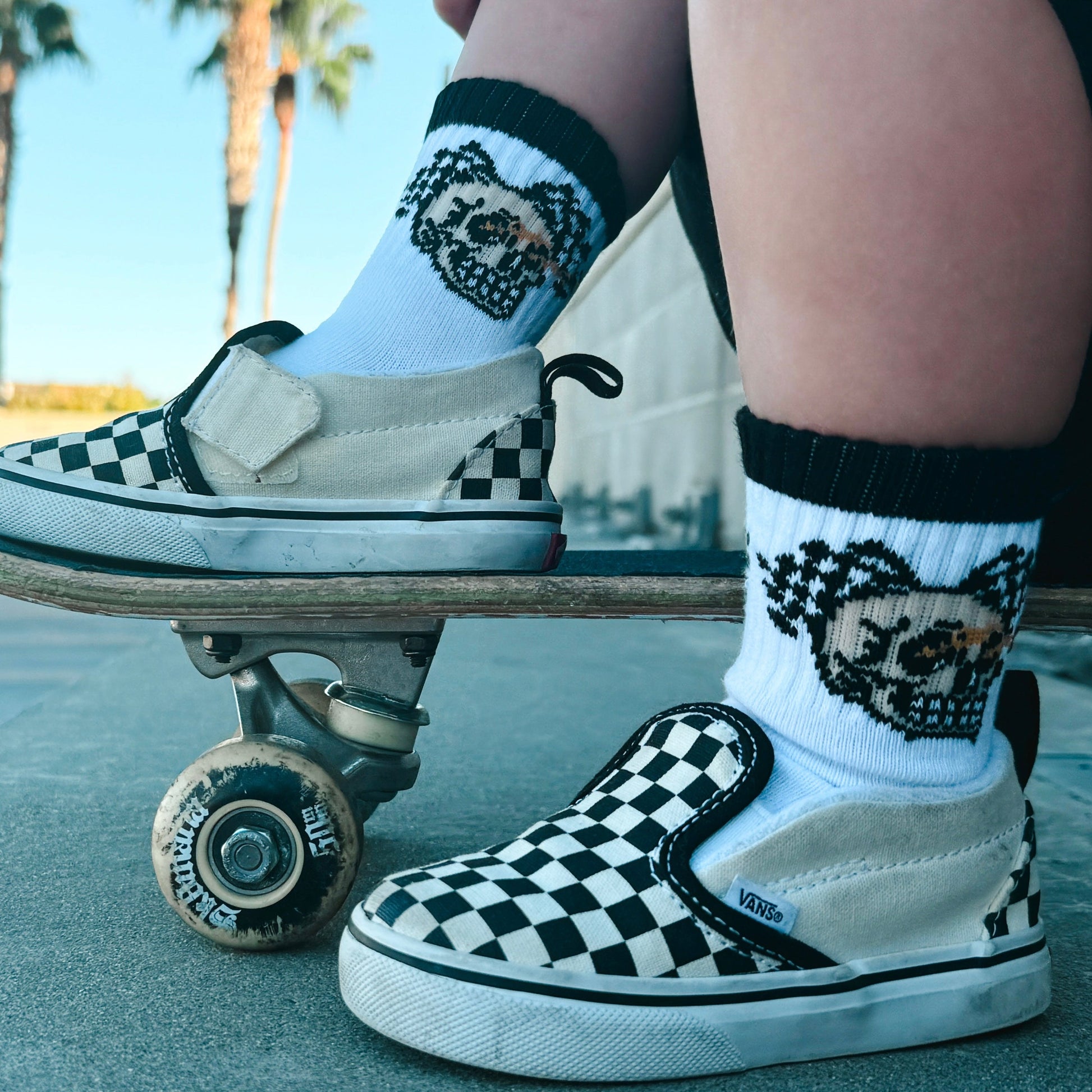Sizes Infant, Extra Small, Small + Medium have "Kickin It Up" grips on the bottom of the feet and size Large has a stitched "Kickin It Up" on the bottom of the feet.