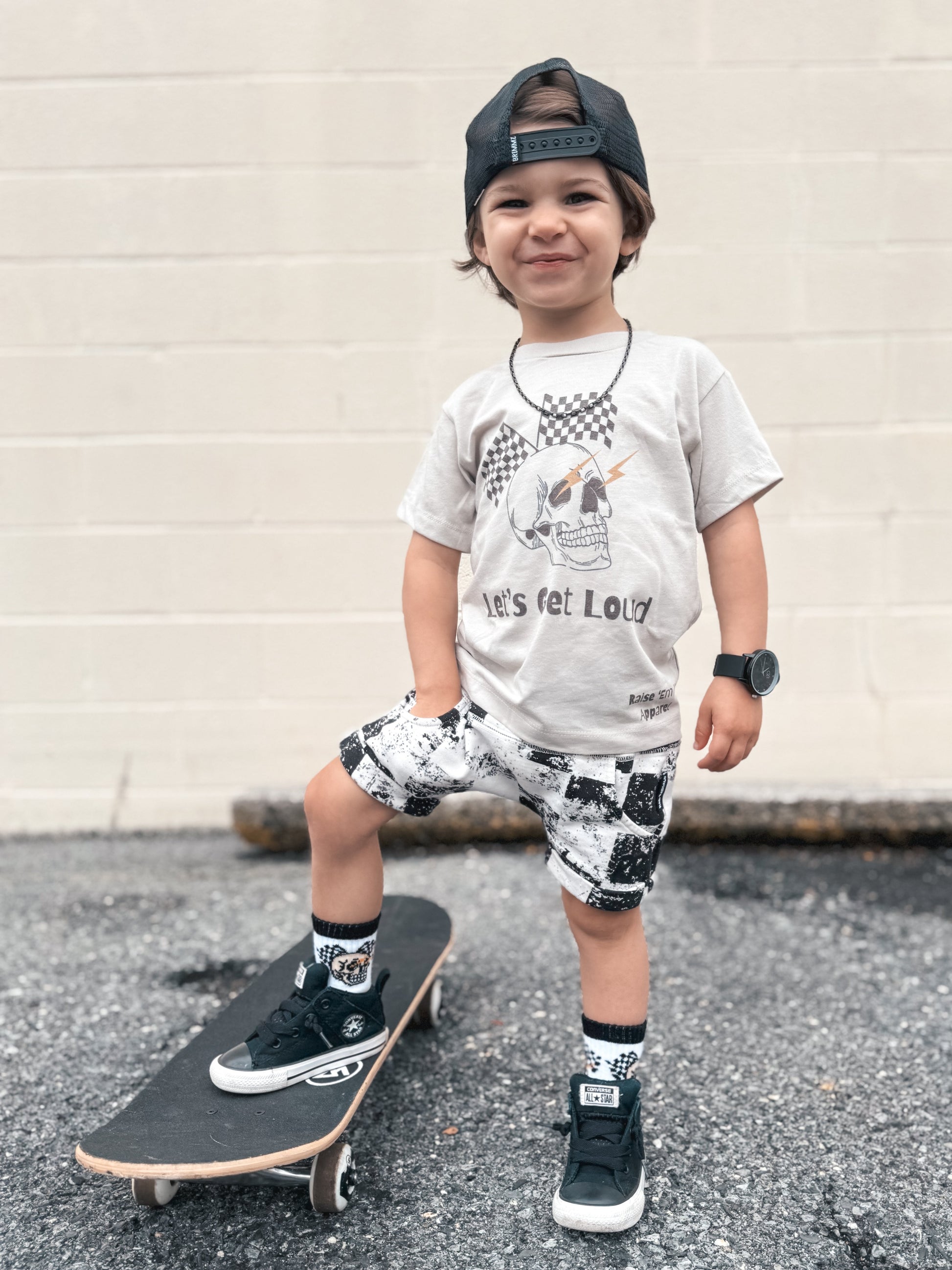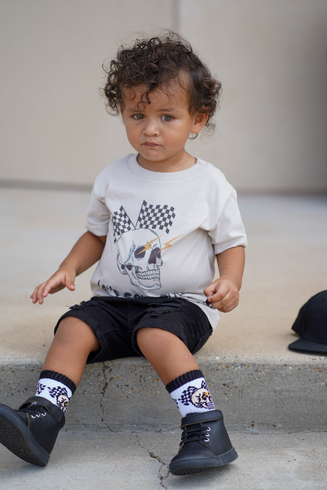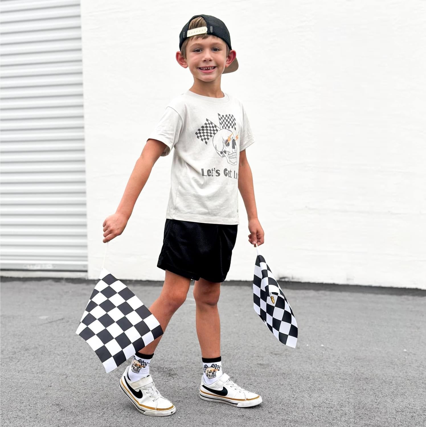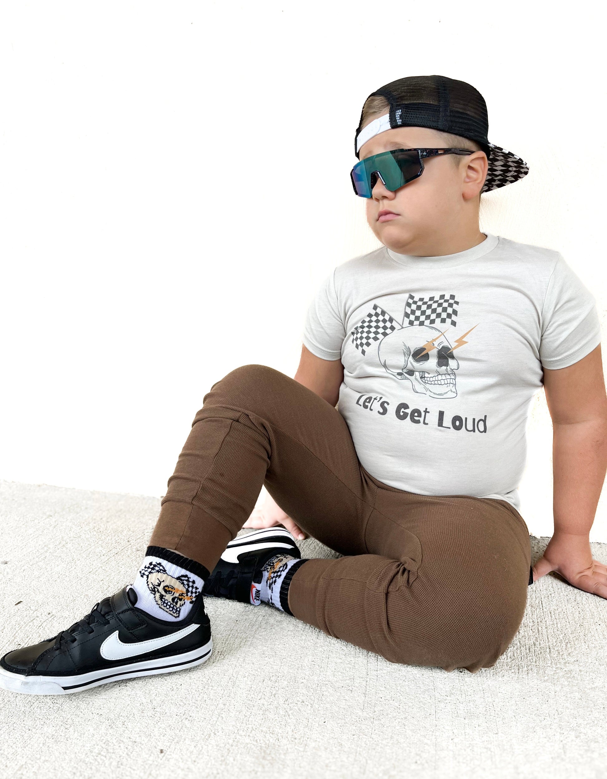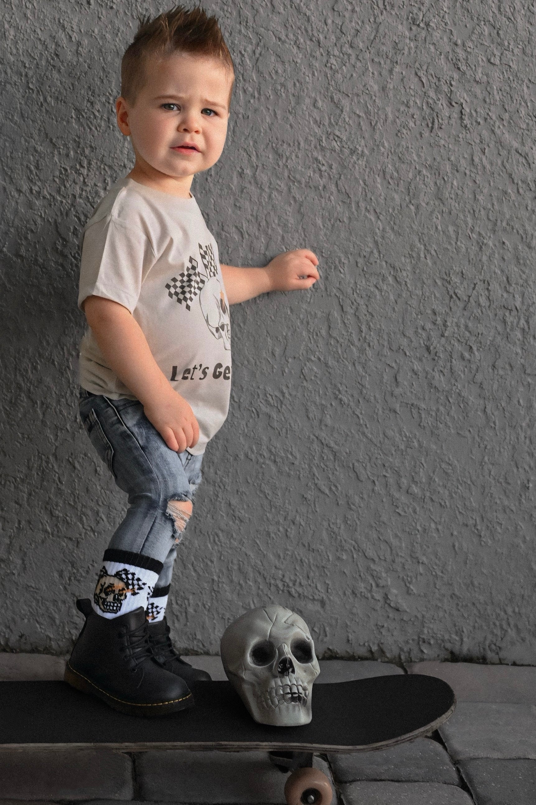 Sizes Infant, Extra Small, Small + Medium have "Kickin It Up" grips on the bottom of the feet and size Large has a stitched "Kickin It Up" on the bottom of the feet.