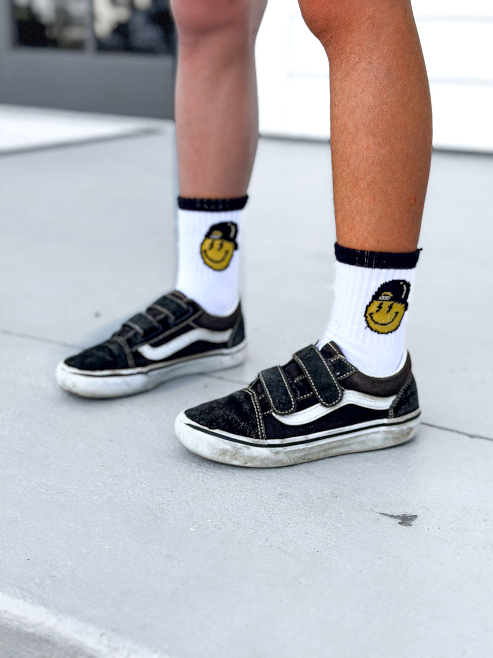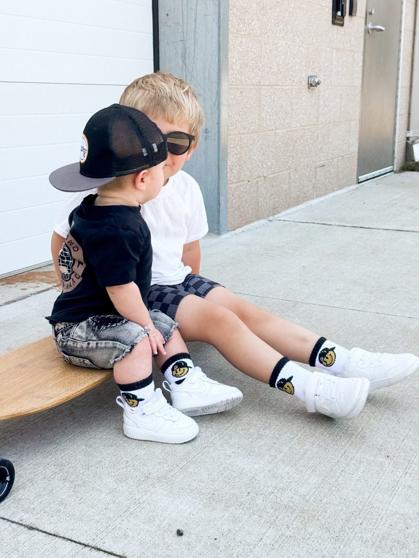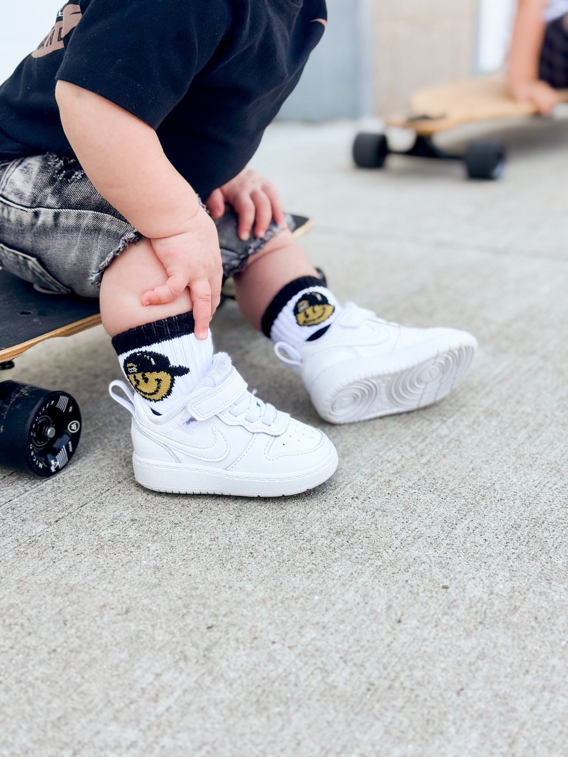 Sizes Infant, Extra Small, Small, Medium have logo grips on the bottom of the feet large have a stitched logo on the bottom of the feet.