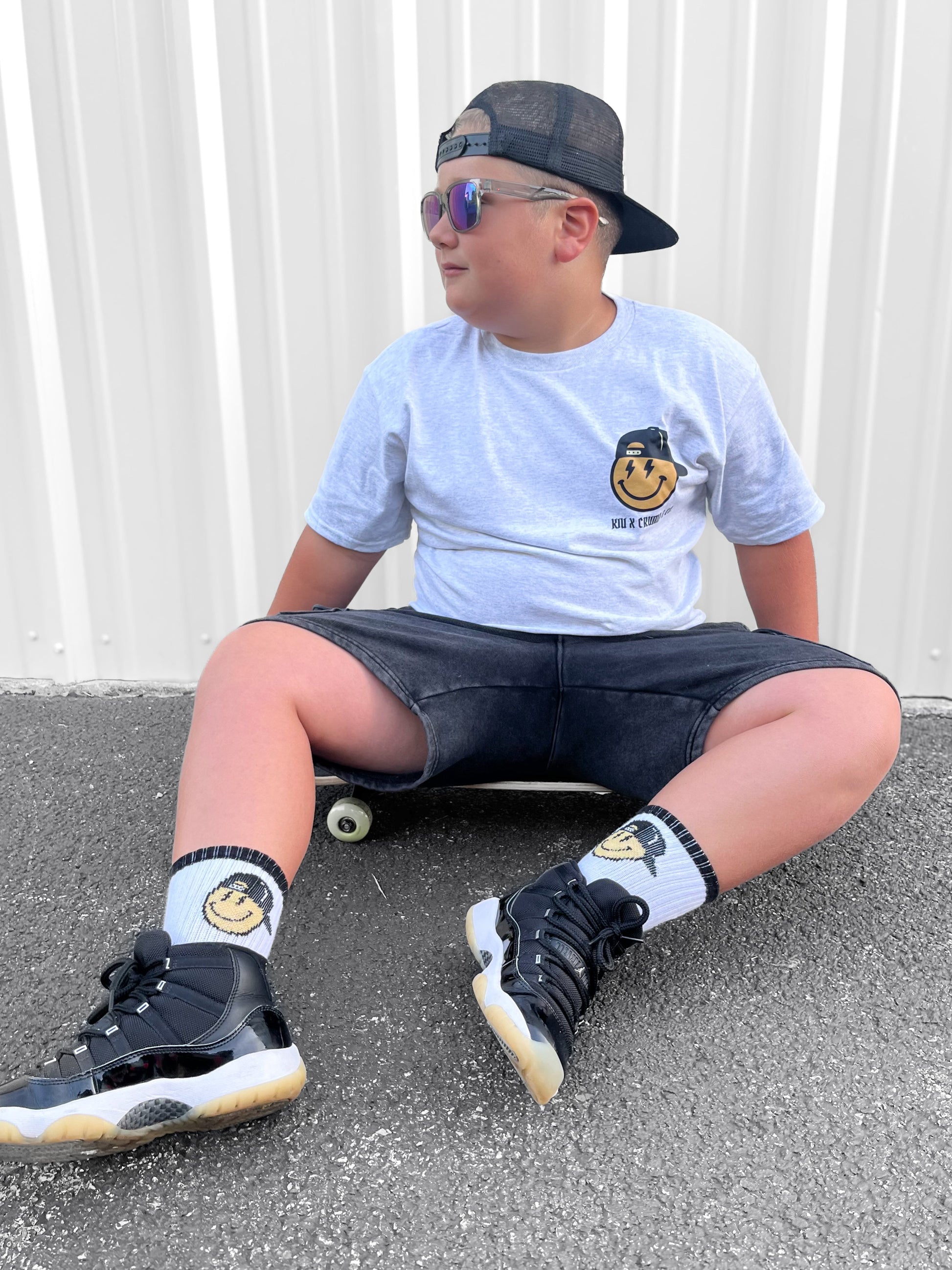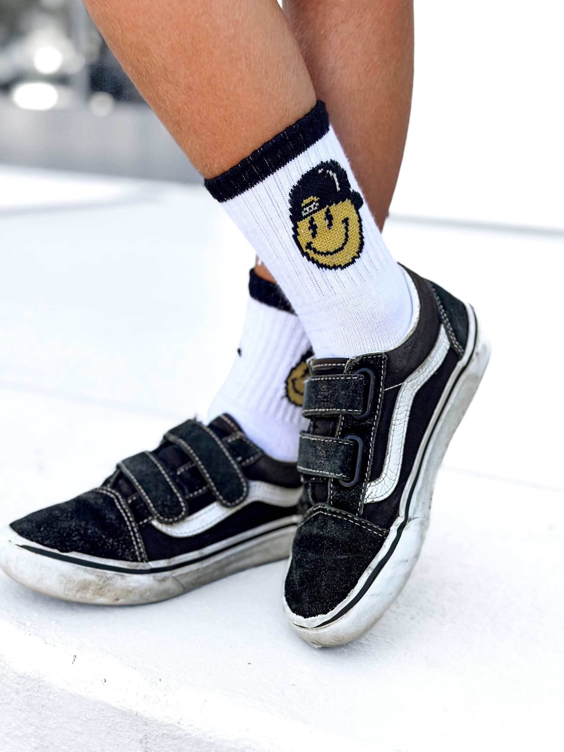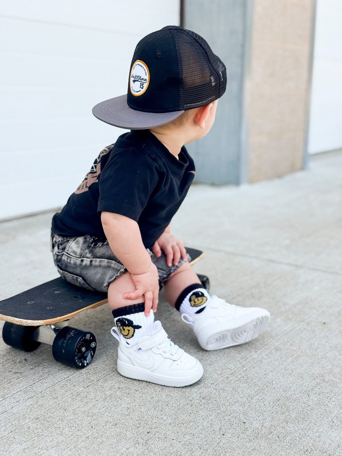 Sizes Infant, Extra Small, Small, Medium have logo grips on the bottom of the feet large have a stitched logo on the bottom of the feet.