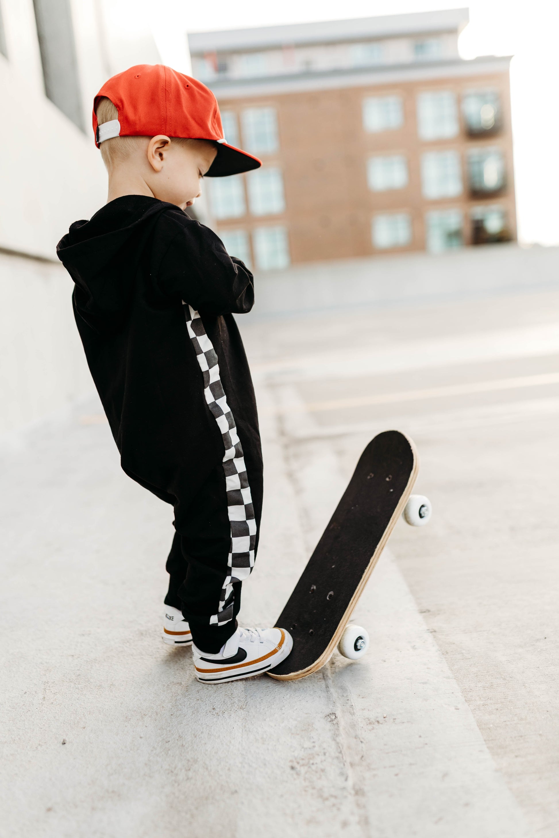 Rock a bold and playful look with this Side Check Zip-Up Hooded Romper. Featuring a side checkered design and a bolt pull zipper, this romper is sure to make a statement. Stay comfortable and stylish at the same time with this unique piece.