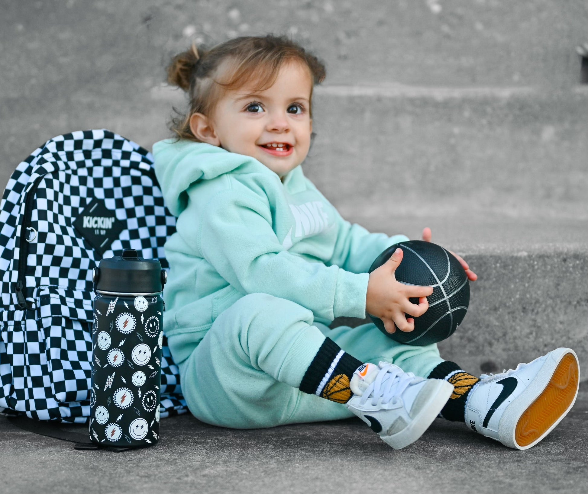 Sizes Infant, Extra Small, Small + Medium have "Slam Dunk" grips on the bottom of the feet and size Large has a stitched "Slam Dunk" on the bottom of the feet.