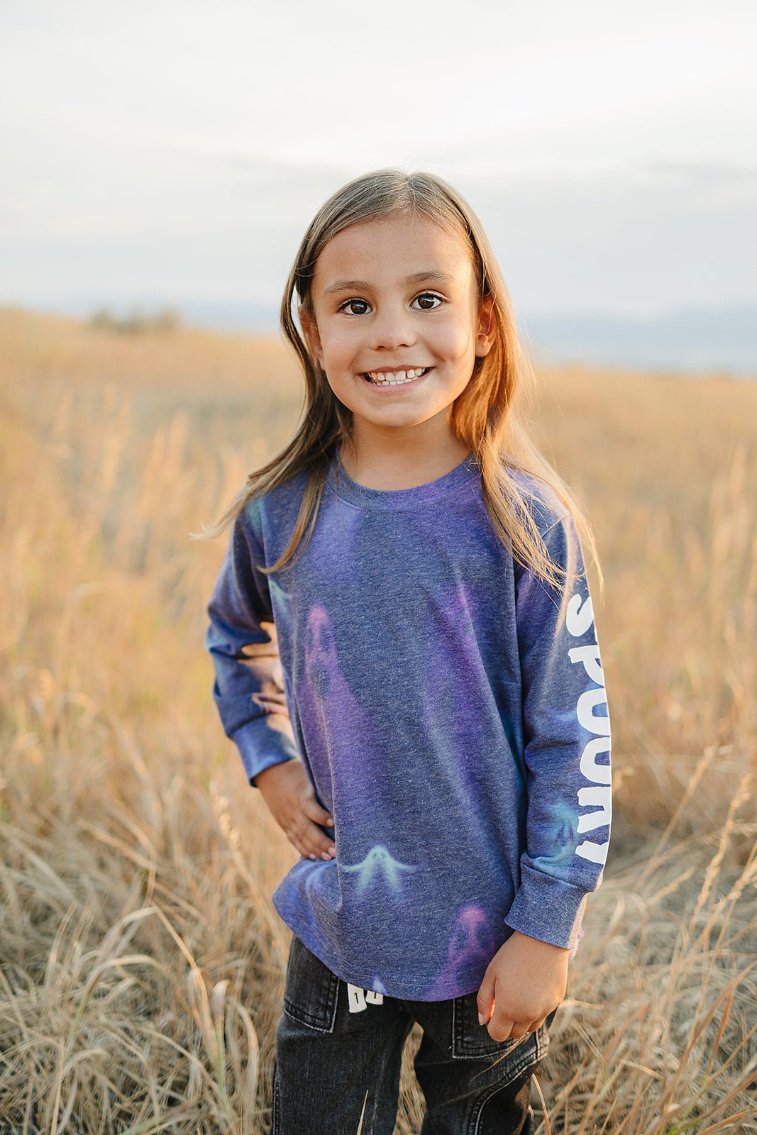 Get ready for Halloween fun with the Spooky Long Sleeve tee! Featuring faded ghosts that float all around and a playful "Spooky" graphic down the sleeve, this tee captures the festive spirit perfectly. The drop hem offers extra coverage for active little ones, while the super soft fabric keeps them cozy and comfortable during every adventure. A perfect playful pick for the season!