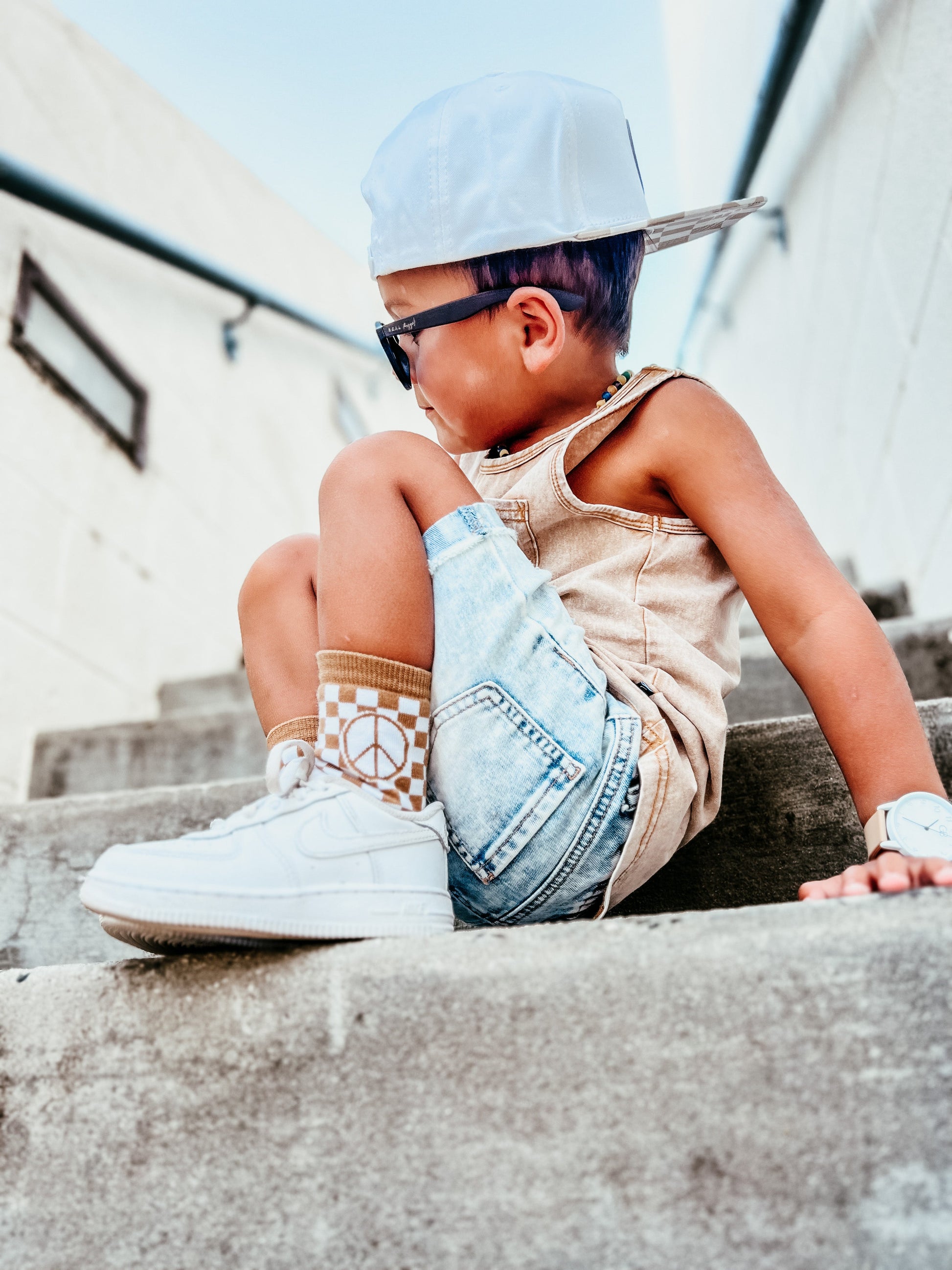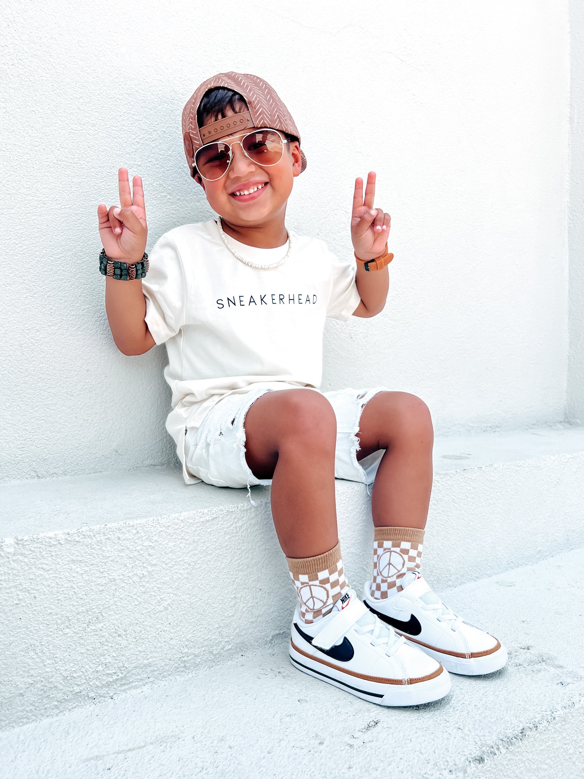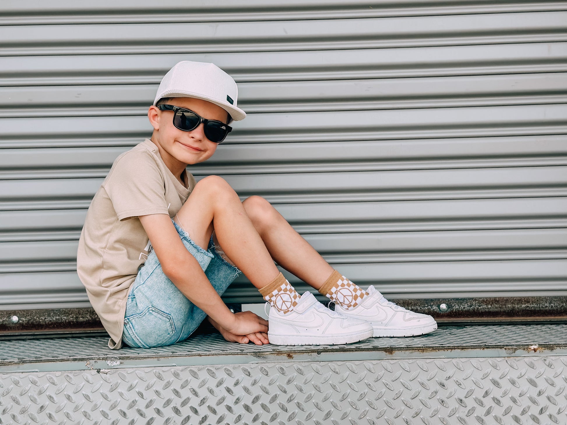 Sizes Infant/XXS, Extra Small, Small + Medium have logo grips on the bottom of the feet and size large have a stitched logo on the bottom of the feet.