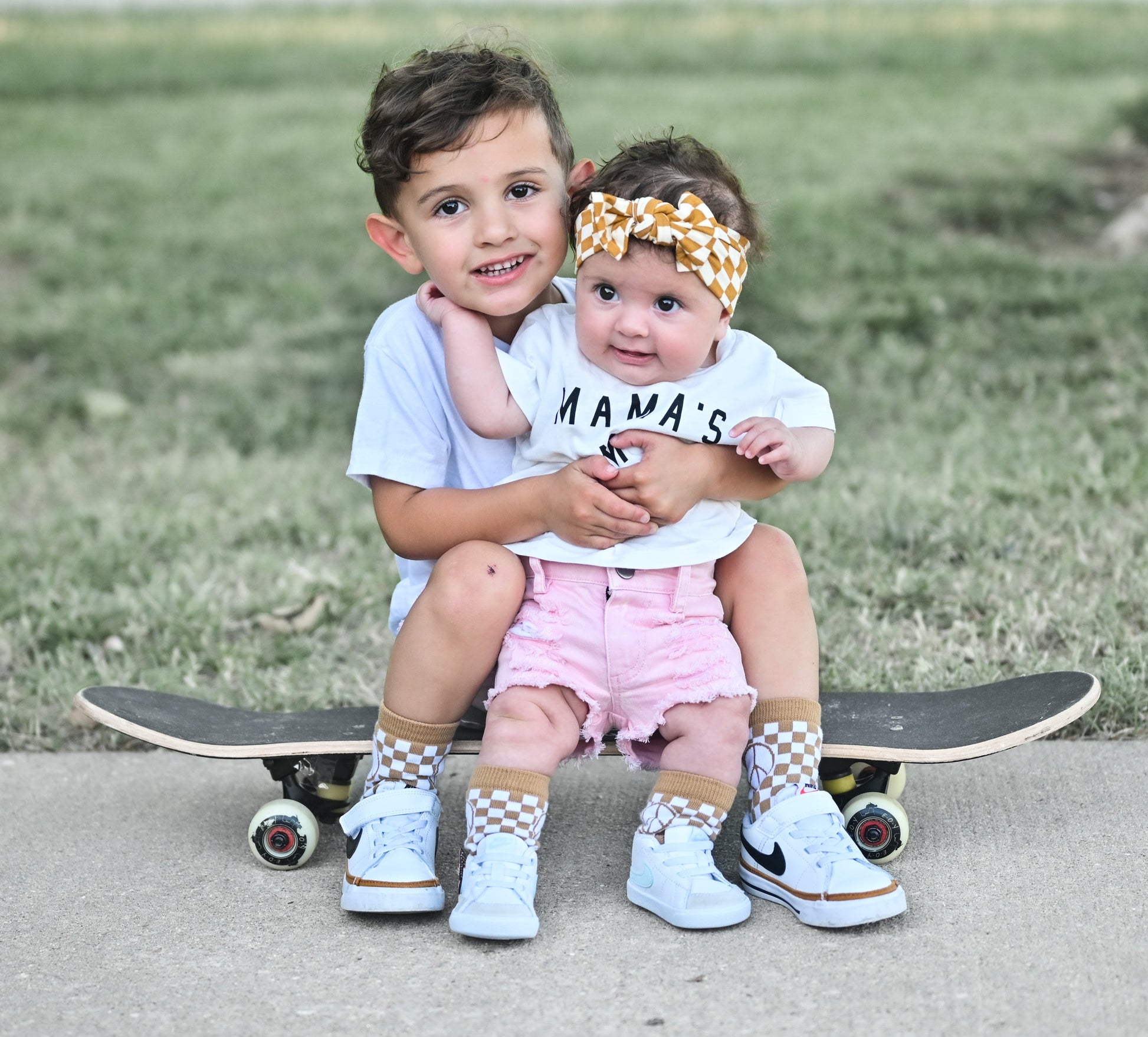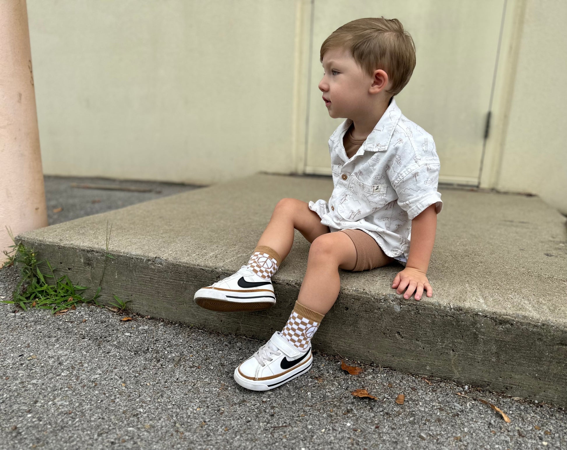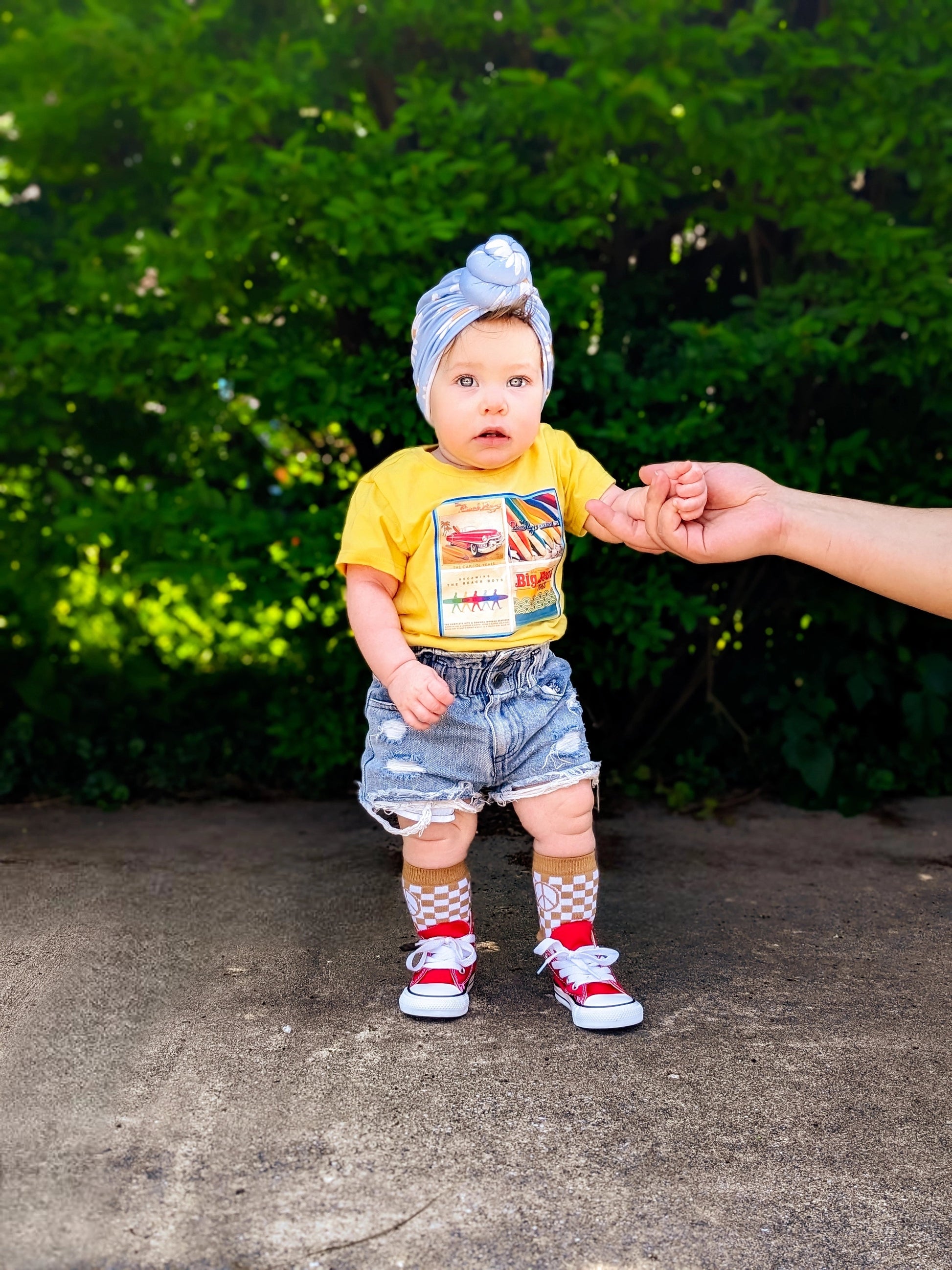 Sizes Infant/XXS, Extra Small, Small + Medium have logo grips on the bottom of the feet and size large have a stitched logo on the bottom of the feet.