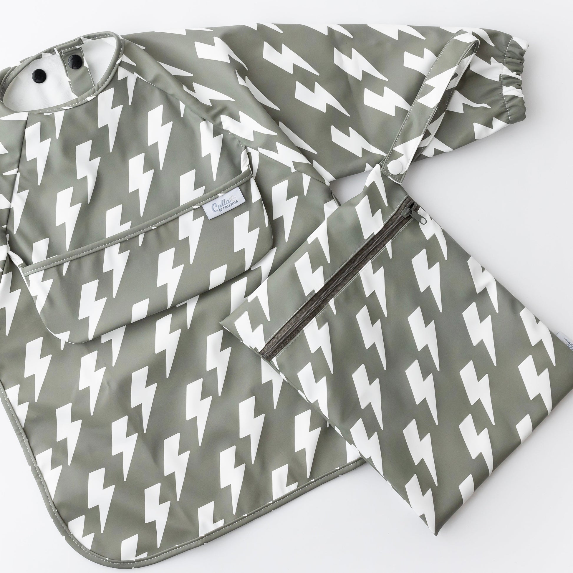 Perfect for your little one's meal-time, water table adventures, messy crafts, or any other time you want to keep those cute clothes clean. Not only do these long sleeve bibs match all of their cute clothes, they’re also highly functional. Each bib comes in a matching wet/dry bag making it perfect for on the go. Simply place your dirty bib back in its bag & keep your diaper bag clean. With their waterproof design and catch-all pocket, they effortlessly keep your baby's clothes clean and dry. The pocket even folds under to fold flat when not needed for crafts or sensory tables. The multi-snap neck closure & elastic cuffs ensure a secure and adjustable fit that grows with your little one, making them perfect for every stage of their development.