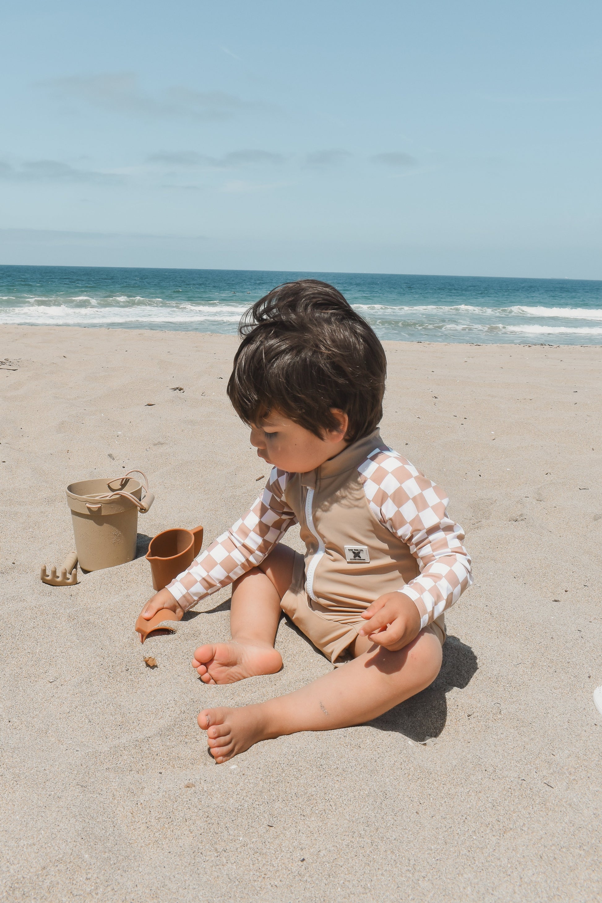 Meet your beach day MVP: the Rad Toddler Dune Checkers One-Piece Rashguard in cool beige with crisp white checker sleeves. This isn't your average swimwear—it's made to move, protect, and look ridiculously good doing it. With built-in UPF 50+ sun protection, your little one stays shielded from harsh rays, while the front zipper makes for quick changes (because no one has time for tugging wet swimwear).