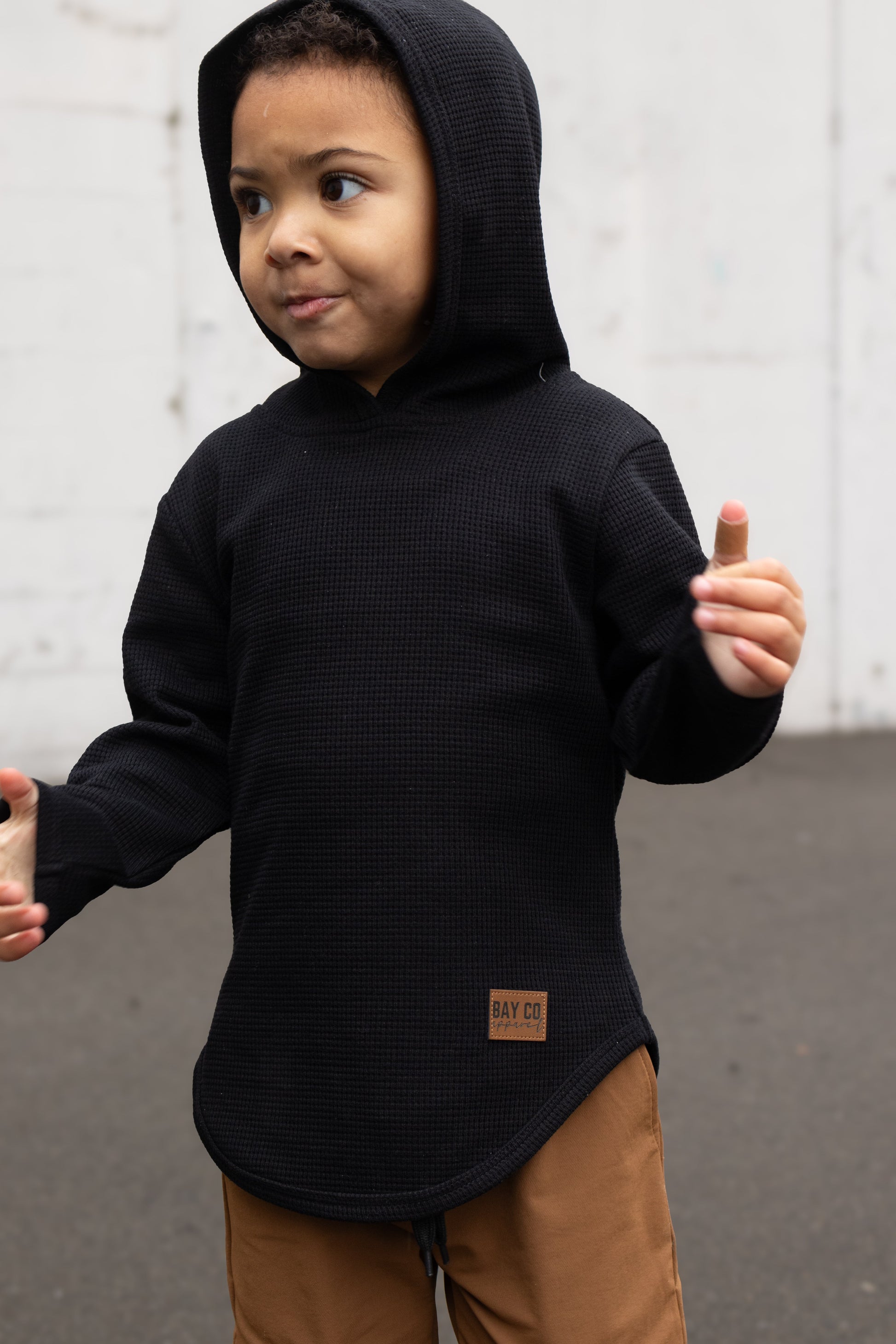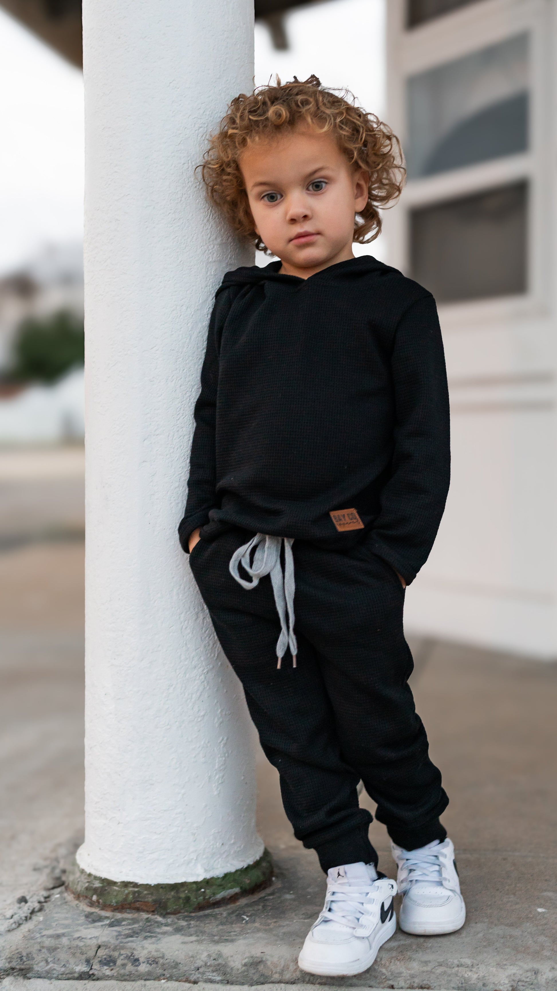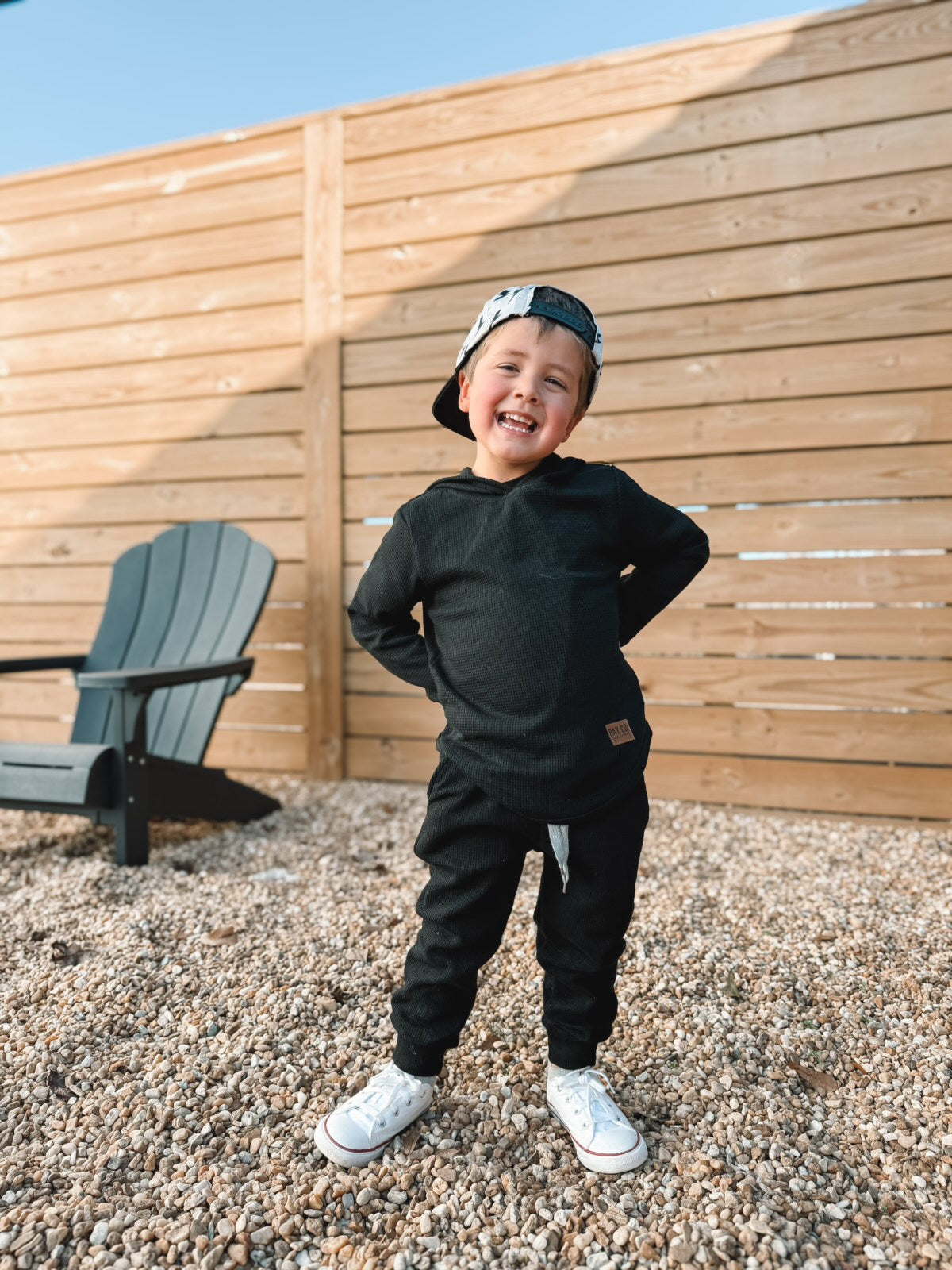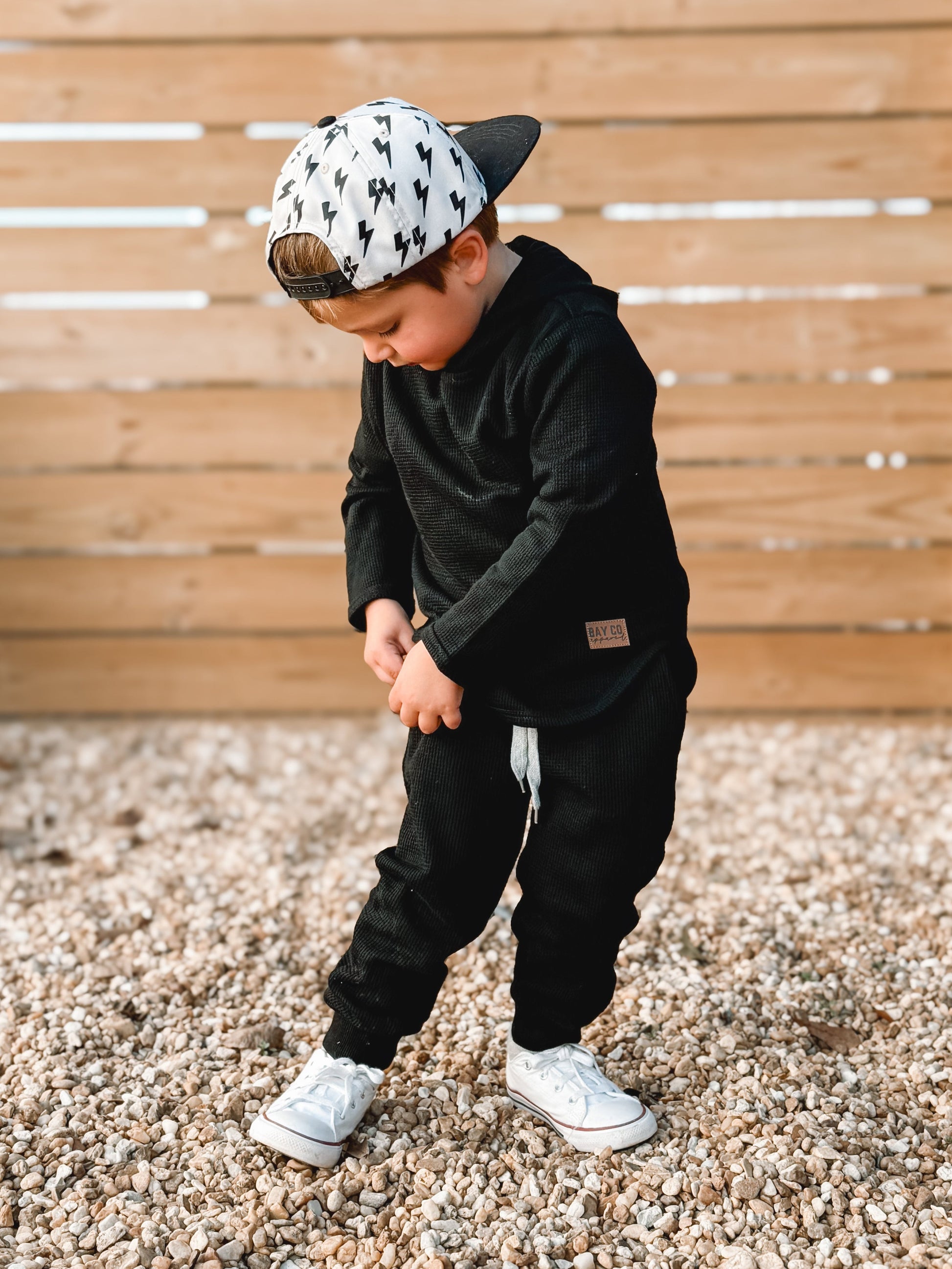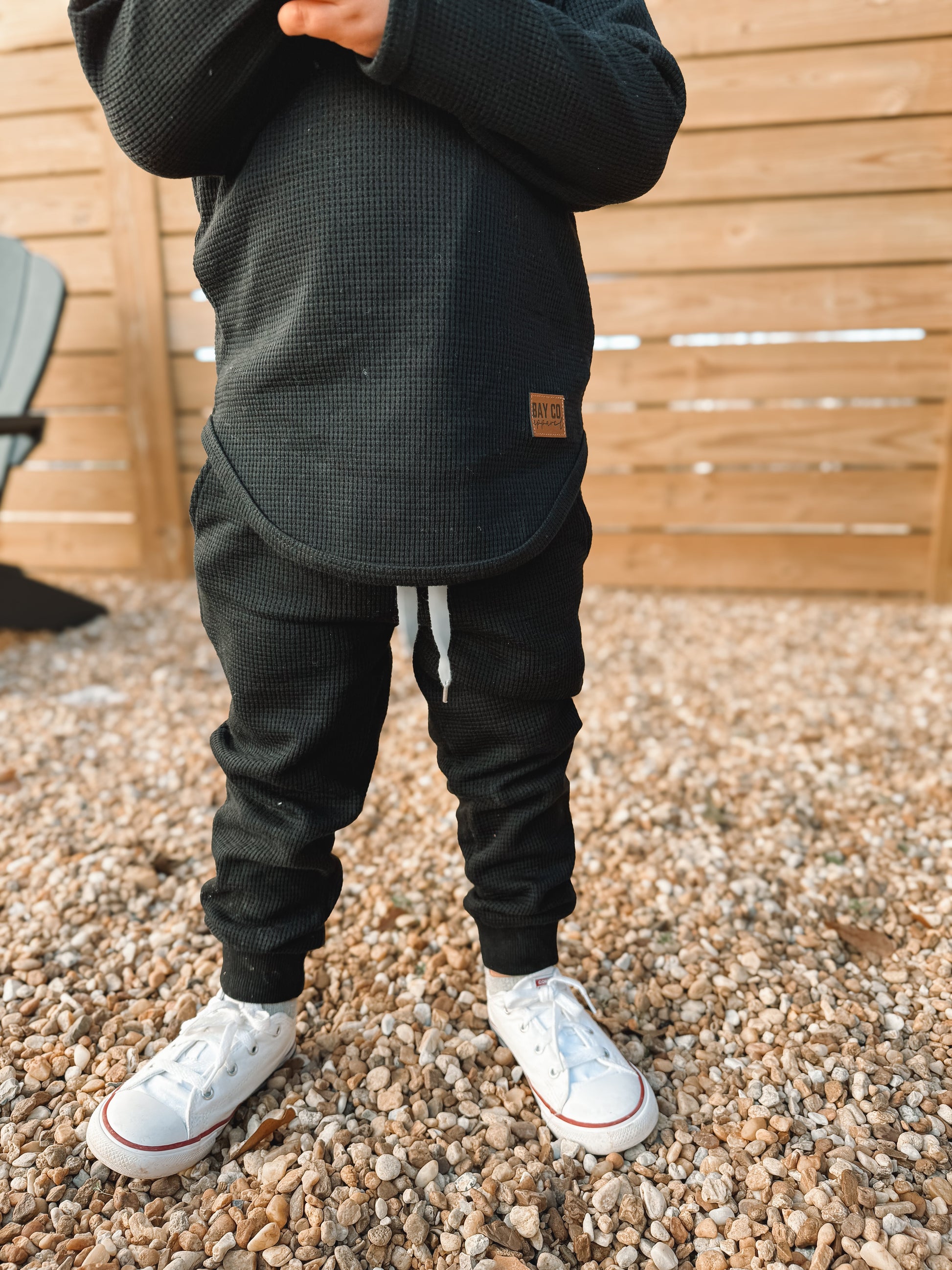 The return of our best-selling hooded waffle sets. Silky soft waffle blend set accented with our leather Bay Co. logos on both the top and bottoms. Slim fit, cozy, and your guaranteed go-to. We promise this will be dad’s pick every time they’re in charge of picking the outfit! Easy, functional drawstring with double stitching so no lost strings. Pair with other Bay Co. items for the perfect layering.