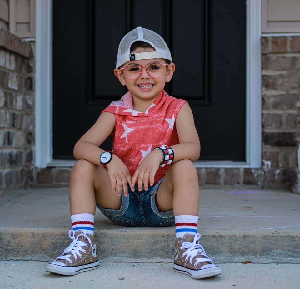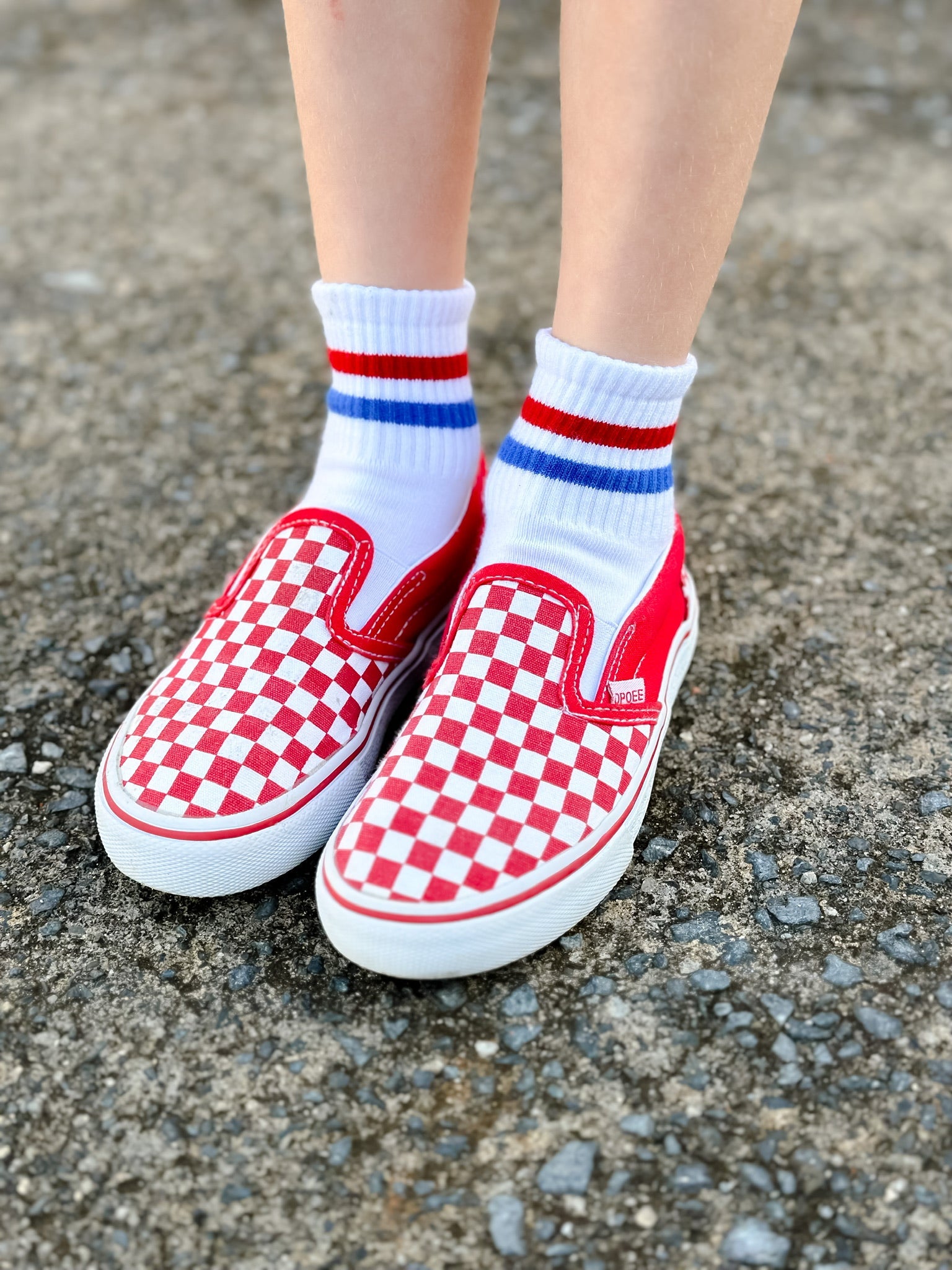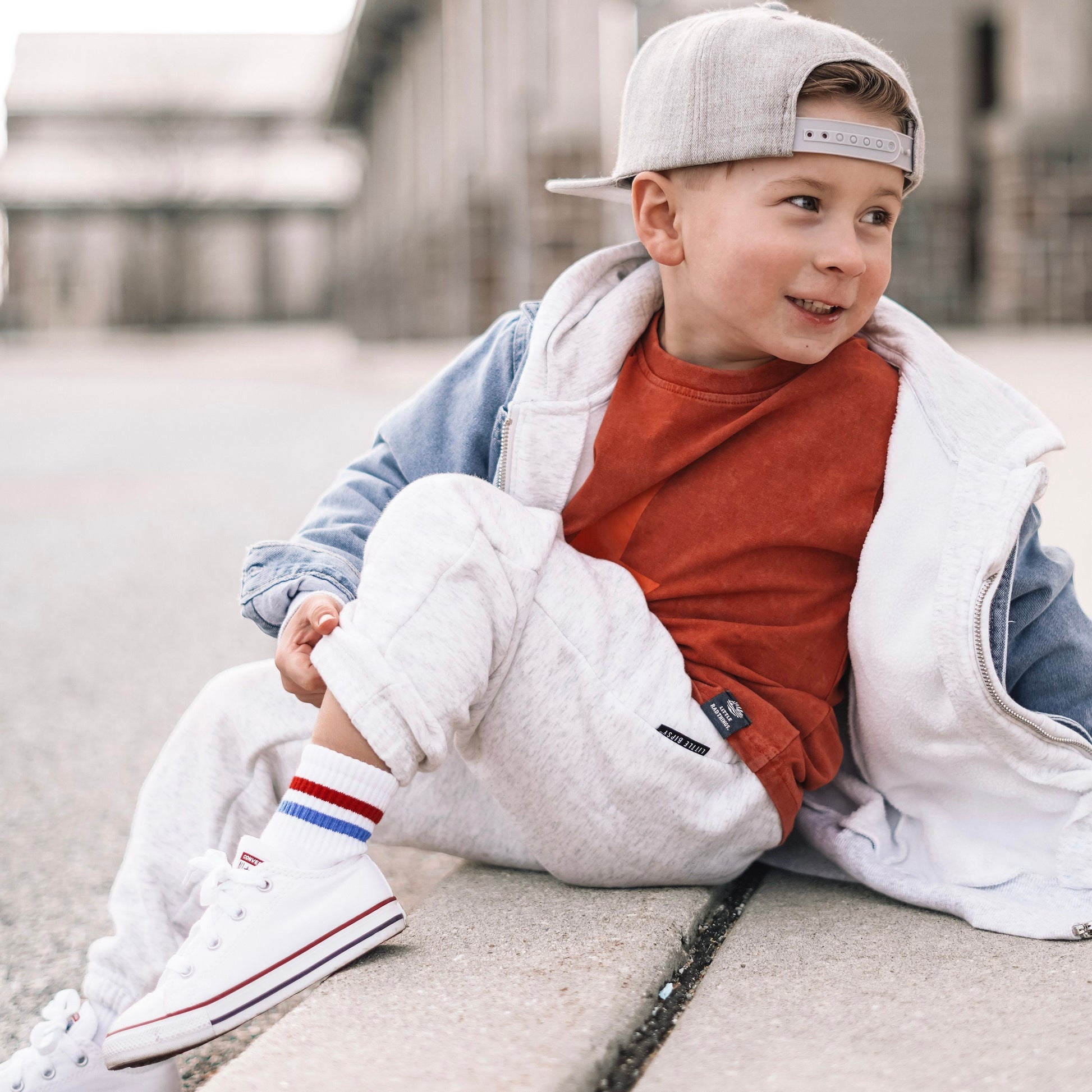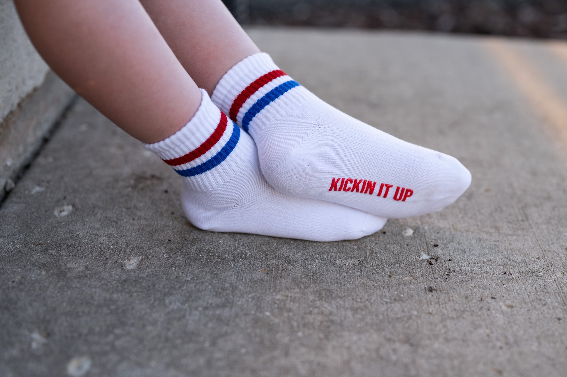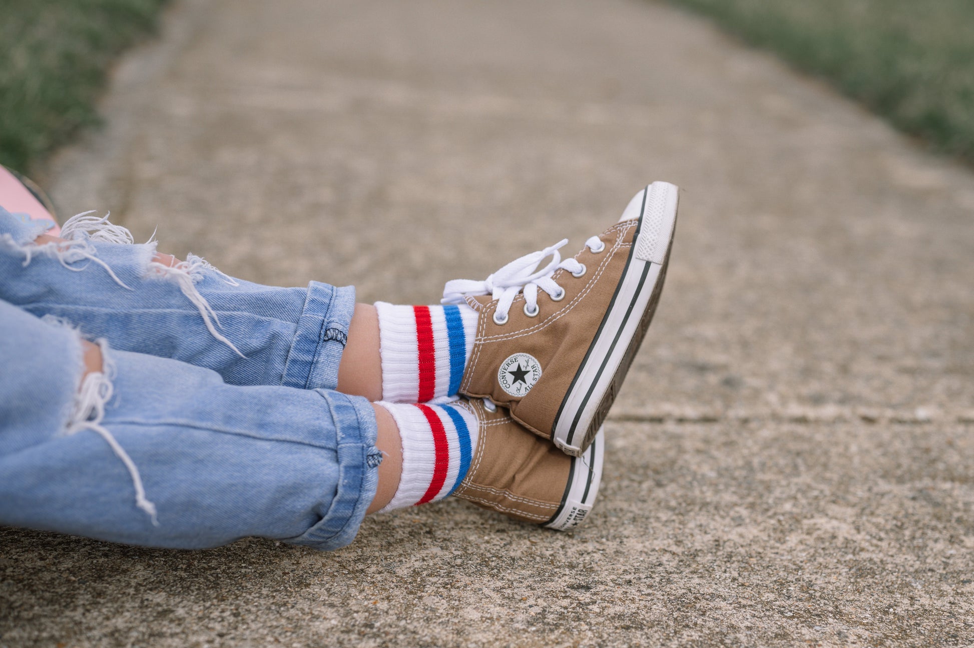 Sizes Infant/XXS, Extra Small, Small + Medium have logo grips on the bottom of the feet and size large have a stitched logo on the bottom of the feet.