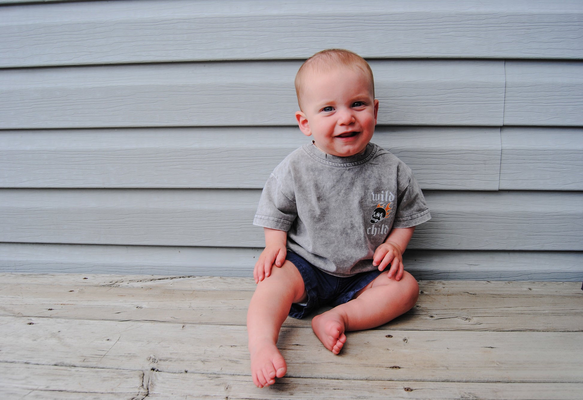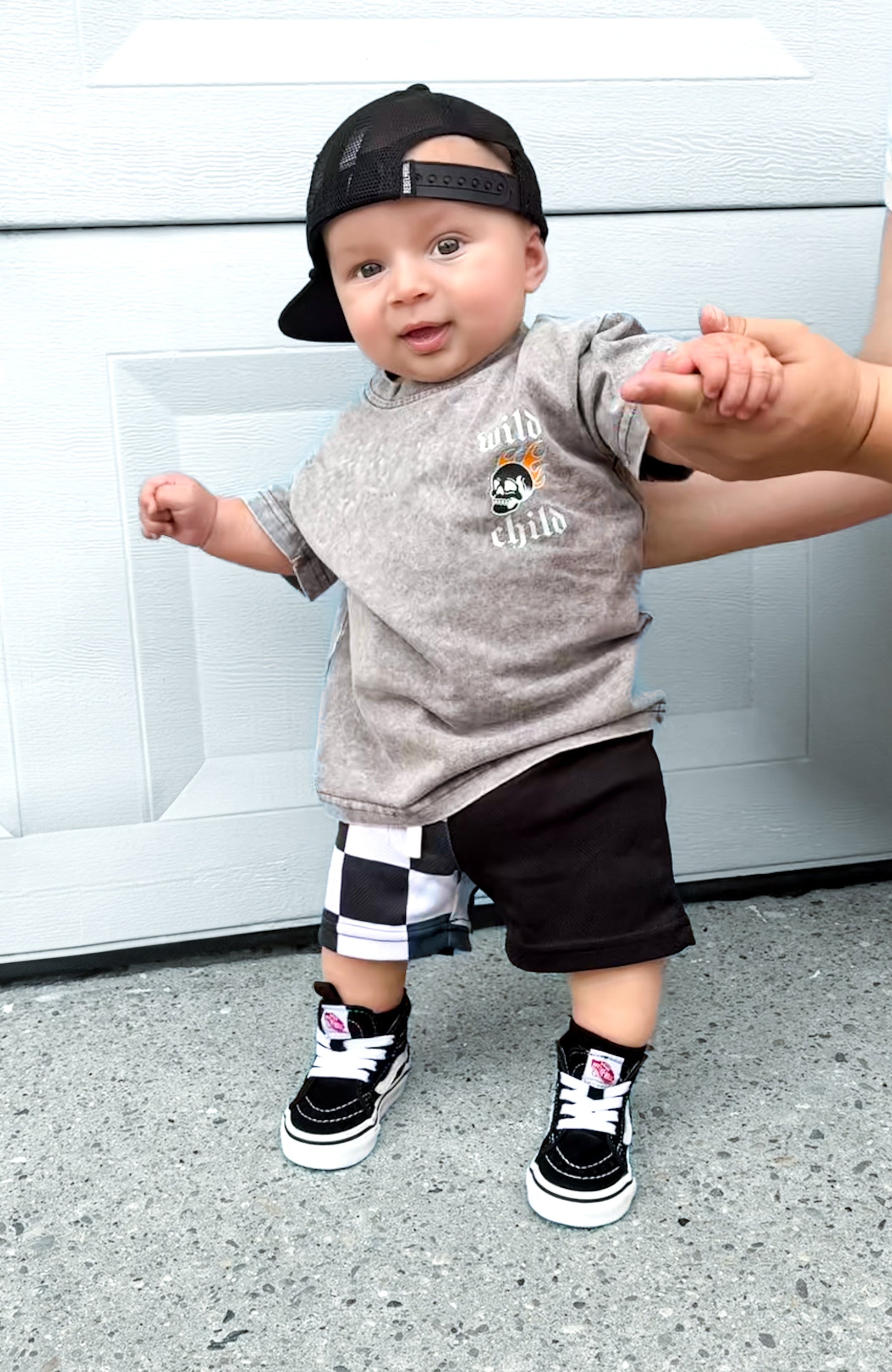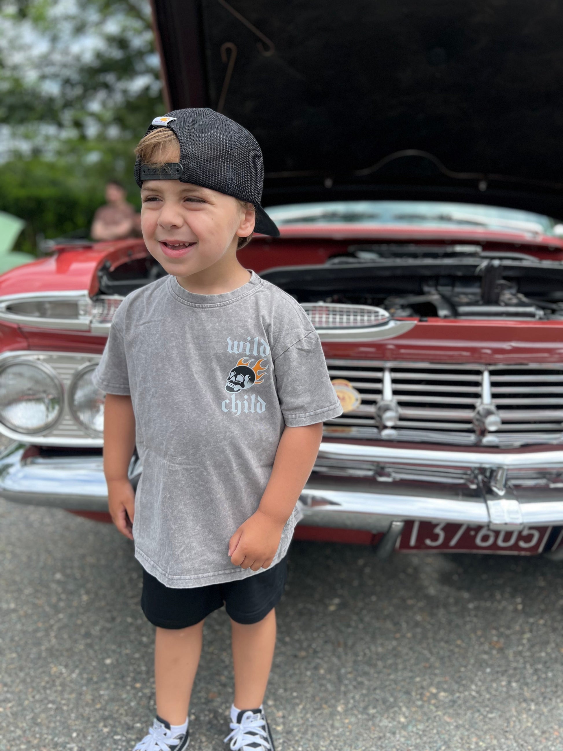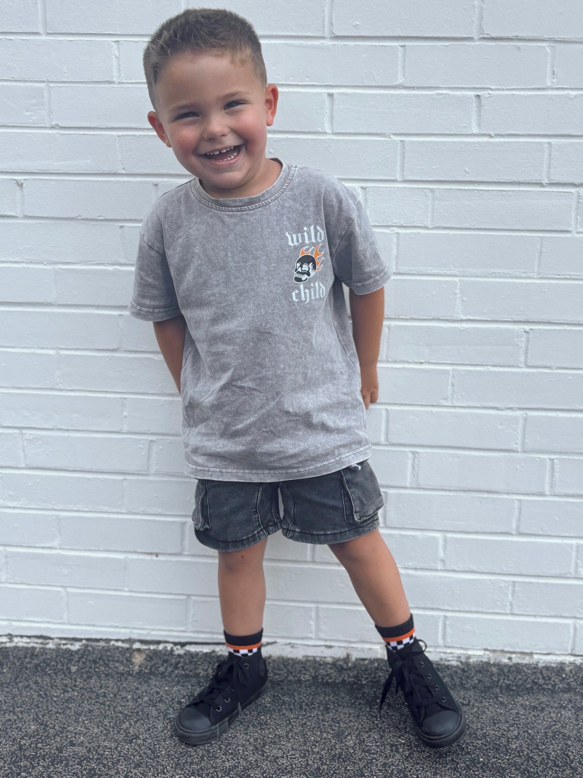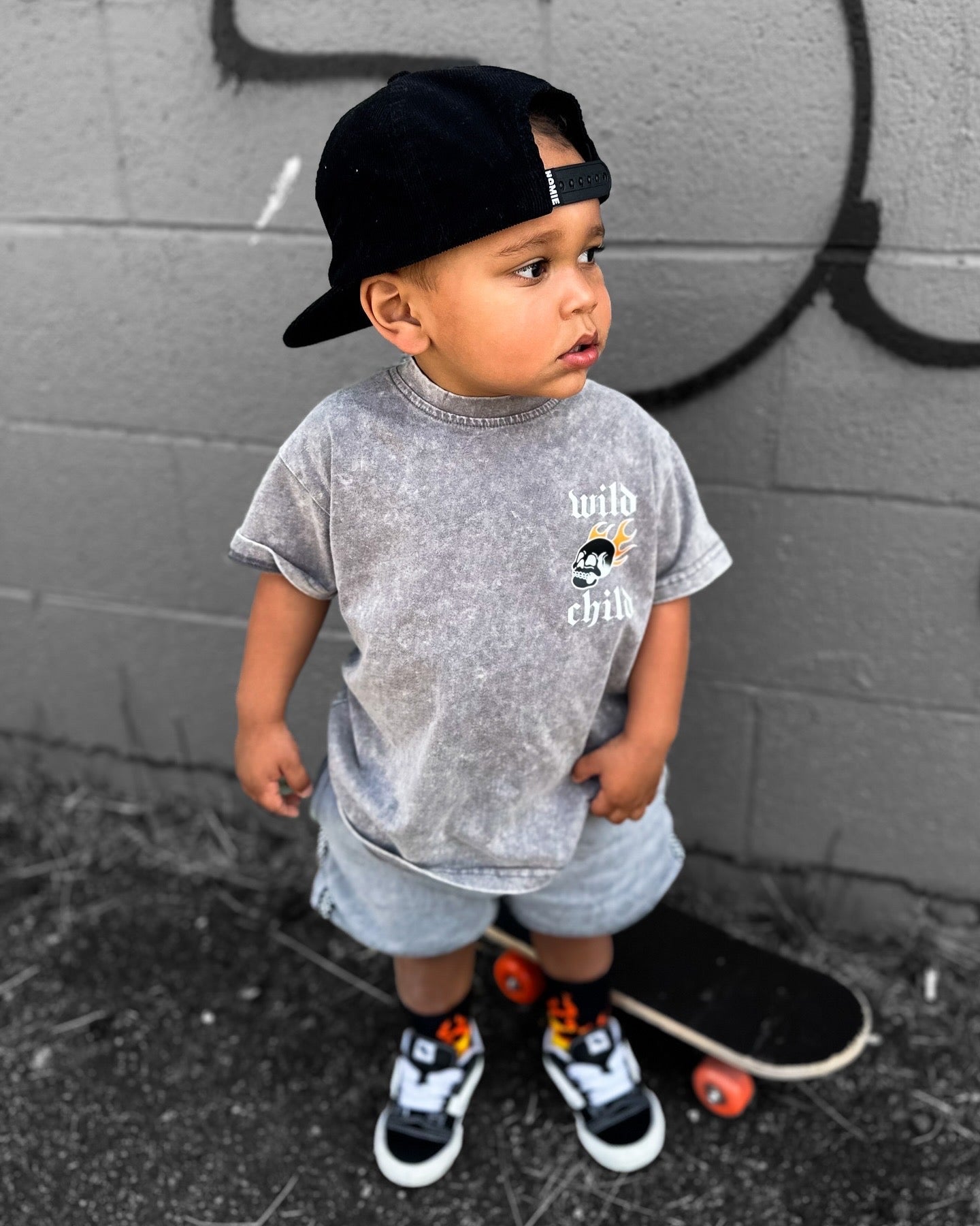 Be the coolest kid in the block with our Grey Acid Wash Logo Tee! Featuring our iconic Burning Skull logo on a perfectly acid washed tee, you'll stand out in style. Join the trend and rock this tee today!